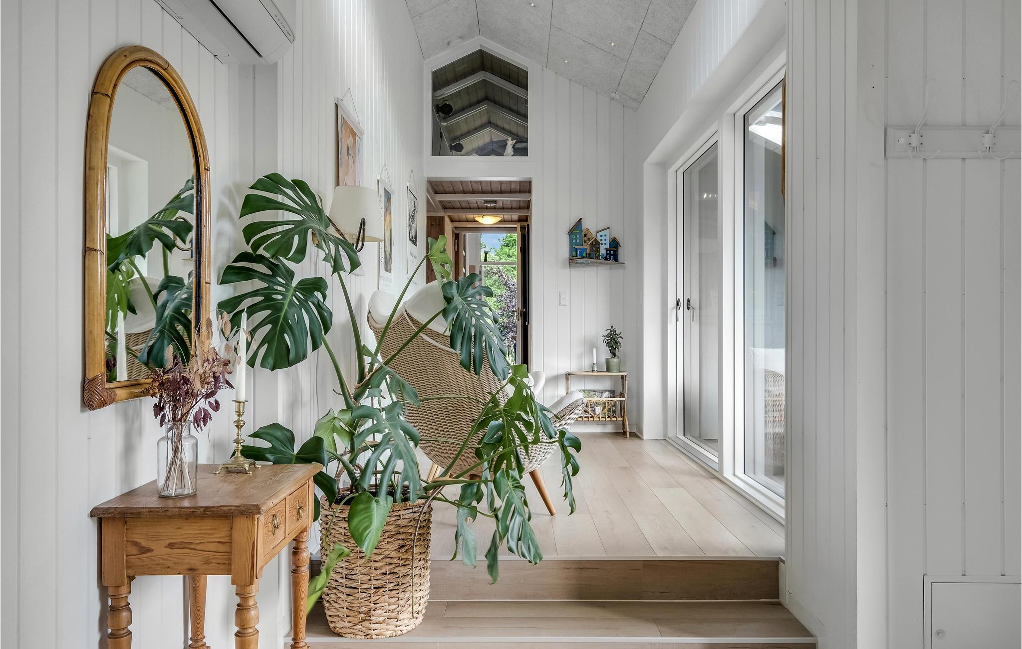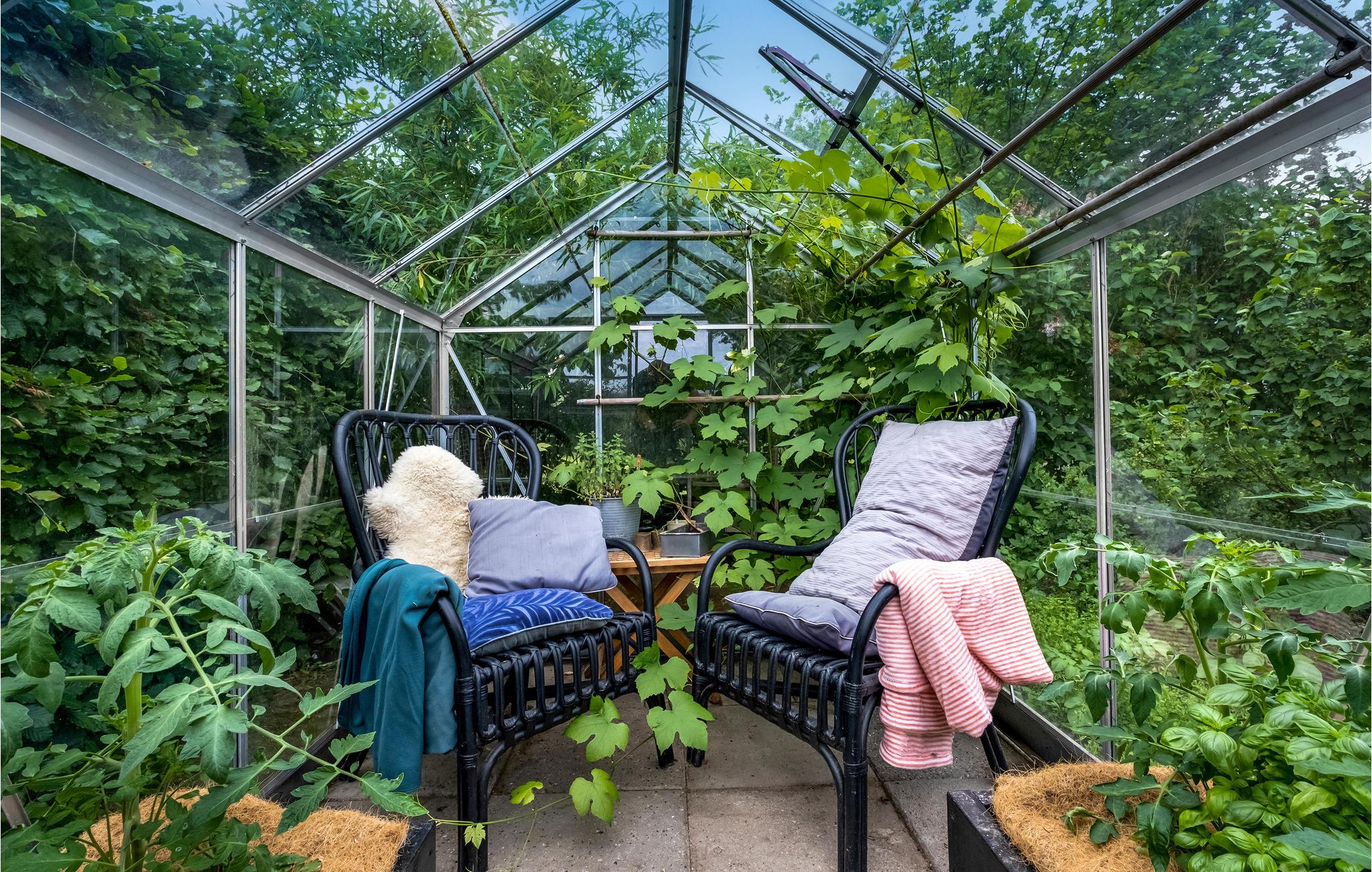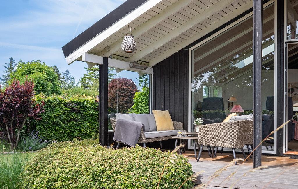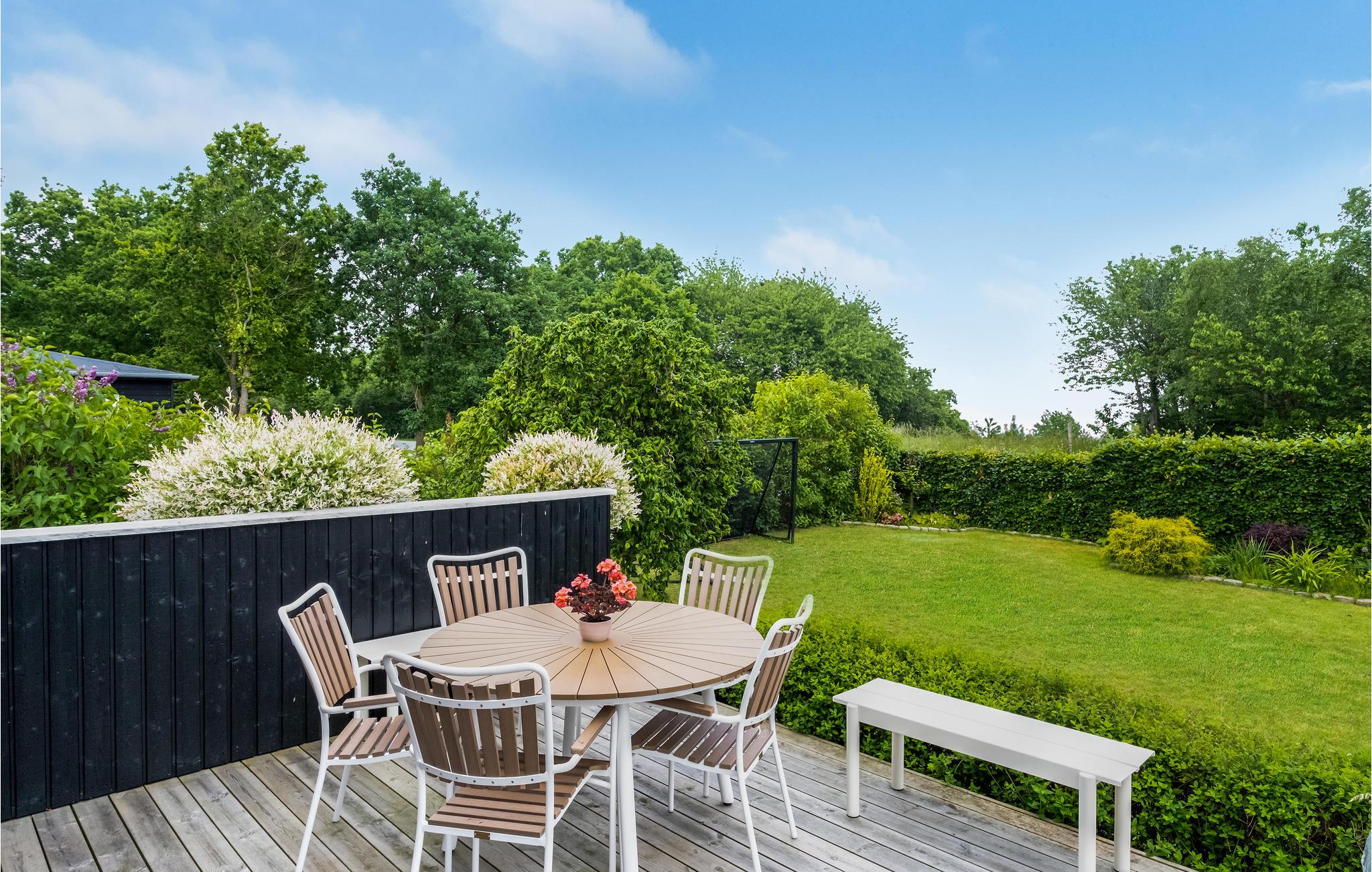Udenfor finder I en terrasse med loungemøbler, hvor I virkelig kan nyde sommervejret. I den velholdte have er der flere hyggelige hjørner og masser af plads til at børnene kan lege. Nyd den idylliske aftenstemning ved havebordet eller i det charmerende drivhus og lad dagen få en skøn afslutning.