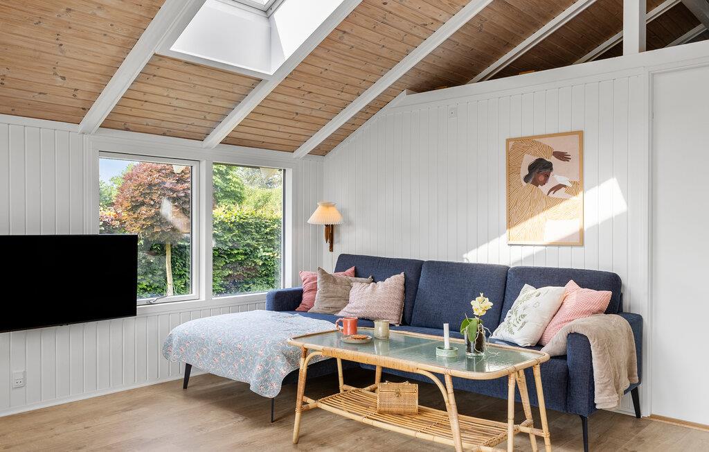 Charmerende, lyst sommerhus med brændeovn og privat have, kun 125 m fra den børnevenlige sandstrand.
