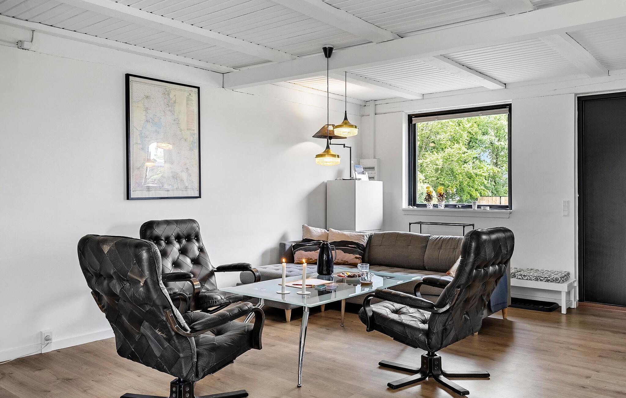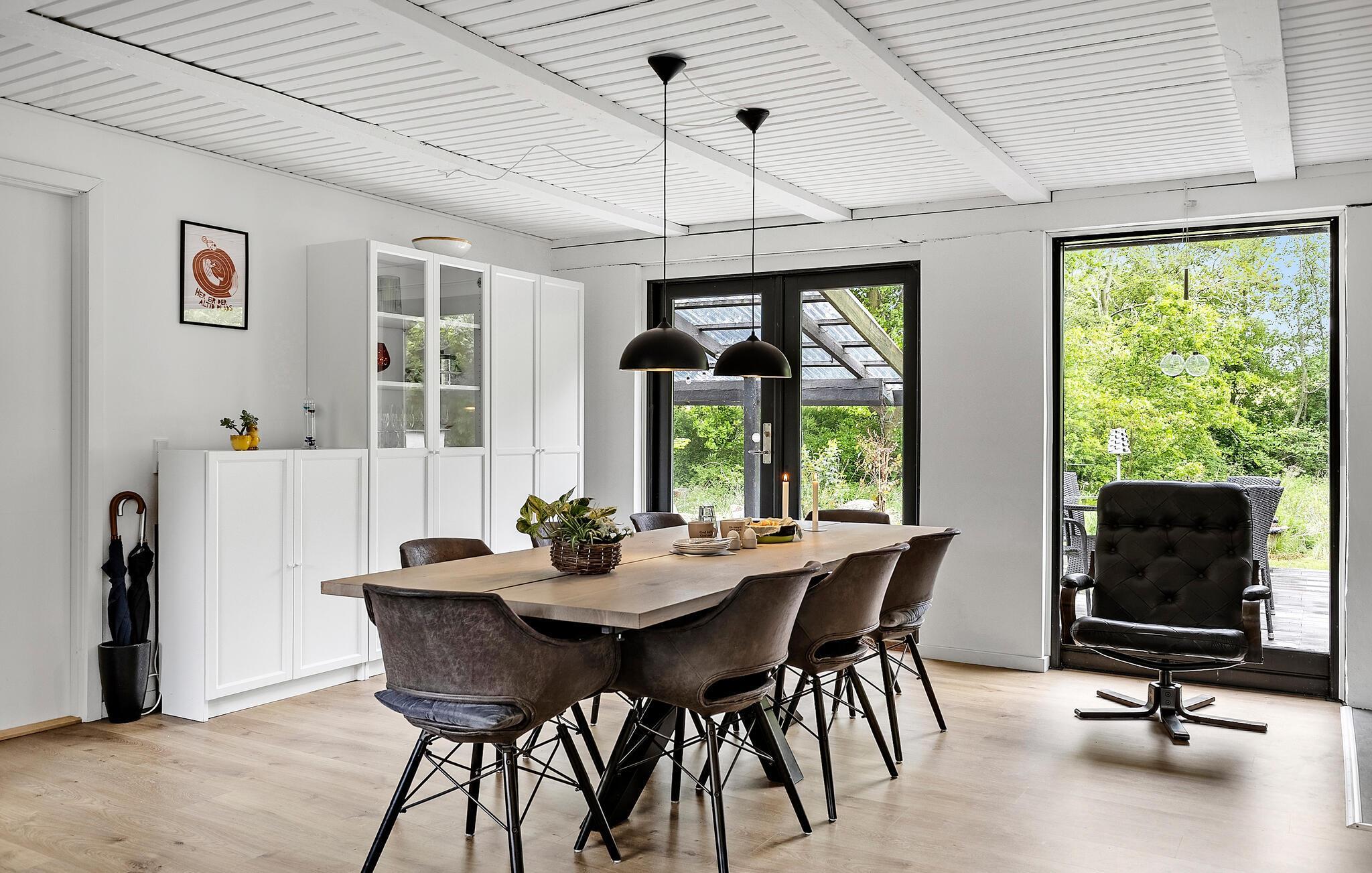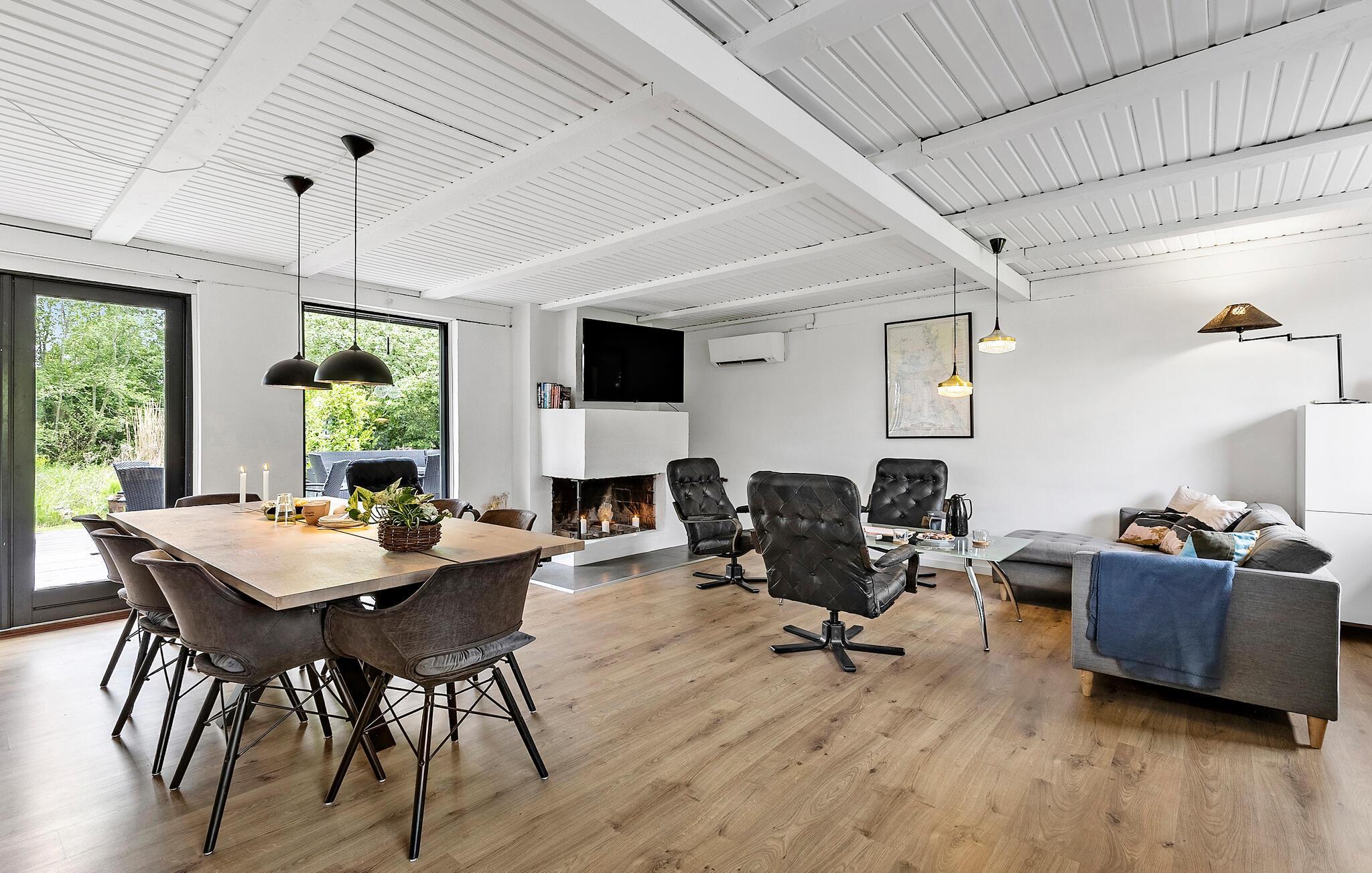 Dette lyse og rummelige sommerhus forkæler jer med stilfuldt møblerede interiører og smuk udsigt over det omkringliggende landskab. Glæd jer til at lave mad i det indbydende køkken og nyde stemningsfulde måltider ved det varmt oplyste spisebord. Gør jer komfortable i de hyggelige lænestole eller sofaen, giv jer tid til en god snak over et glas vin eller nyd et spændende brætspil, mens brændeovnen knitrer sagte.