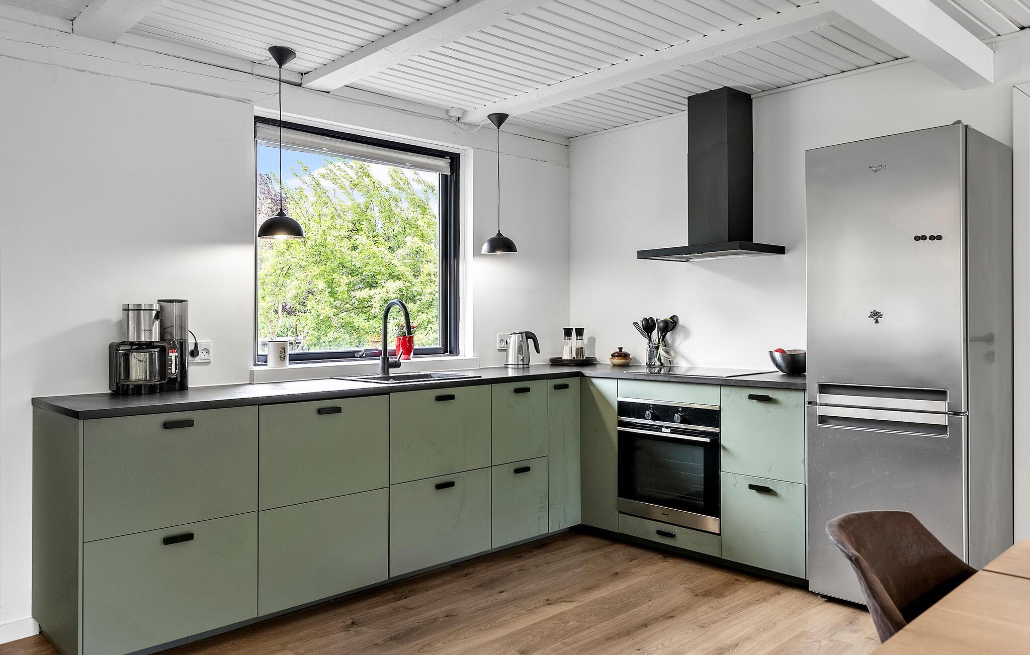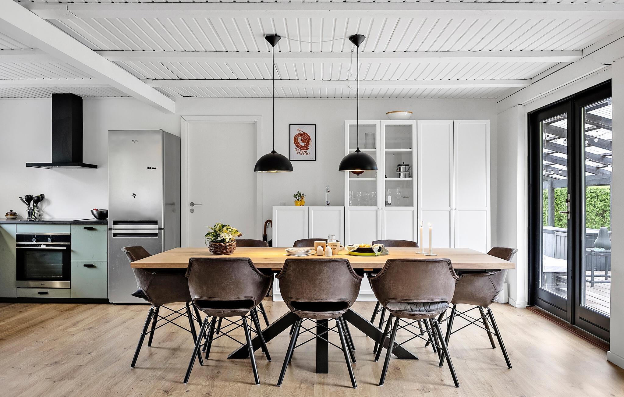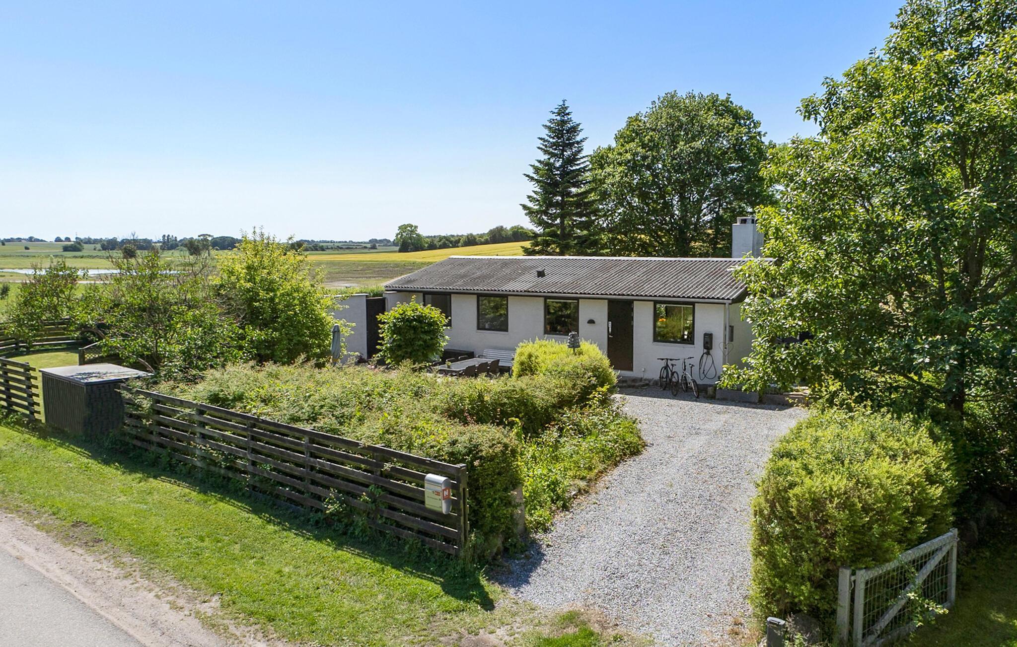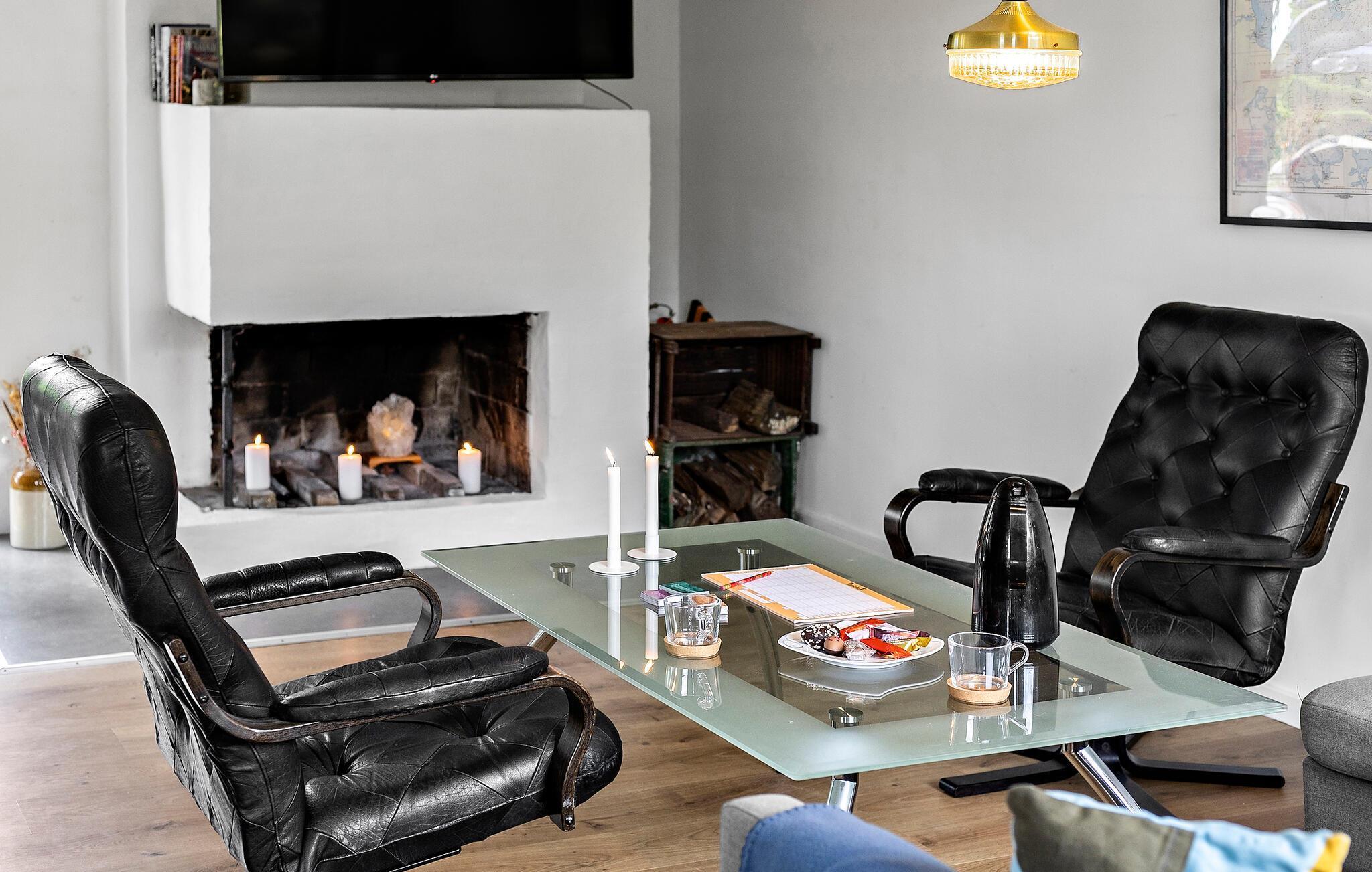 Dette lyse og rummelige sommerhus forkæler jer med stilfuldt møblerede interiører og smuk udsigt over det omkringliggende landskab. Glæd jer til at lave mad i det indbydende køkken og nyde stemningsfulde måltider ved det varmt oplyste spisebord. Gør jer komfortable i de hyggelige lænestole eller sofaen, giv jer tid til en god snak over et glas vin eller nyd et spændende brætspil, mens brændeovnen knitrer sagte.