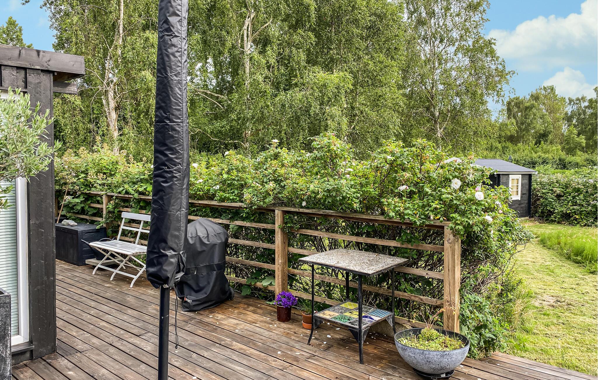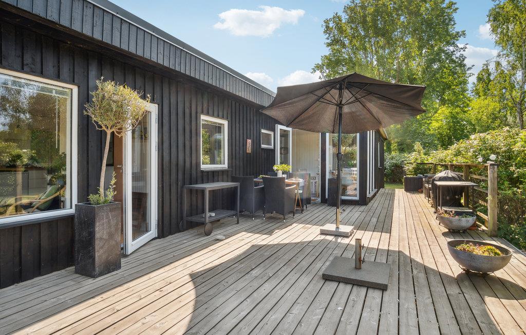 Lyst feriehus nær Saltbæk Strand med stor terrasse, brændeovn og smuk have til afslapning og naturoplevelser.