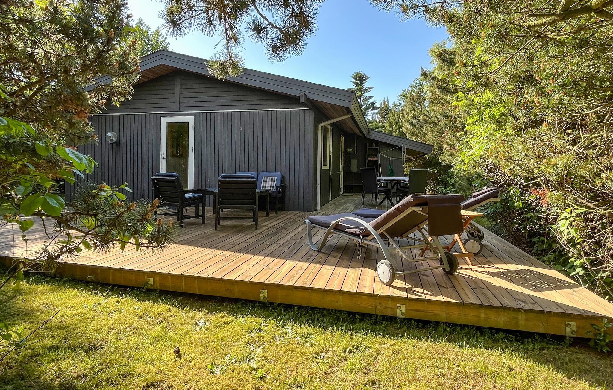 Stilfuldt feriehus nær Saltbæk Strand med åben terrasse, brændeovn og havemøbler til en afslappende ferie.