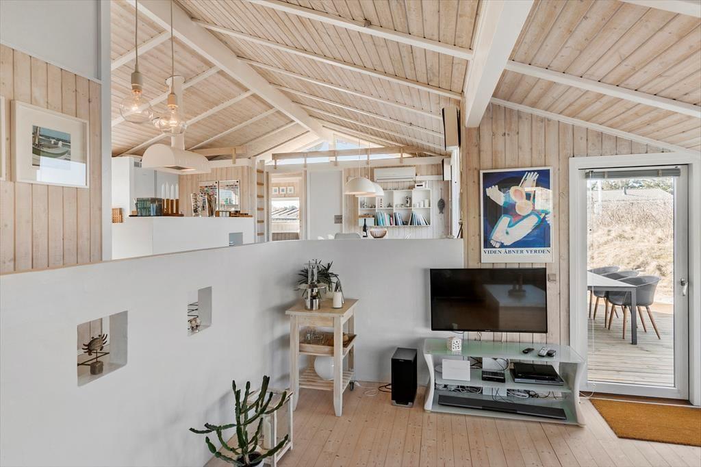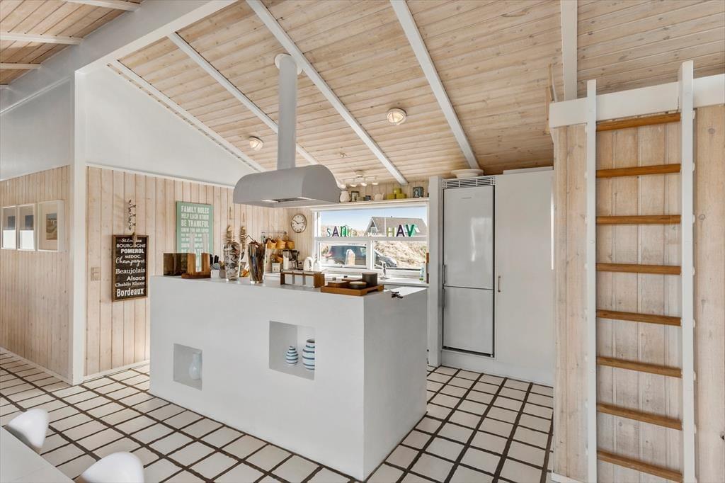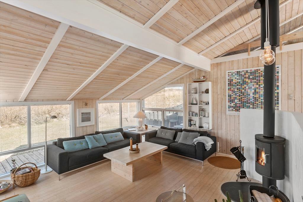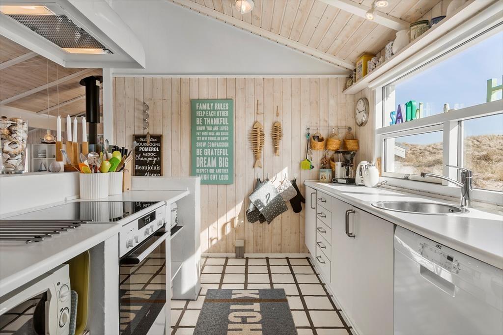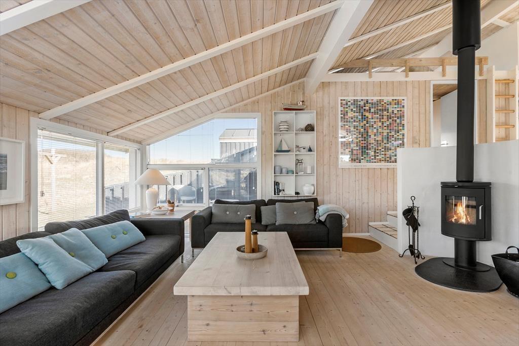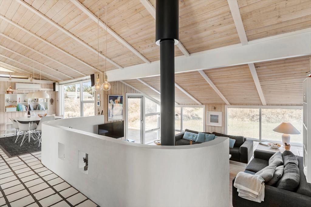 Når du træder indenfor i sommerhuset, bliver du mødt af et moderne og stilrent interiør, hvor hver eneste detalje er valgt med omtanke. De lyse farver og det åbne rum giver en luftig og behagelig følelse, som gør det let at slappe af og nyde ferien. Den rummelige opholdsstue er perfekt til hyggelige stunder – her kan du samles med dine nærmeste foran brændeovnen eller slappe af med en god bog i den komfortable sofa. Køkkenet er både funktionelt og flot indrettet, og her kan du nemt lave måltider, som kan nydes i det store spiseområde. De flotte soveværelser er stilfuldt indrettet og giver dig den perfekte base til at lade op efter en lang dag ved stranden.