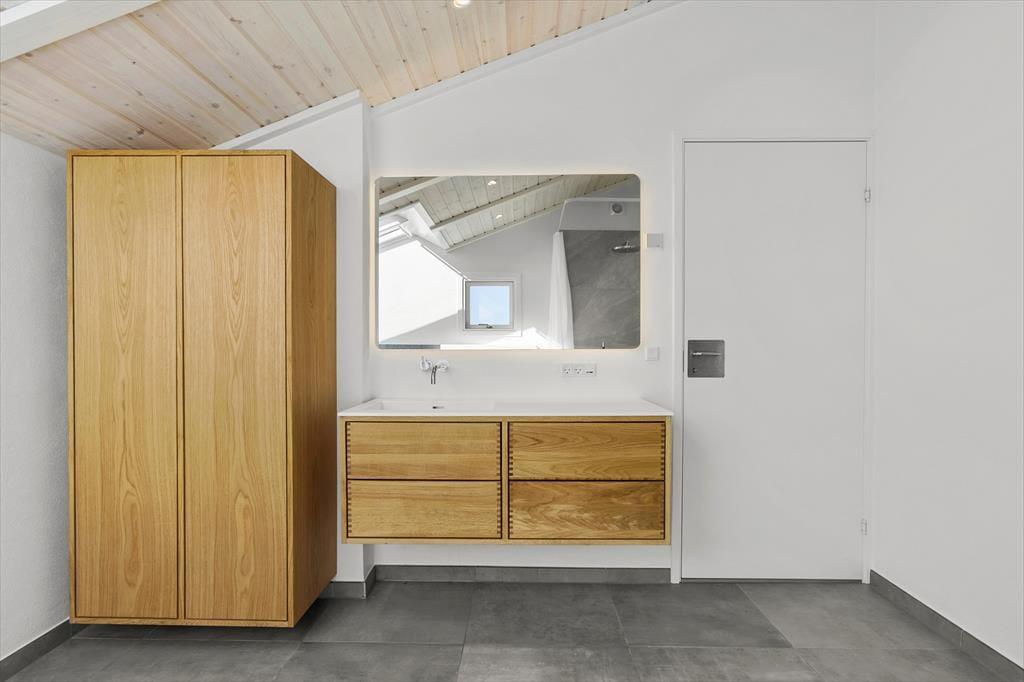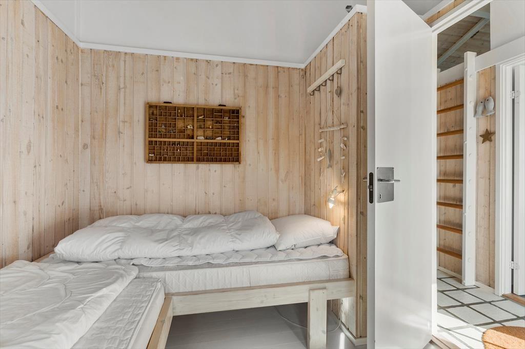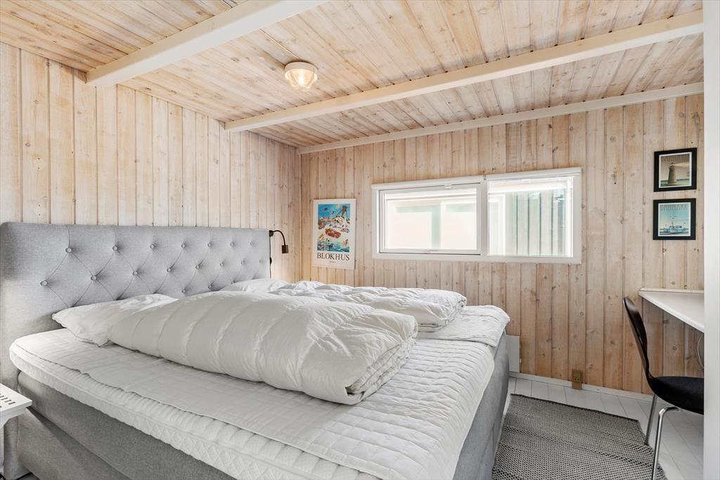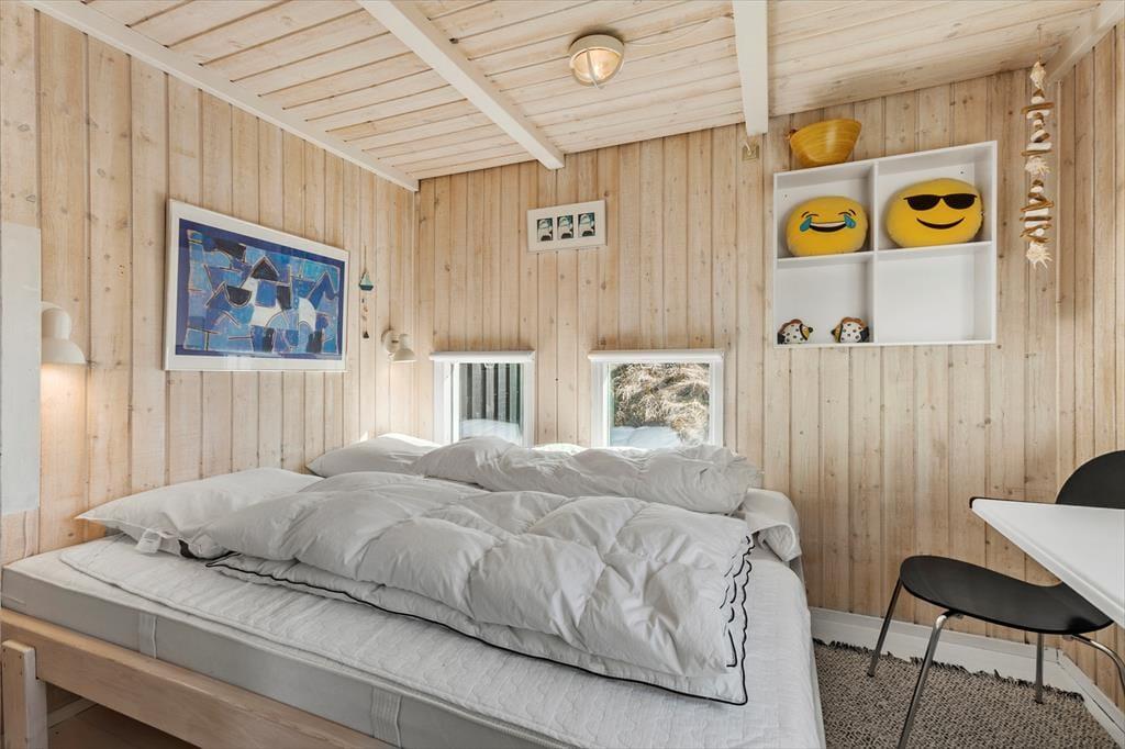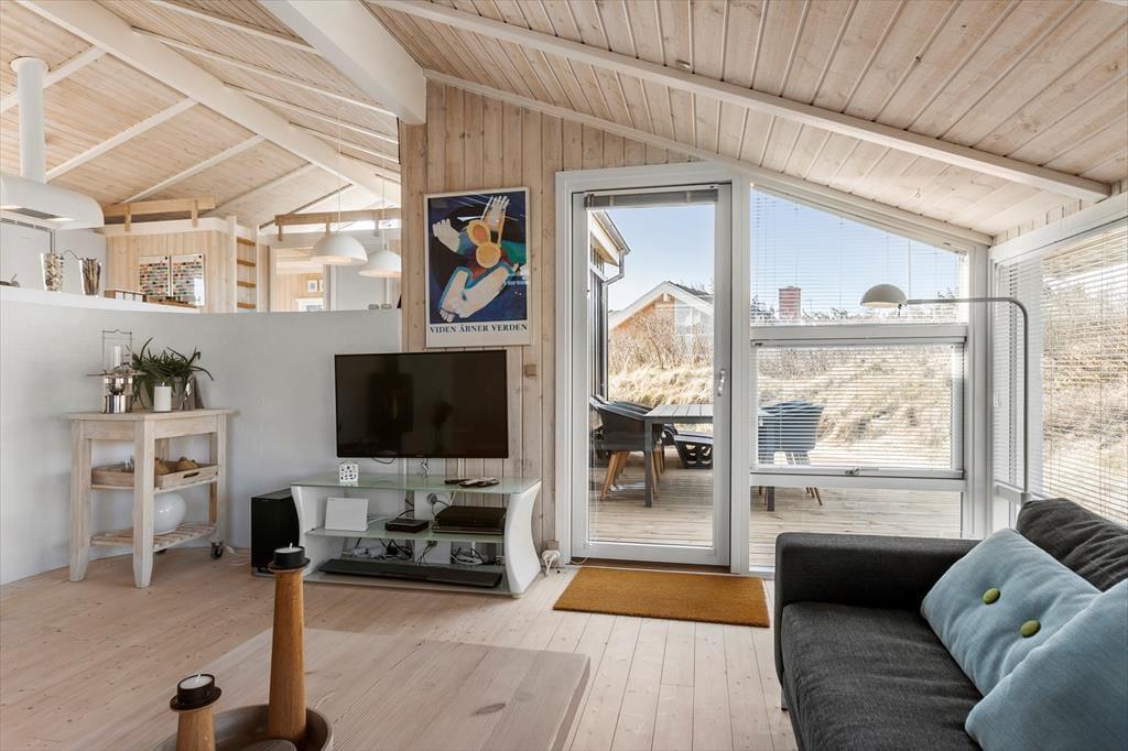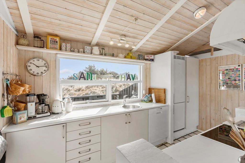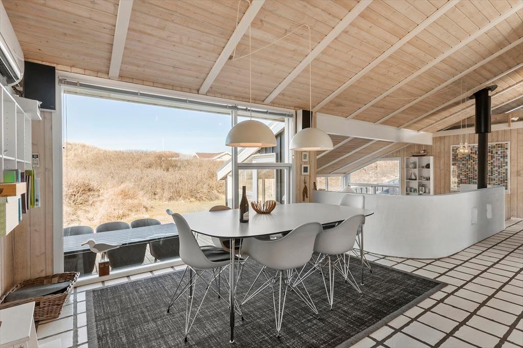 Når du træder indenfor i sommerhuset, bliver du mødt af et moderne og stilrent interiør, hvor hver eneste detalje er valgt med omtanke. De lyse farver og det åbne rum giver en luftig og behagelig følelse, som gør det let at slappe af og nyde ferien. Den rummelige opholdsstue er perfekt til hyggelige stunder – her kan du samles med dine nærmeste foran brændeovnen eller slappe af med en god bog i den komfortable sofa. Køkkenet er både funktionelt og flot indrettet, og her kan du nemt lave måltider, som kan nydes i det store spiseområde. De flotte soveværelser er stilfuldt indrettet og giver dig den perfekte base til at lade op efter en lang dag ved stranden.