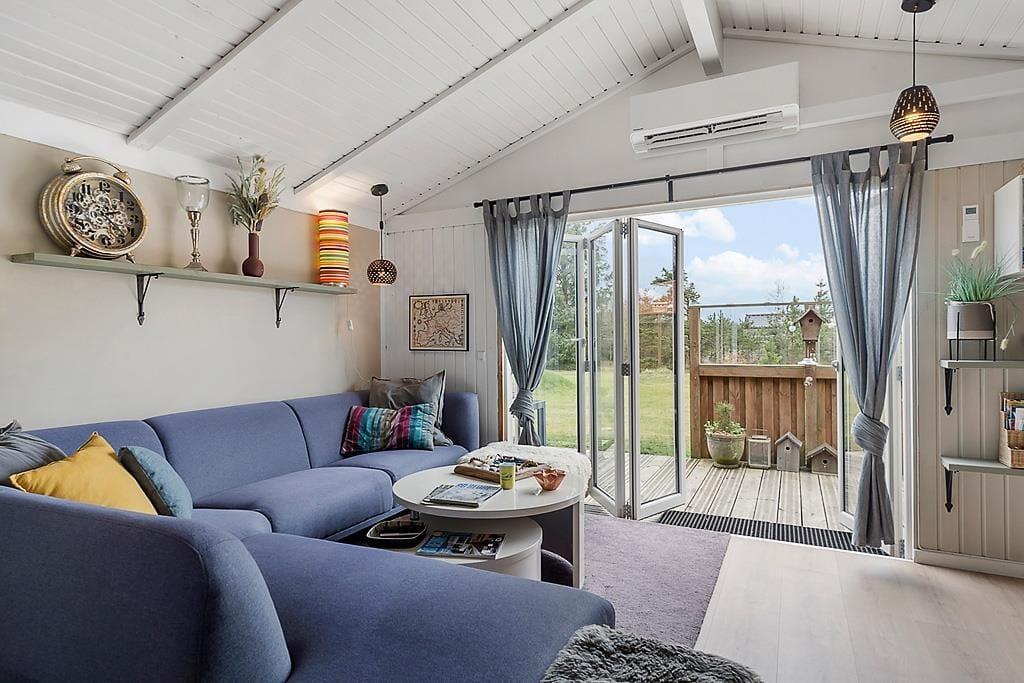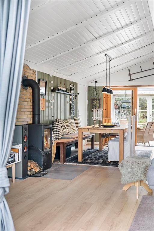 Når du træder indenfor i sommerhuset, mødes du af en lys og rummelig indretning, der indbyder til både hygge og samvær. Den åbne stue med brændeovn skaber en varm og hyggelig atmosfære, hvor du kan slappe af med en god bog eller se en film efter en aktiv dag i naturen. Den dejlige udestue fungerer som et ekstra opholdsrum og er perfekt til afslapning, uanset om du vil nyde en morgenkaffe, læse eller blot kigge ud på den store grund. Køkkenet er funktionelt og nemt at arbejde i, så feriemiddage kan tilberedes og nydes i det gode selskab.