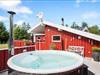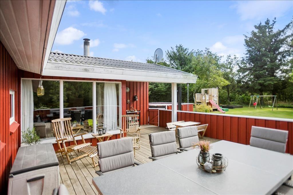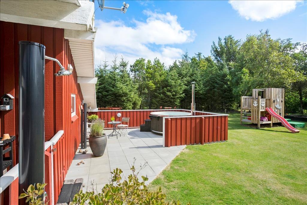 Udenfor venter et skønt terrasseområde, der strækker sig omkring sommerhuset og giver mulighed for både afslapning i solen og beskyttelse mod vinden. På den store grund er der masser af plads til leg, afslapning eller en god middag på terrassen, mens solen går ned. Det er her, du kan udnytte luksusfaciliteterne som vildmarksbadet, hvor du kan varme dig op efter en tur i den friske luft, eller måske nyde natten under stjernerne. Der er også et shelter på grunden, som giver dig en unik mulighed for at overnatte under åben himmel og mærke naturens ro på tæt hold.
