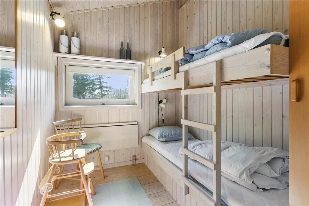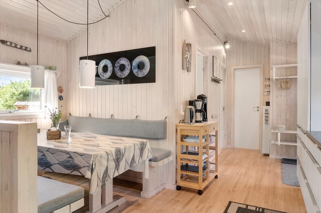 Indenfor præsenterer sommerhuset sig lyst og lækkert, med store vinduer, der giver et flot lysindfald og inviterer naturen indenfor. Stuen er både rummelig og hyggelig med en moderne indretning, som gør det til et oplagt samlingspunkt for hele familien. Her kan I nyde film, spil eller simpelthen slappe af ved brændeovnen efter en dag i naturen. Det åbne køkken giver jer mulighed for at kokkerere sammen, og når dagens måltider er overstået, er der masser af plads til at slappe af og nyde feriens ro.