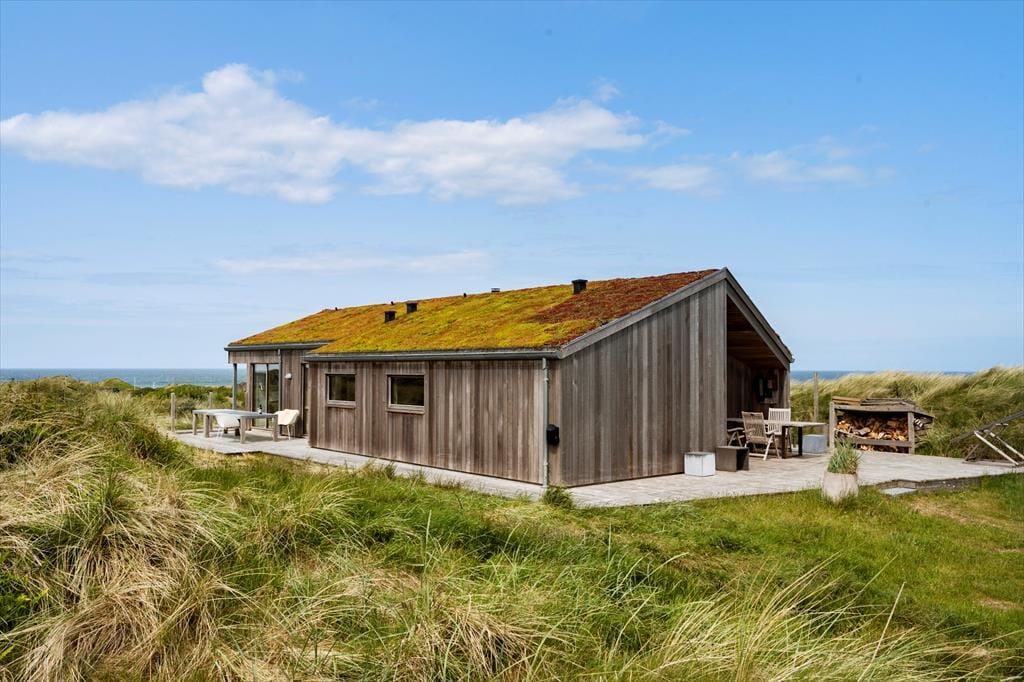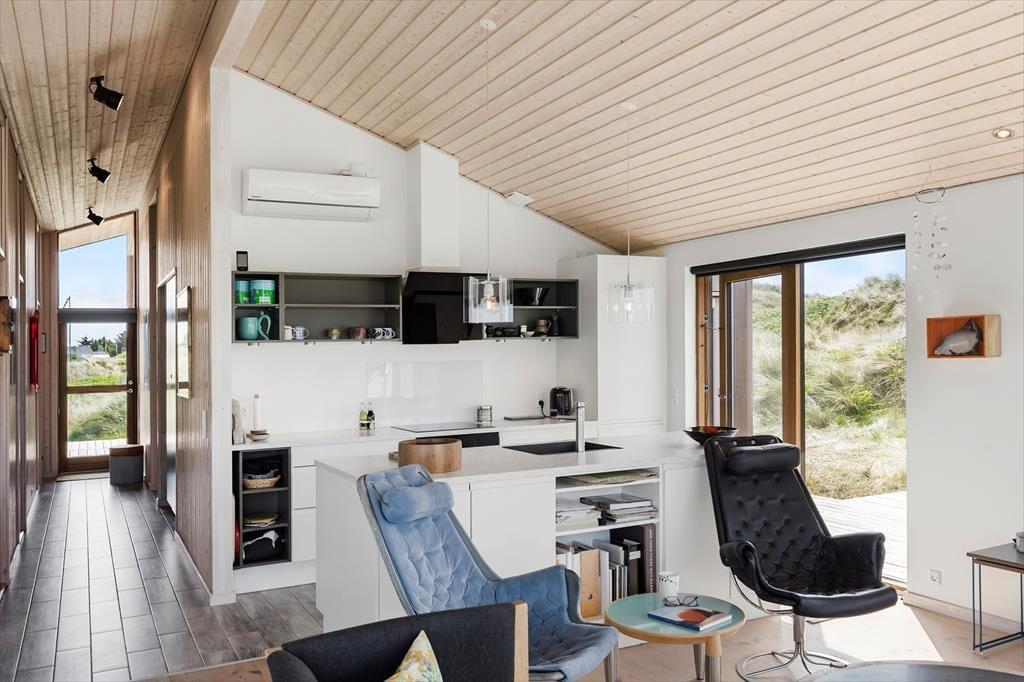 Om sommeren bliver udelivet næsten en naturlig forlængelse af huset, for fra både stuen og alrummet er der direkte udgang til terrassen, hvor du kan sidde med fødderne oppe og nyde den friske havluft. Terrassen mod vest indbyder til solbadning, hyggelige måltider under åben himmel og lange, rolige aftener med udsigt til solnedgangen over klitterne. Rundt om huset er der flere kroge med både læ og sol – og med en placering højt i landskabet får du en fornemmelse af at være helt tæt på himmel og hav. Tænd op i grillen, find tæpperne frem, og lad dagen gå på hæld i selskab med dem, du holder af.