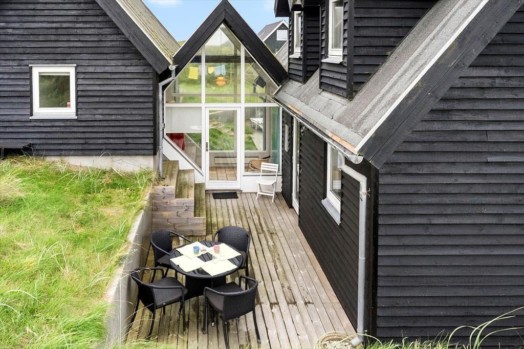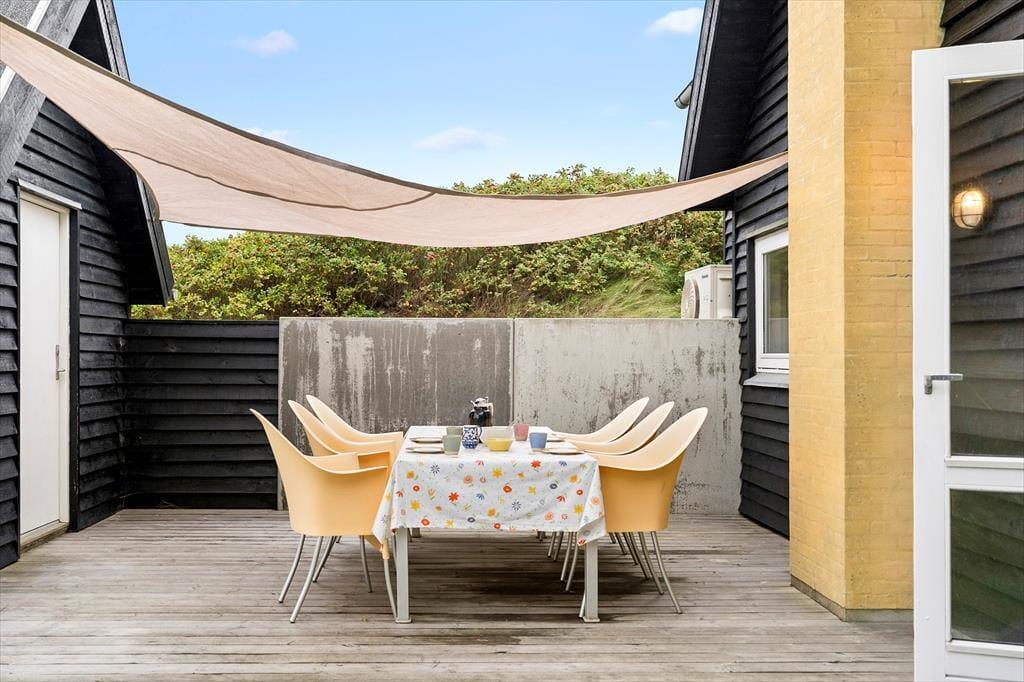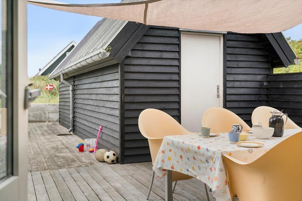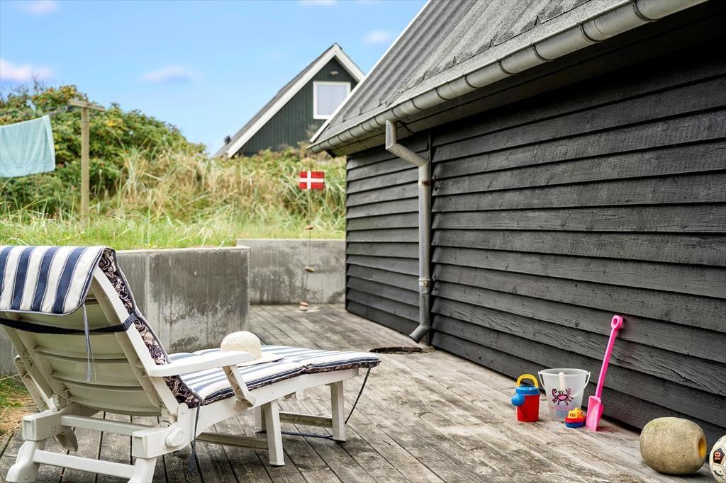 Sommerhuset har flere terrasser, som giver dig mulighed for at finde både sol og skygge i løbet af dagen. Måske starter du dagen på den østvendte terrasse med en dampende kop kaffe, mens solen langsomt stiger op over klitterne. Senere kan du søge mod den syd- eller vestvendte terrasse, hvor du kan nyde eftermiddagens sol, en kølig drink eller en hyggelig grillaften med familien. Haven er omkranset af træer og buske, som skaber en fredfyldt atmosfære – her kan børnene lege trygt, mens de voksne slapper af i havemøblerne og mærker roen sænke sig.
