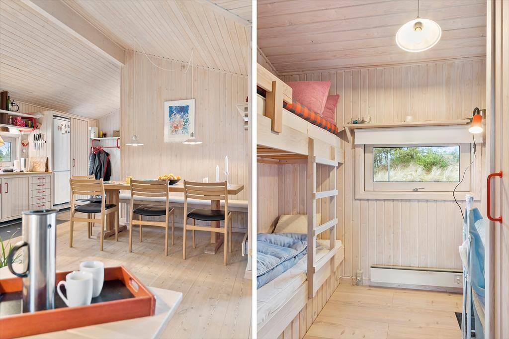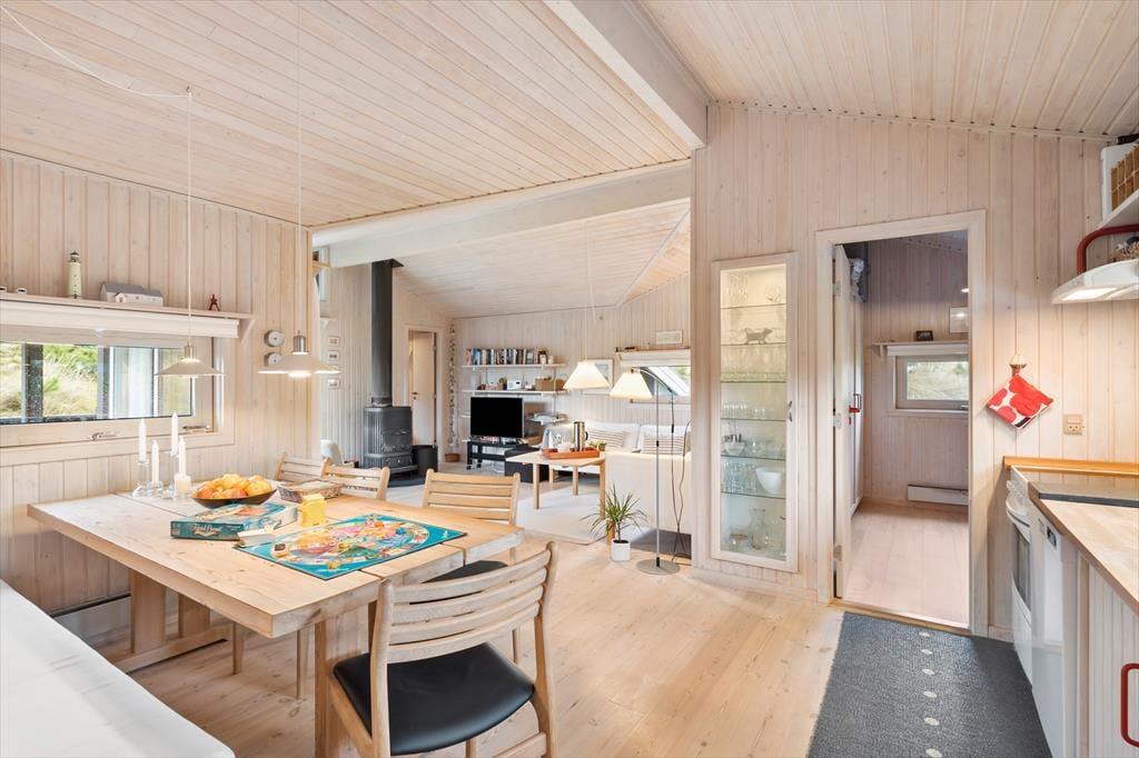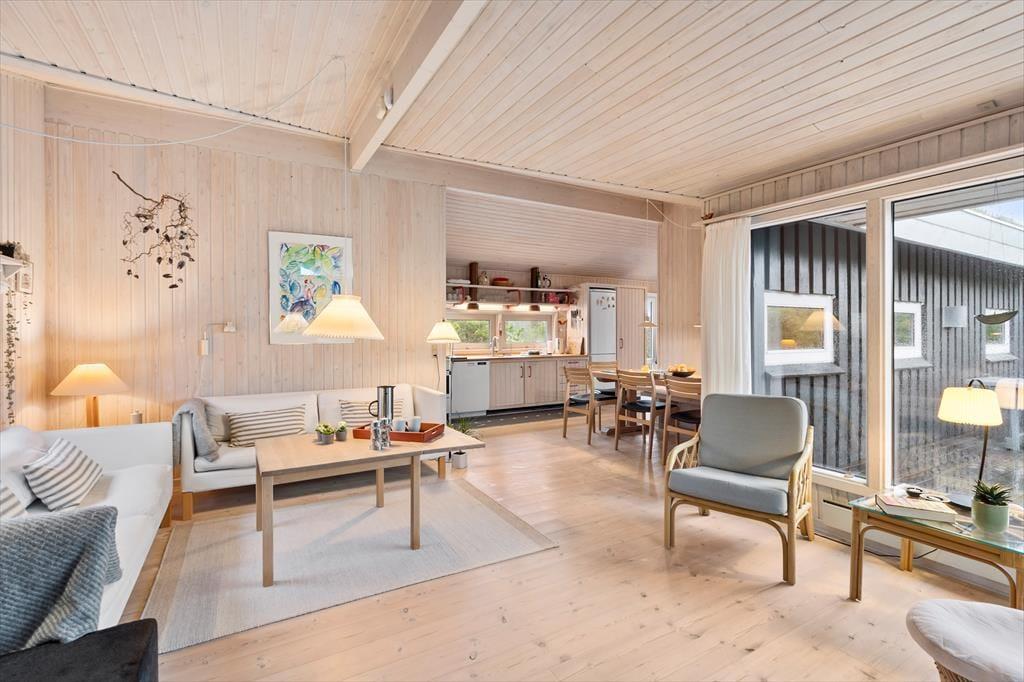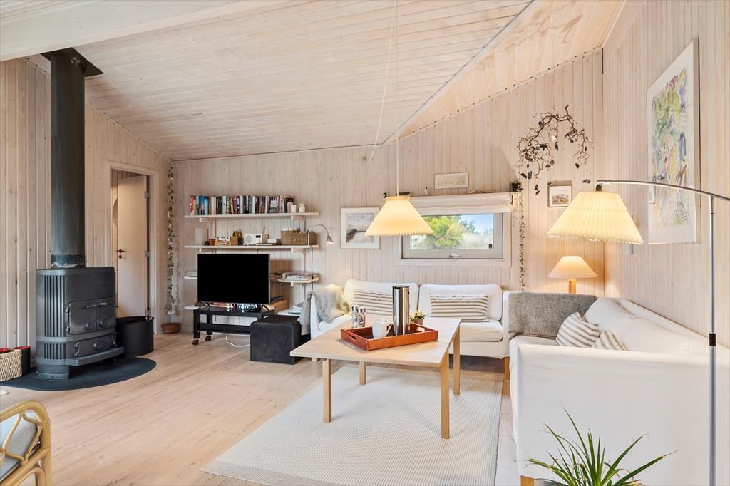 Når du træder indenfor i sommerhuset, mødes du af et lyst og indbydende rum med et fantastisk lysindfald. Stuen er perfekt til hyggelige stunder med familie eller venner, og de store vinduespartier giver dig mulighed for at nyde naturens skønhed selv fra indendørs. Huset byder på en rummelig opholdsstue, hvor I kan samles omkring brændeovnen på kølige aftener, eller måske tage en pause med et spil brætspil. Den åbne planløsning gør det nemt at være sammen, og det funktionelle køkken inviterer til fælles madlavning. Sommerhuset har en god opdeling med flere hyggelige soveværelser, så alle kan få et dejligt og afslappende ophold.
