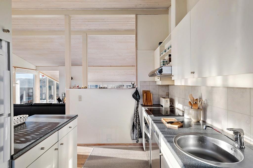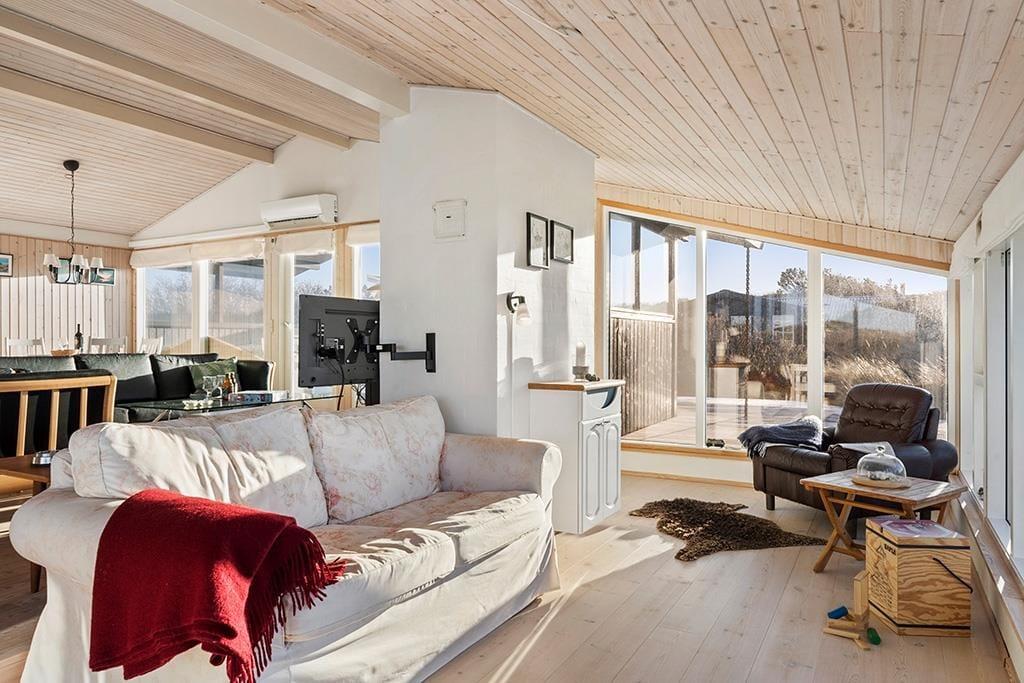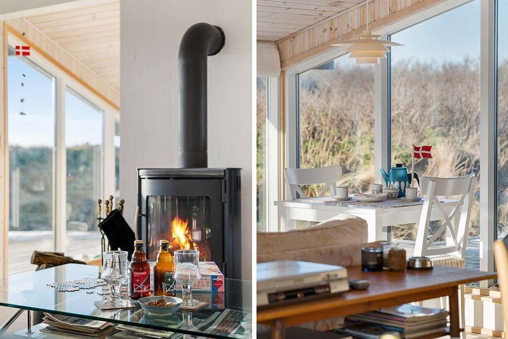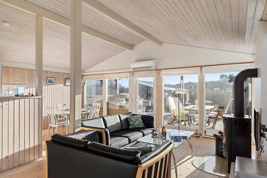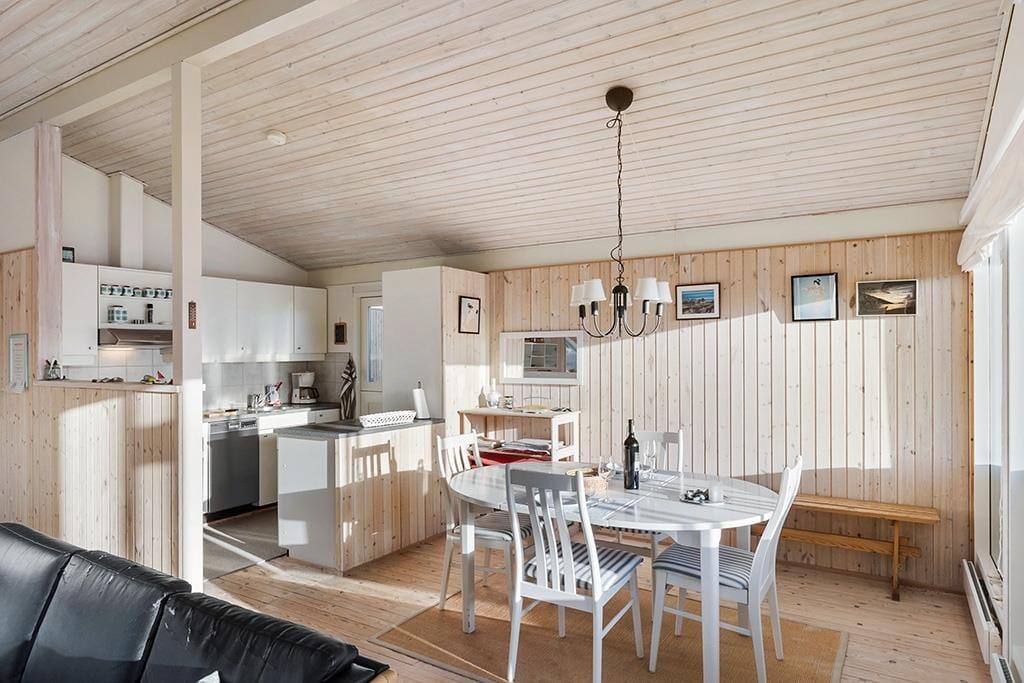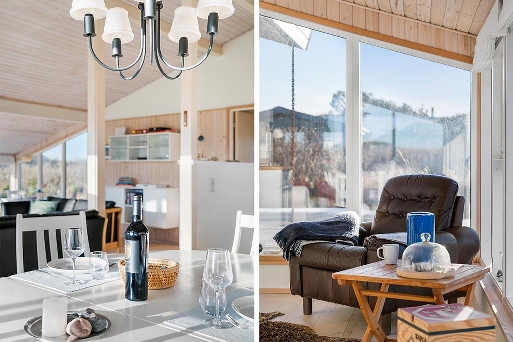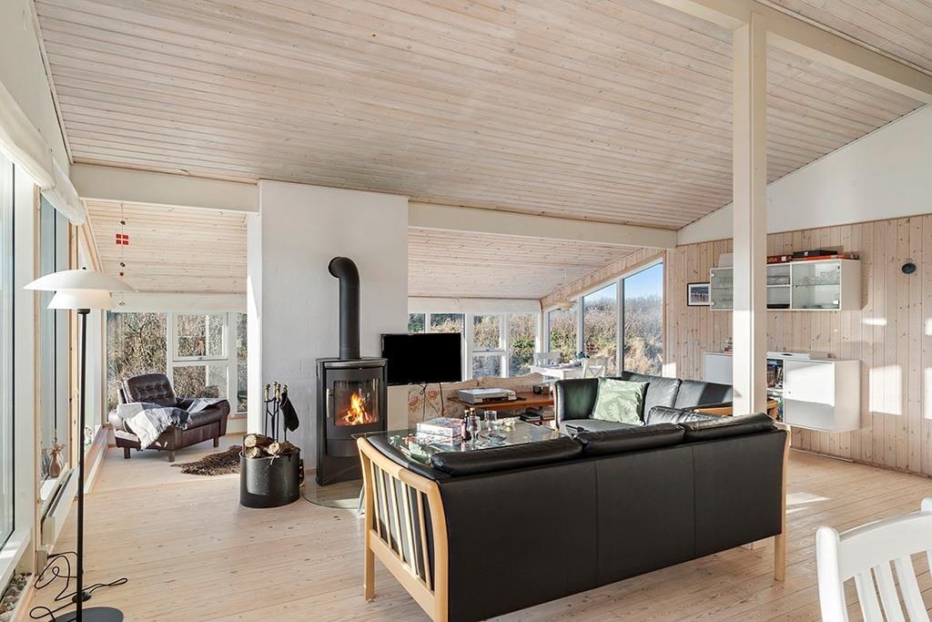 Når du træder indenfor i dette indbydende sommerhus, vil du straks mærke den hjemlige atmosfære, der er skabt med et åbent og lyst opholdsmiljø. De store vinduer, som giver en spektakulær udsigt over det omkringliggende landskab, trækker naturen helt ind i stuen. Her kan du slappe af og nyde livet med udsigt til den vidtstrakte natur, hvor lyden af fuglesang og den friske luft skaber en perfekt ramme for ro og velvære. Det åbne køkken og den rummelige opholdsstue indbyder til fællesskab og hyggelige stunder, hvad enten det er tid til middag, spil eller afslapning foran brændeovnen. Lyset og naturen giver en følelse af at være tættere på naturen, samtidig med at du har alle de moderne bekvemmeligheder lige ved hånden.
