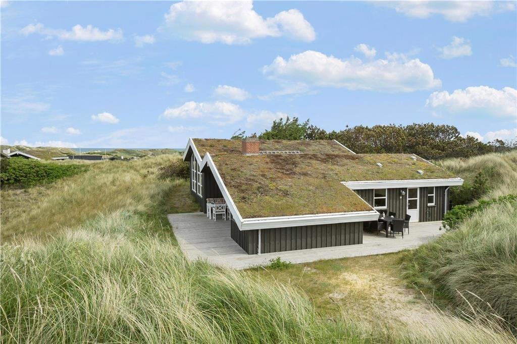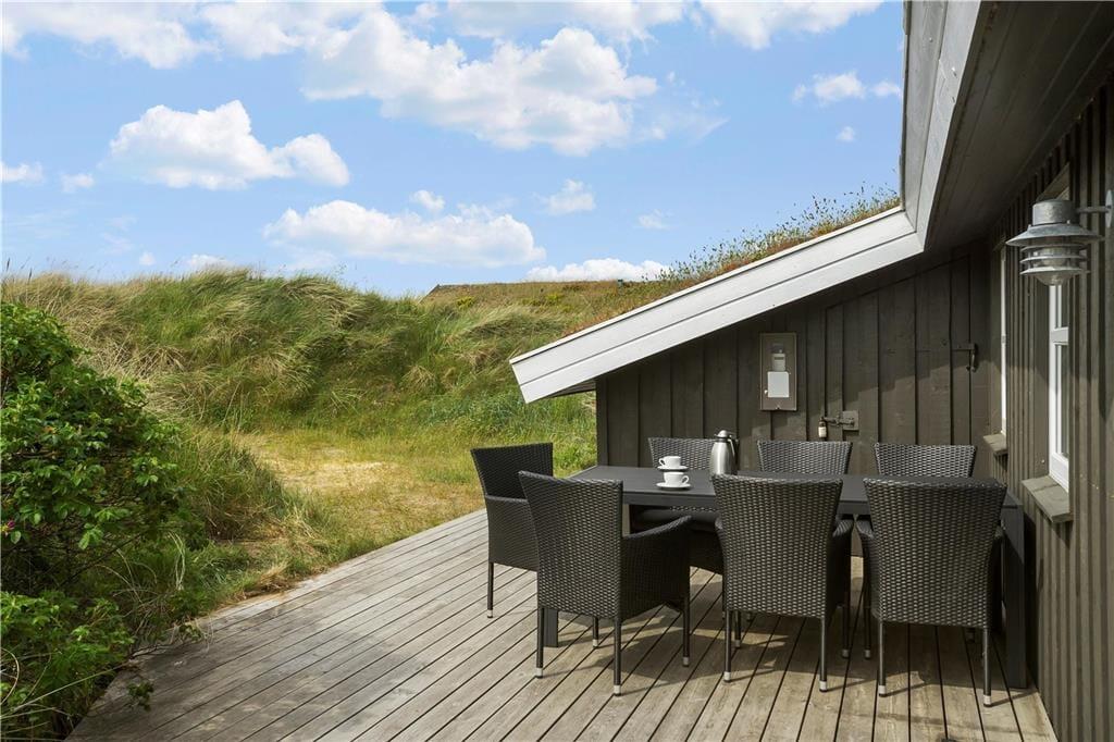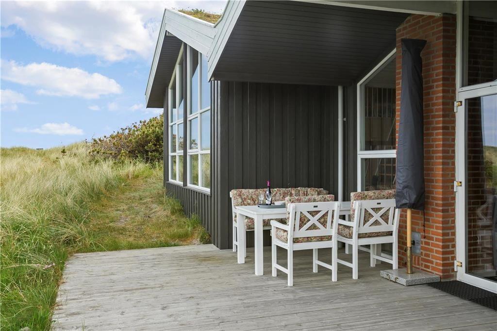 Sommerhusets terrasse fungerer som et ekstra opholdsrum, hvor du kan nyde den friske havluft og den fantastiske udsigt over klitlandskabet. Start dagen med en kop kaffe, mens solen står op over klitterne, eller sæt dig til rette med et glas vin, mens aftenen falder på. På de lune dage kan du tage en afslappende pause i en liggestol, mens du lytter til fuglekvidderet og mærker feriefreden sænke sig.