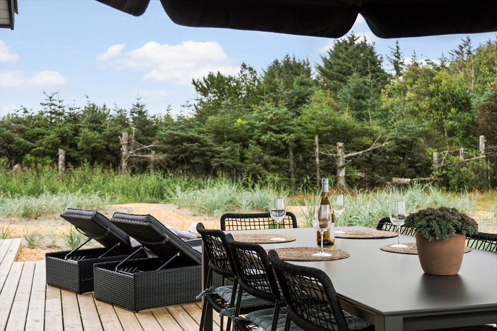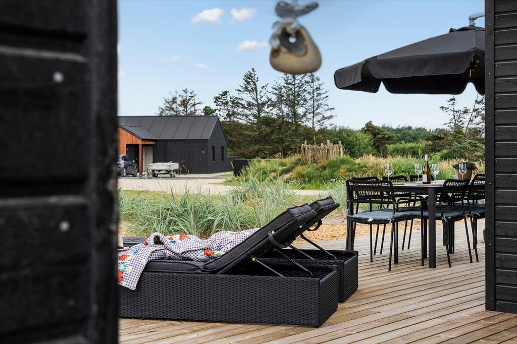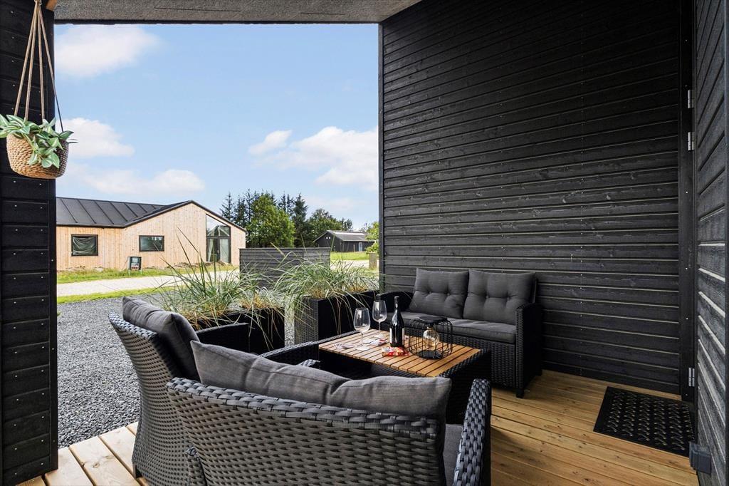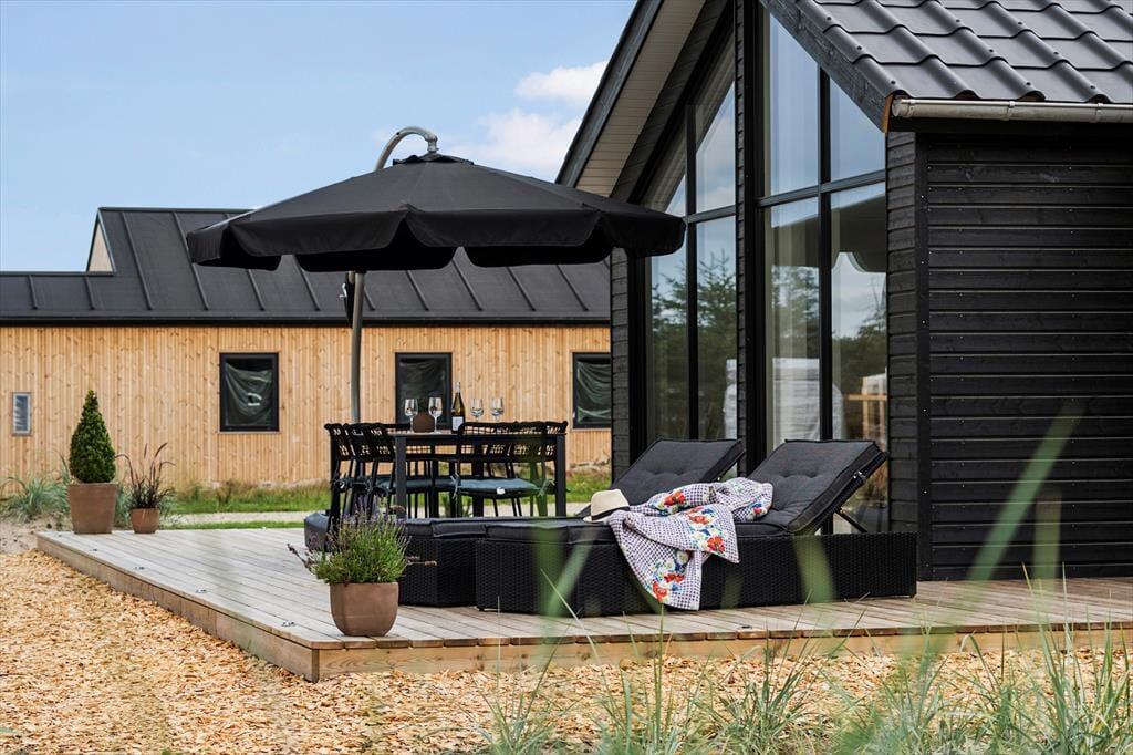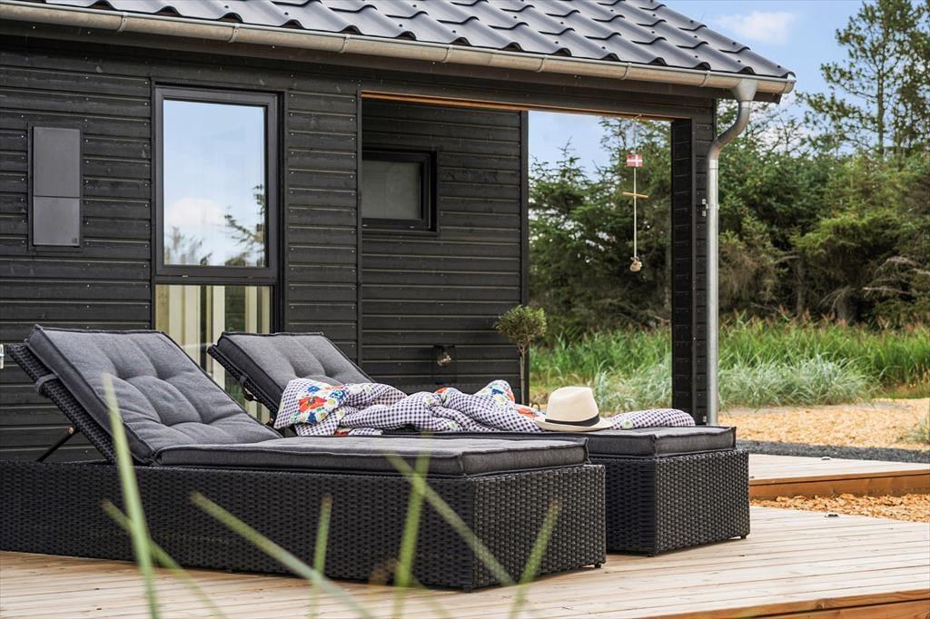 Udendørs venter en stor og flot terrasse, der indbyder til afslapning og hyggelige stunder i solen. Her kan du nyde morgenkaffen i de bløde havemøbler, tage en lur i liggestolen eller samle familien til en lækker grillmiddag under åben himmel. Terrassen er designet med fokus på komfort og æstetik, og de omkringliggende grønne områder skaber en fredelig og privat oase, hvor du kan lade op og nyde ferien i fulde drag.