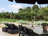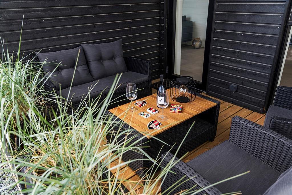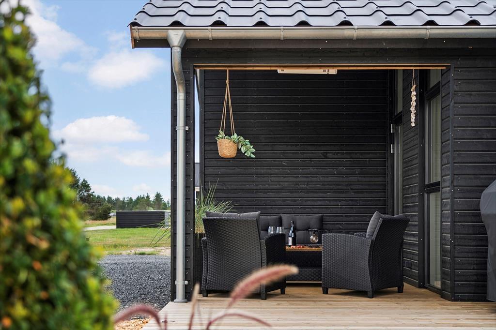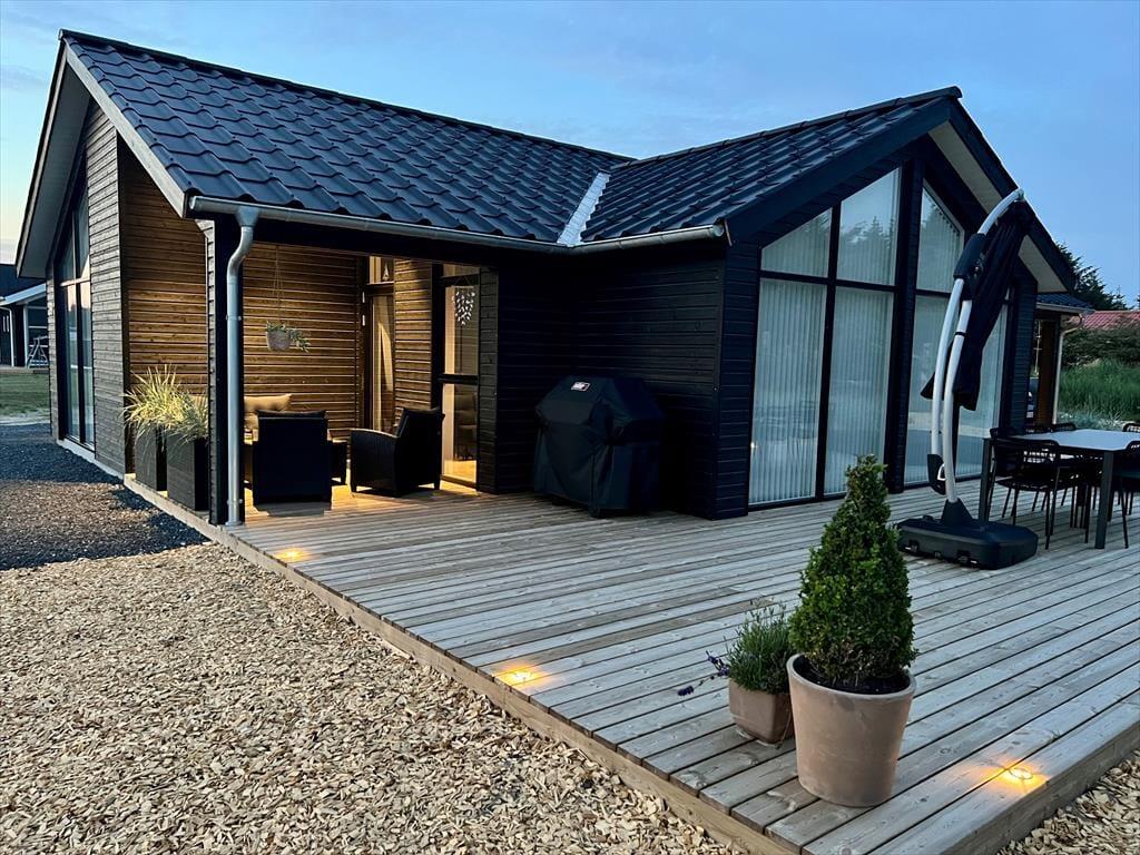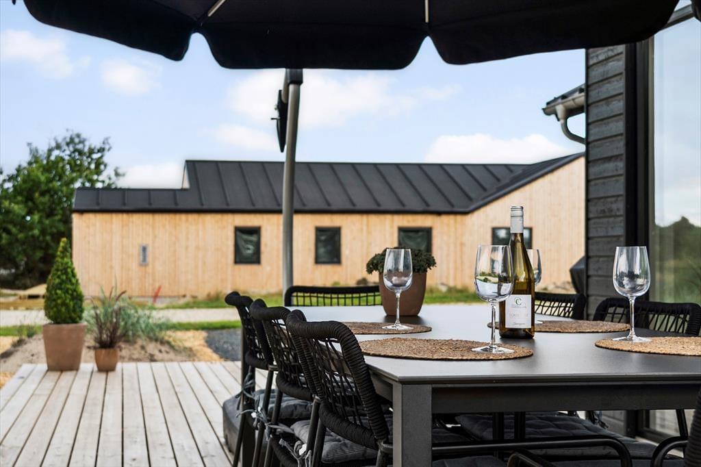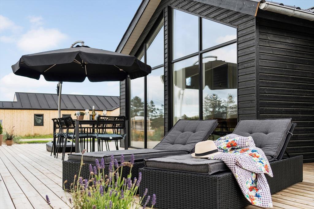 Udendørs venter en stor og flot terrasse, der indbyder til afslapning og hyggelige stunder i solen. Her kan du nyde morgenkaffen i de bløde havemøbler, tage en lur i liggestolen eller samle familien til en lækker grillmiddag under åben himmel. Terrassen er designet med fokus på komfort og æstetik, og de omkringliggende grønne områder skaber en fredelig og privat oase, hvor du kan lade op og nyde ferien i fulde drag.