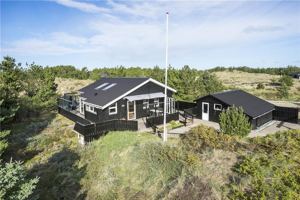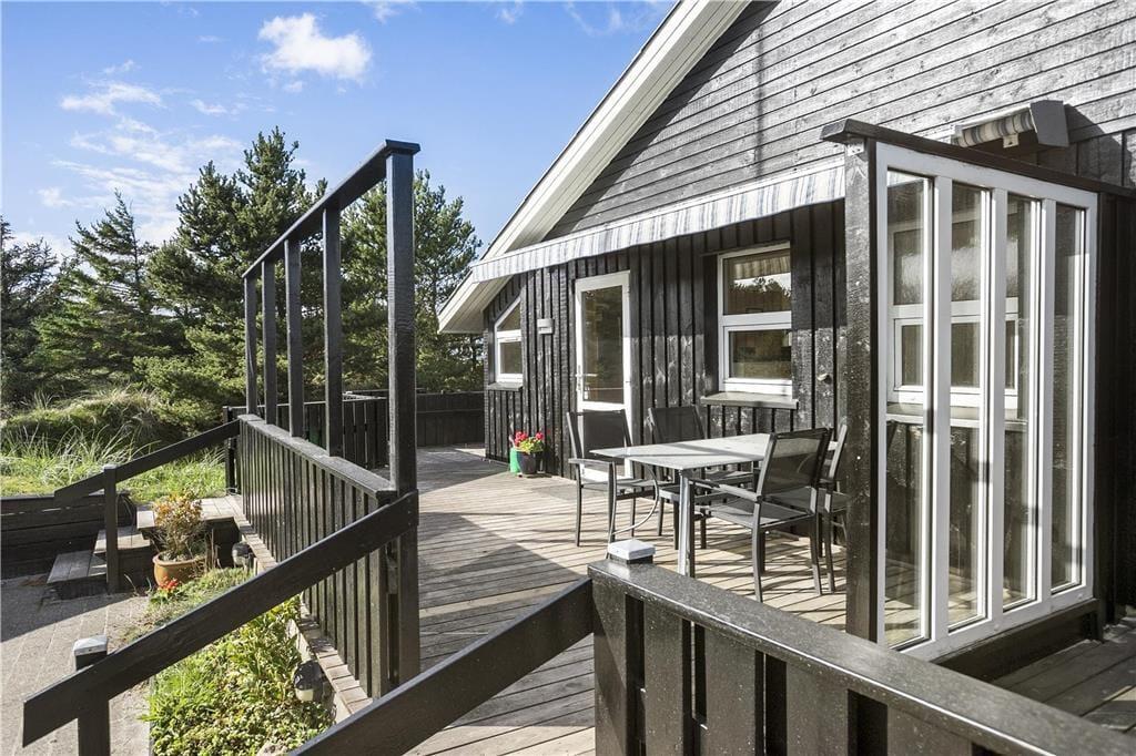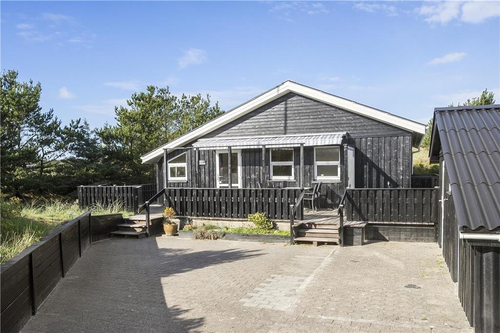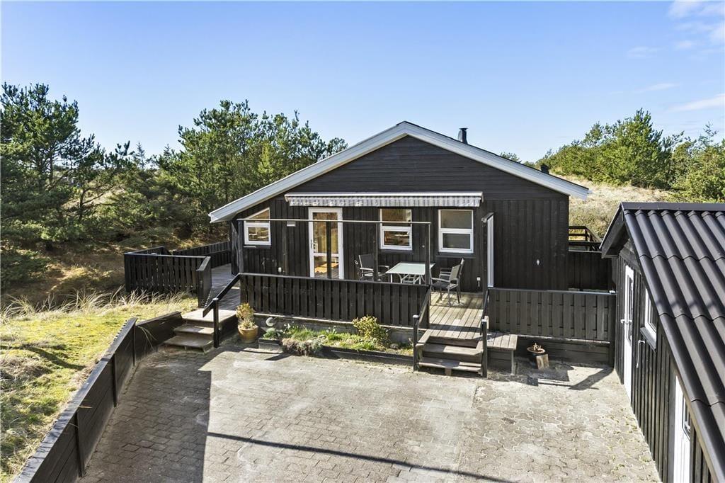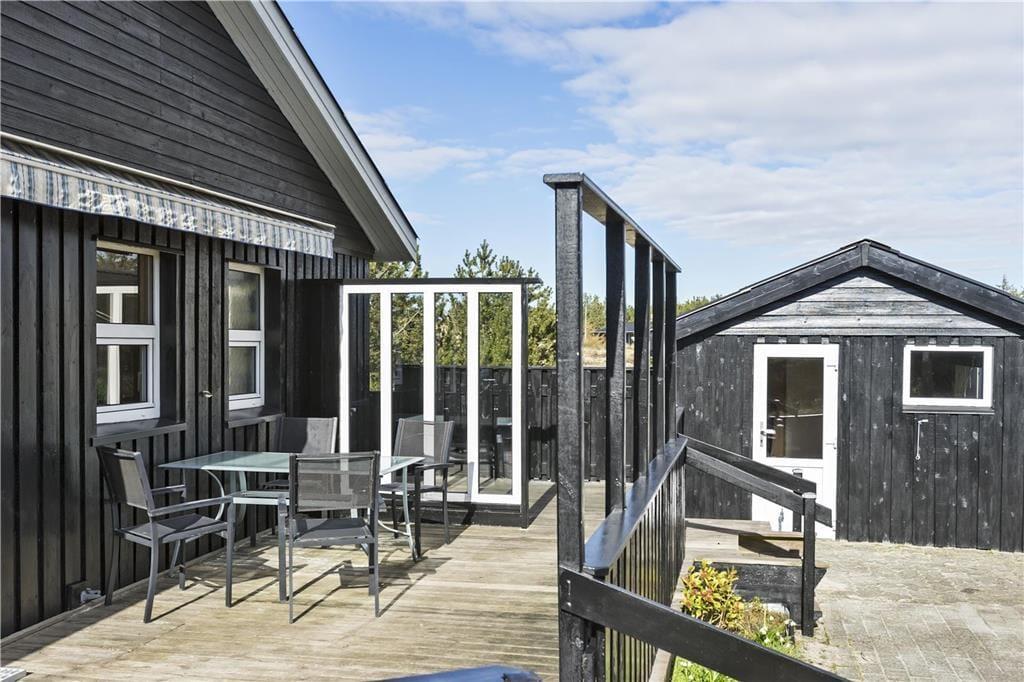 Udendørs kan du virkelig nyde ferielivet på den store terrasse, som omgiver huset. Den sydvendte terrasse giver dig mulighed for at finde sol hele dagen og nyde de smukke omgivelser med udsigt til klitlandskabet. Uanset om du vil nyde morgenkaffen i solen, slappe af med en god bog eller nyde et måltid under åben himmel, er der altid en dejlig plads på terrassen. Den ugenerte placering betyder, at du kan være helt for dig selv, mens du nyder den friske luft. Det er også et perfekt sted at samle familien og hygge sig på de lune sommeraftener, mens brændeovnen står klar til at skabe ekstra varme på de køligere dage.