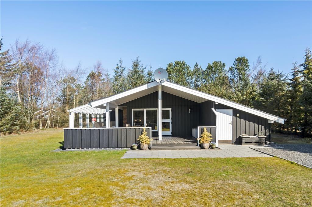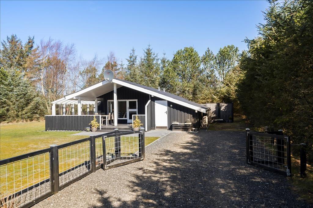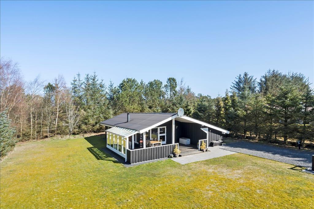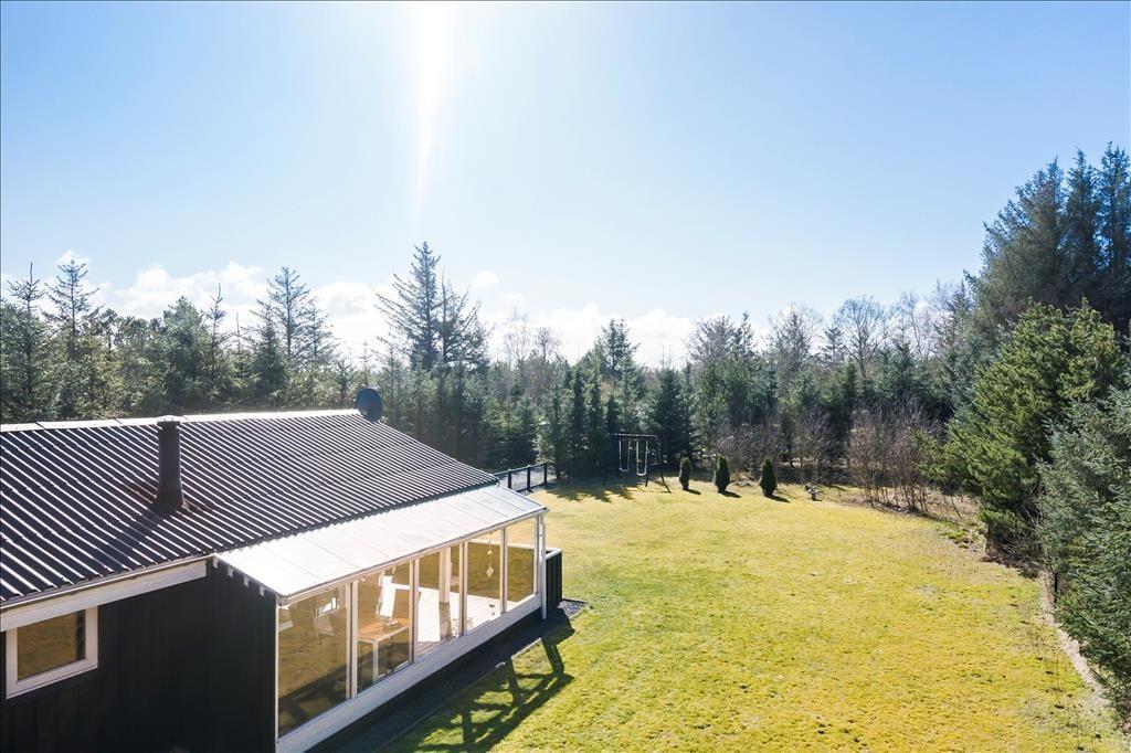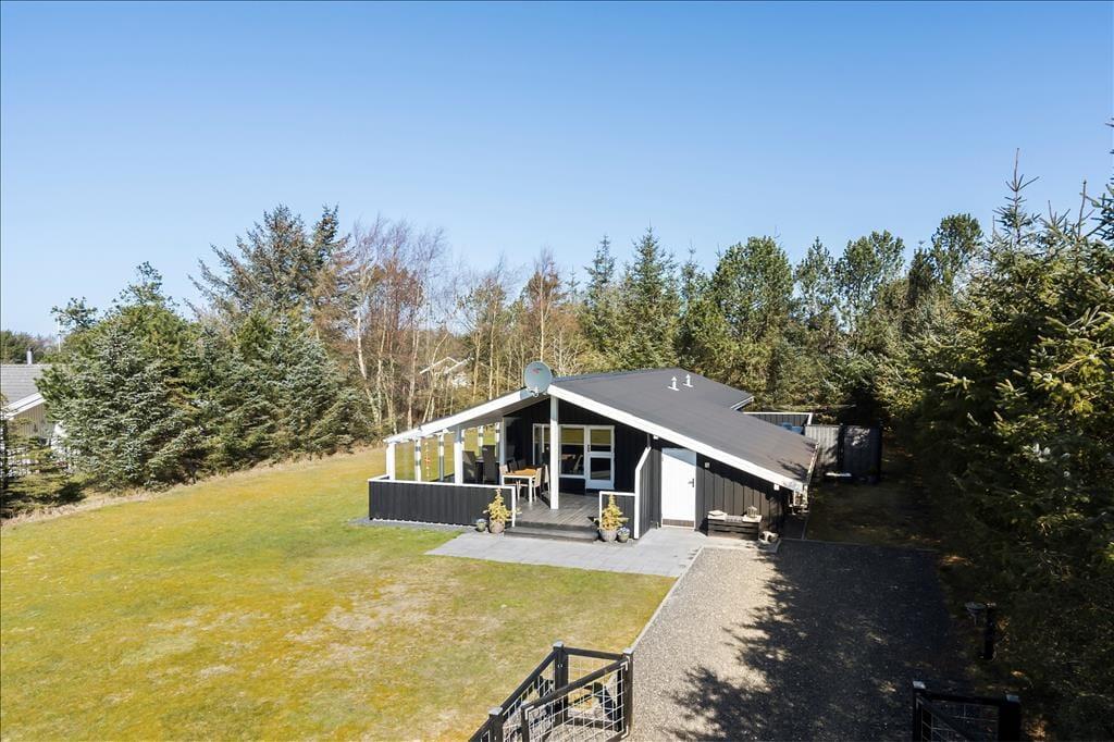 Sommerhuset ligger på en stor grund, godt beskyttet af høje og tætte træer og med en stor græsplæne med masser af plads til at lege tagfat og spille bold. Fra køkkenet er der udgang til en hyggelig terrasse med morgensol, mens man fra stuen kan gå ud på en stor og overdækket terrasse med god plads til at grille, spise og hygge sig om aftenen. Desuden er grunden lukket, så man kan trygt lade børn lege uden fare for at de stikker af på eventyr.