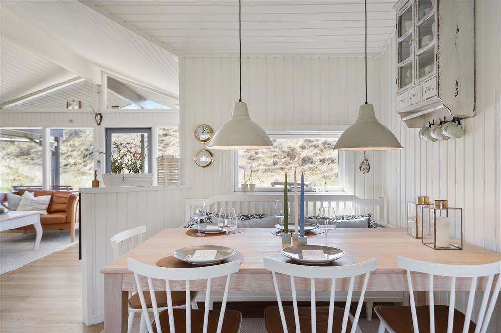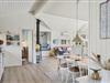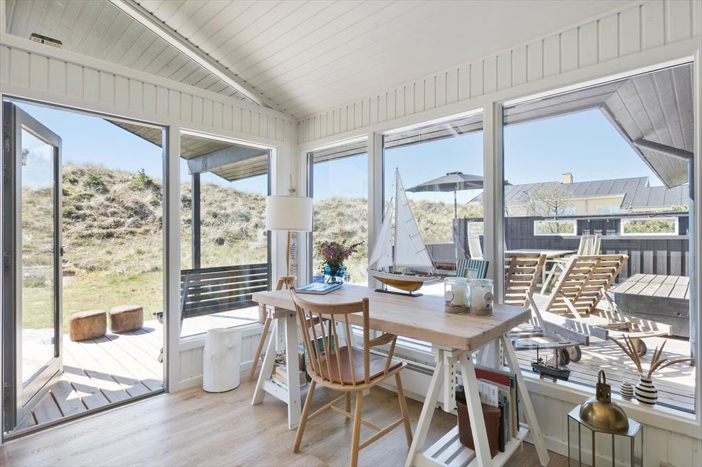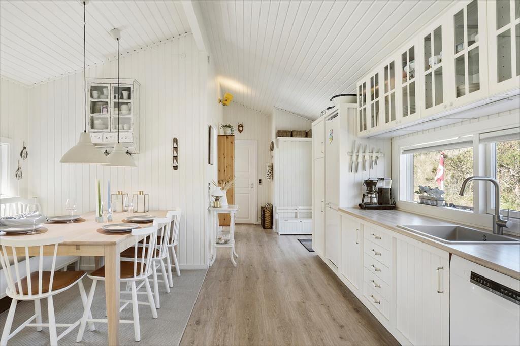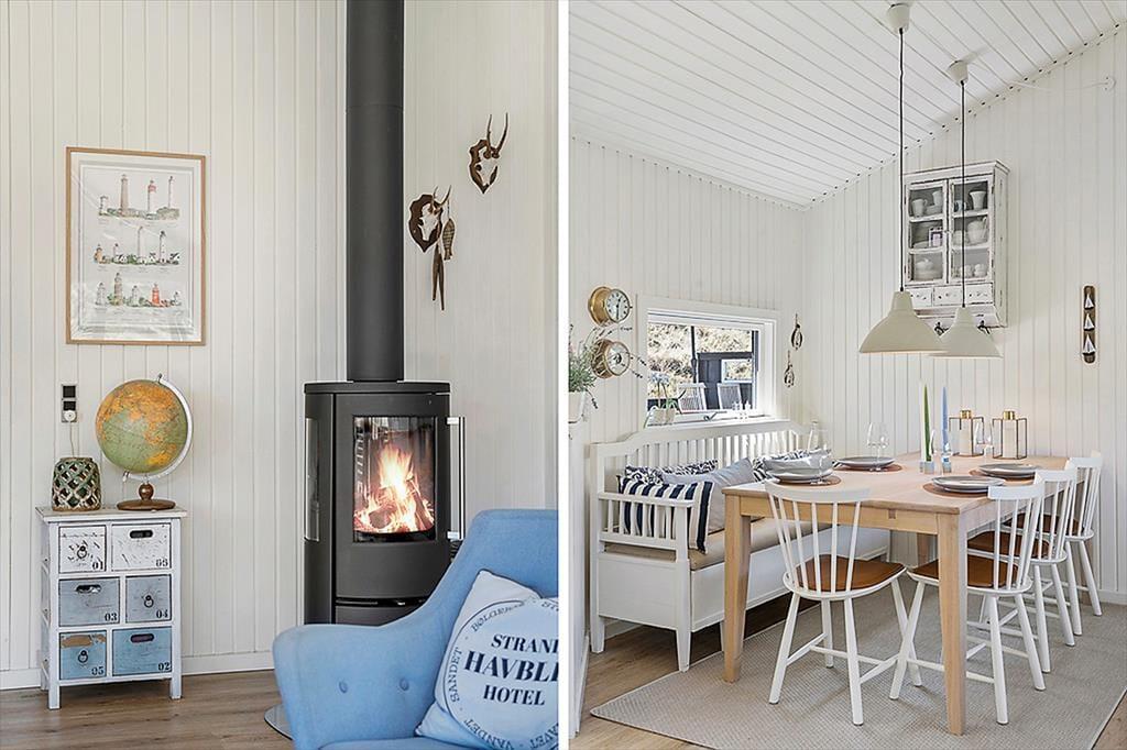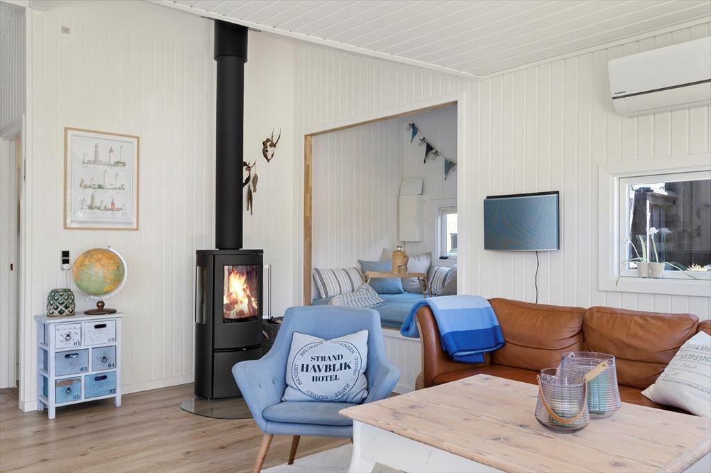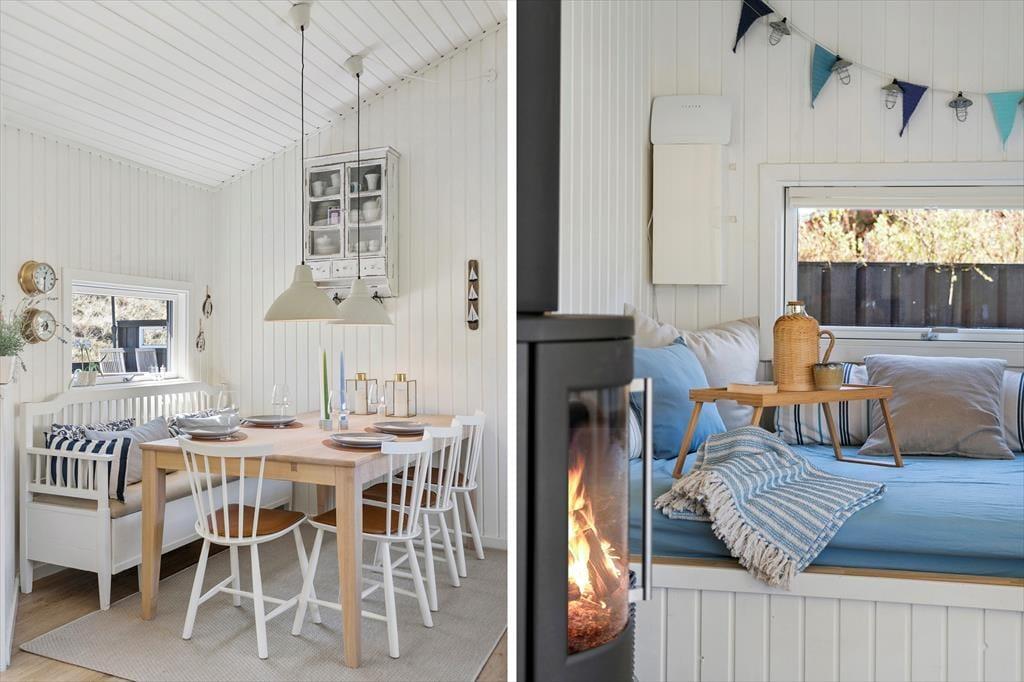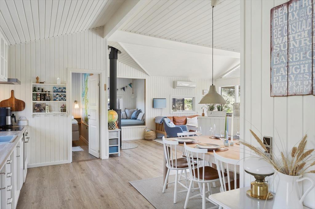 Når du træder ind i sommerhuset på Foraarsvangen 18, bliver du mødt af en lys og indbydende atmosfære. Huset er indrettet med øje for detaljen, og de mange små kroge og niveauer skaber en helt særlig hygge. Stuen er husets hjerte, hvor store vinduer lader dagslyset strømme ind og inviterer naturen med indenfor. Her kan du slappe af foran brændeovnen, nyde en god bog eller samles med familien til en hyggelig filmaften. Køkkenet er åbent og funktionelt, perfekt til at tilberede lækre feriemåltider, som kan nydes ved spisebordet med udsigt til den smukke natur.