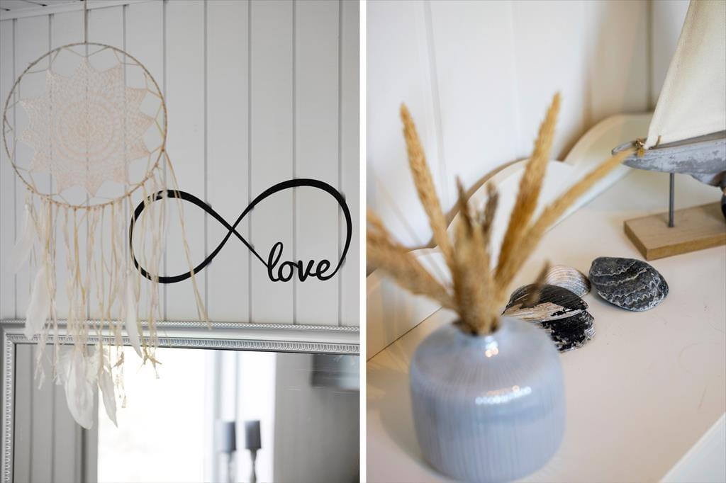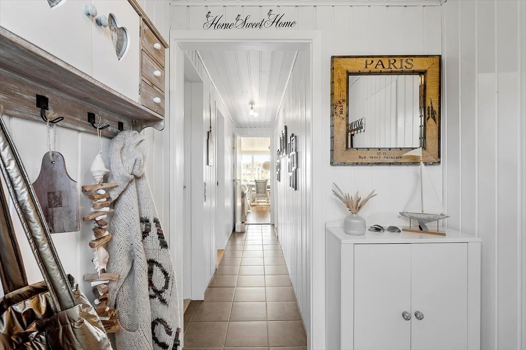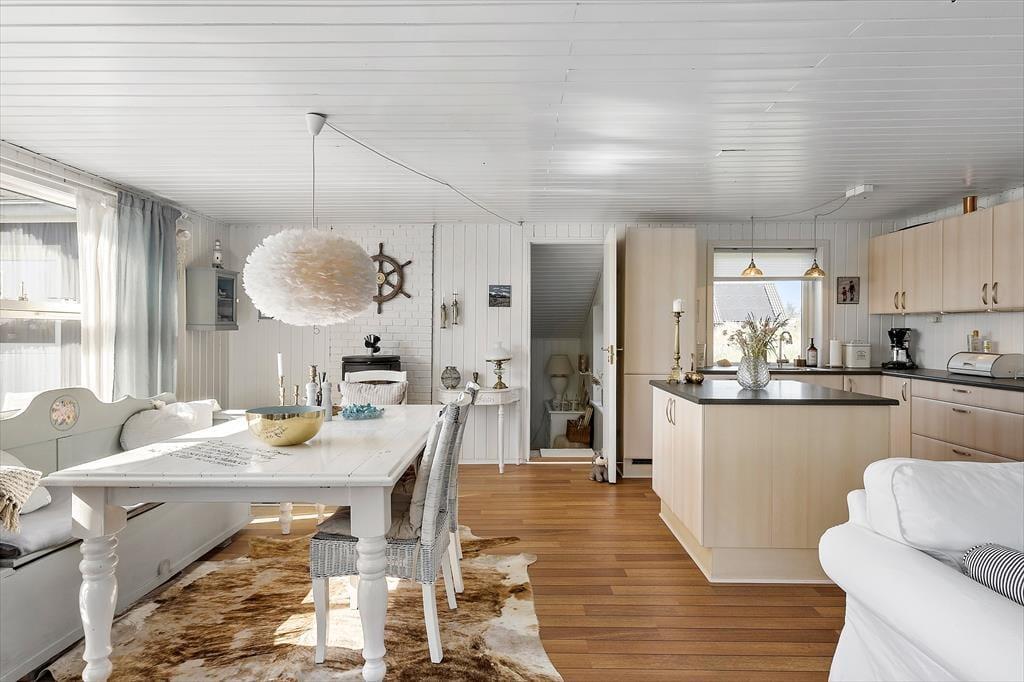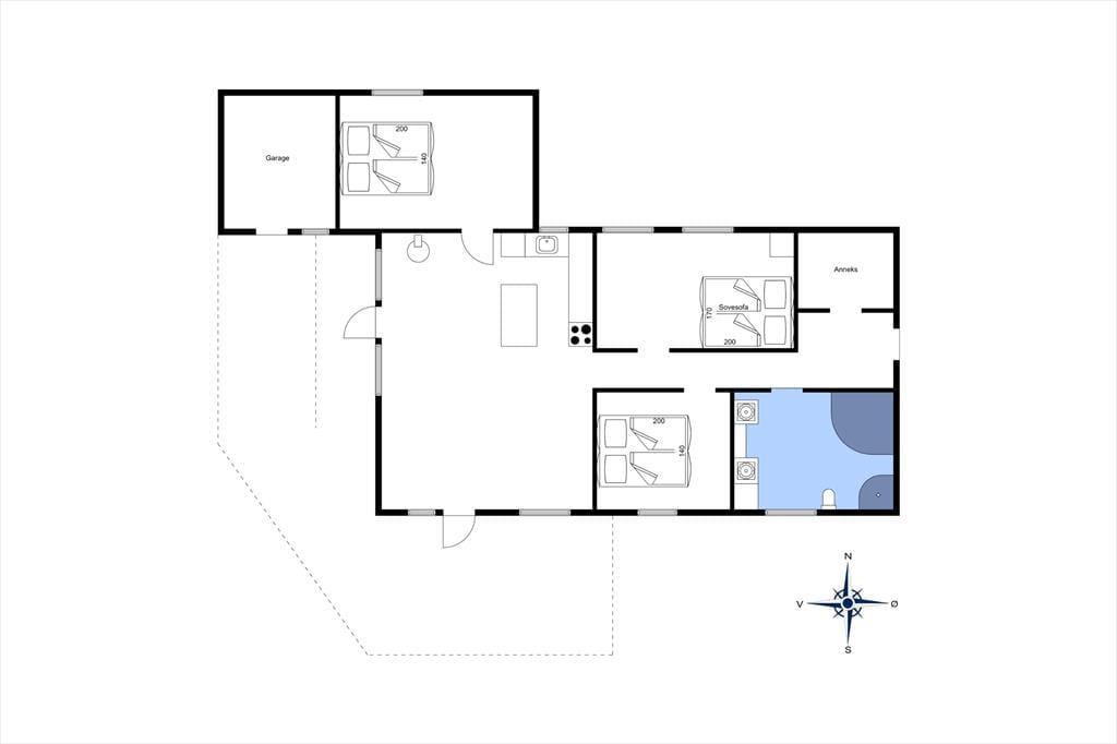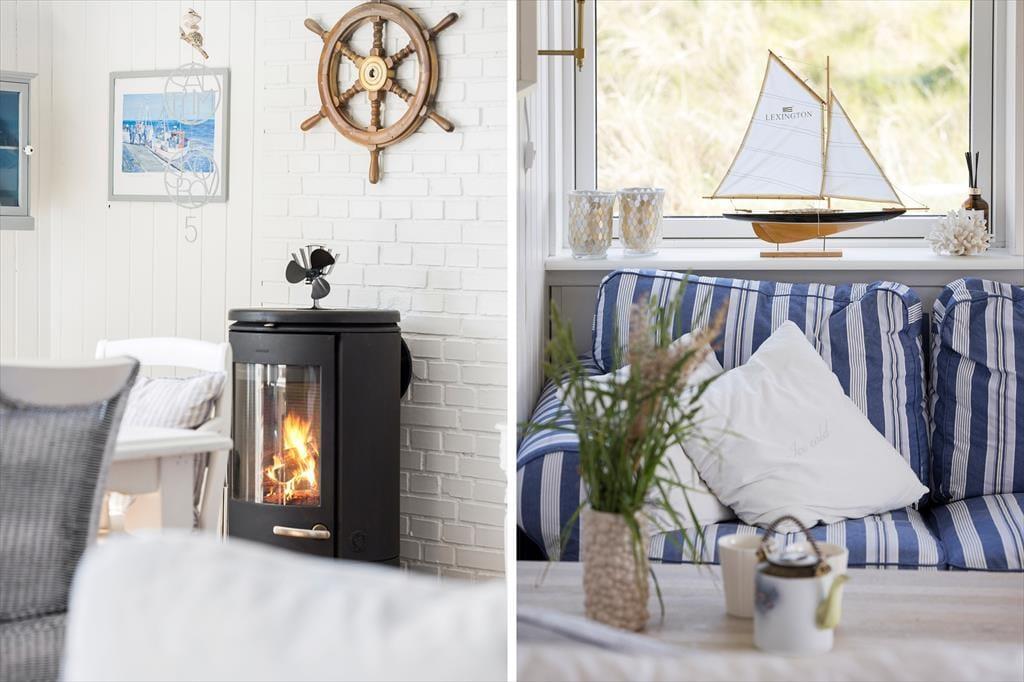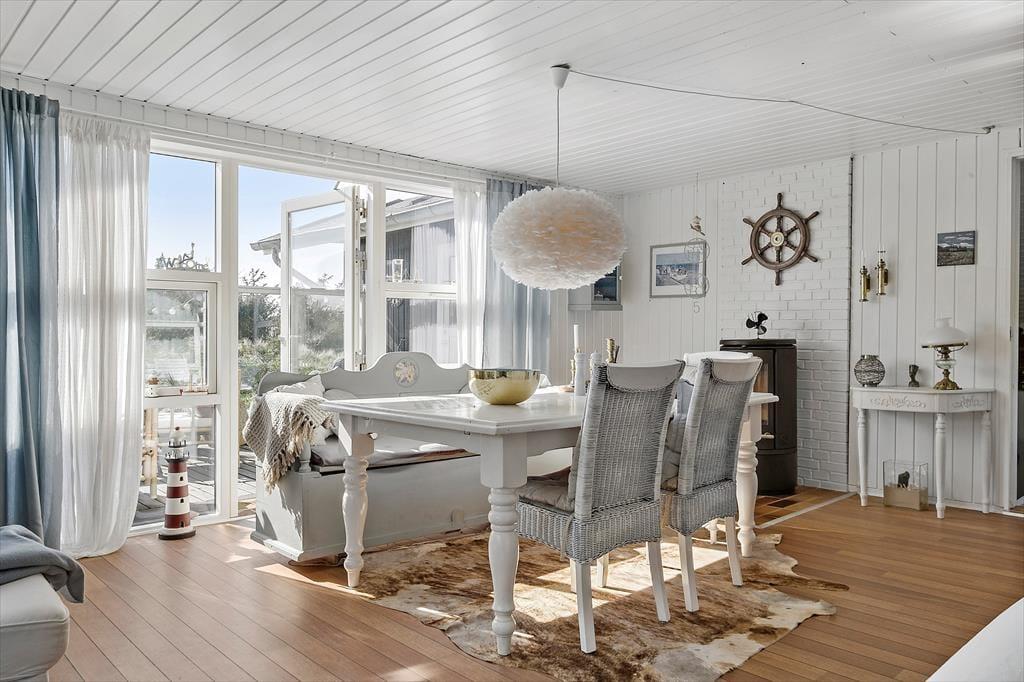 Sommerhuset er oprindeligt opført i 1968 og har derfor nogle år på benene. Det er dog godt vedligeholdt og det fik i 2012 en stor renovering og har bl.a. et nyere køkken og et moderne badeværelse med bruser og spabadekar, så det i dag lever op til alle krav for et velfungerende sommerhus. Huset består af et åbent køkken- og opholdsrum, tre lækre værelser med god plads og badeværelset, hvor man også har mulighed for at vaske og tørre tøj, håndkæder osv. Indretningen er varm og hyggelig med flotte møbler og mange stemningsfyldte detaljer. På de varme sommerdage kan man lukke op til terrassen og lade lyset og den friske vesterhavsduft strømme ind, og viser vejret sig en dag fra den grå og triste side, er det godt at tænde op i brændeovnen og benytte sig af husets trådløse internet. Husk at medbringe pc eller tablets hjemmefra, koden udleveres ved ankomst.