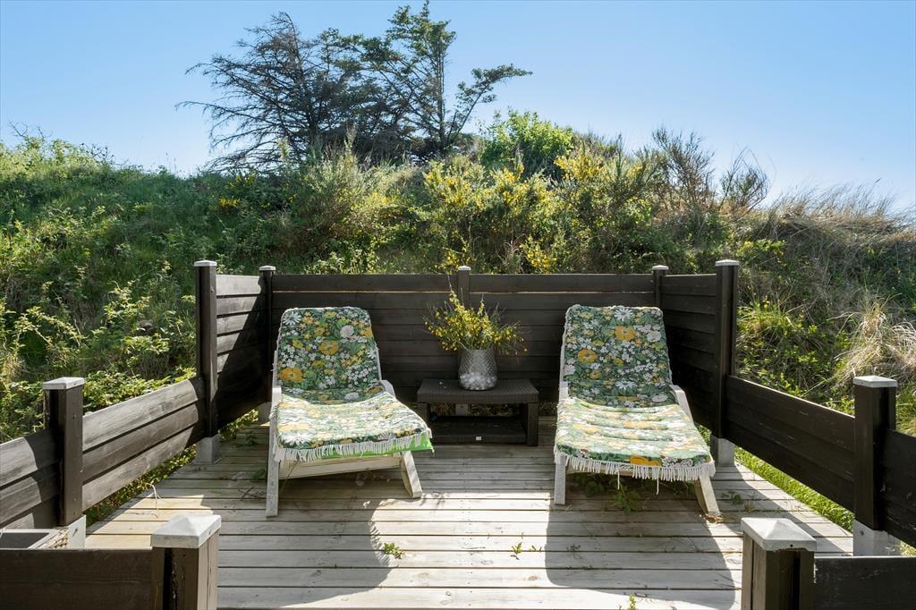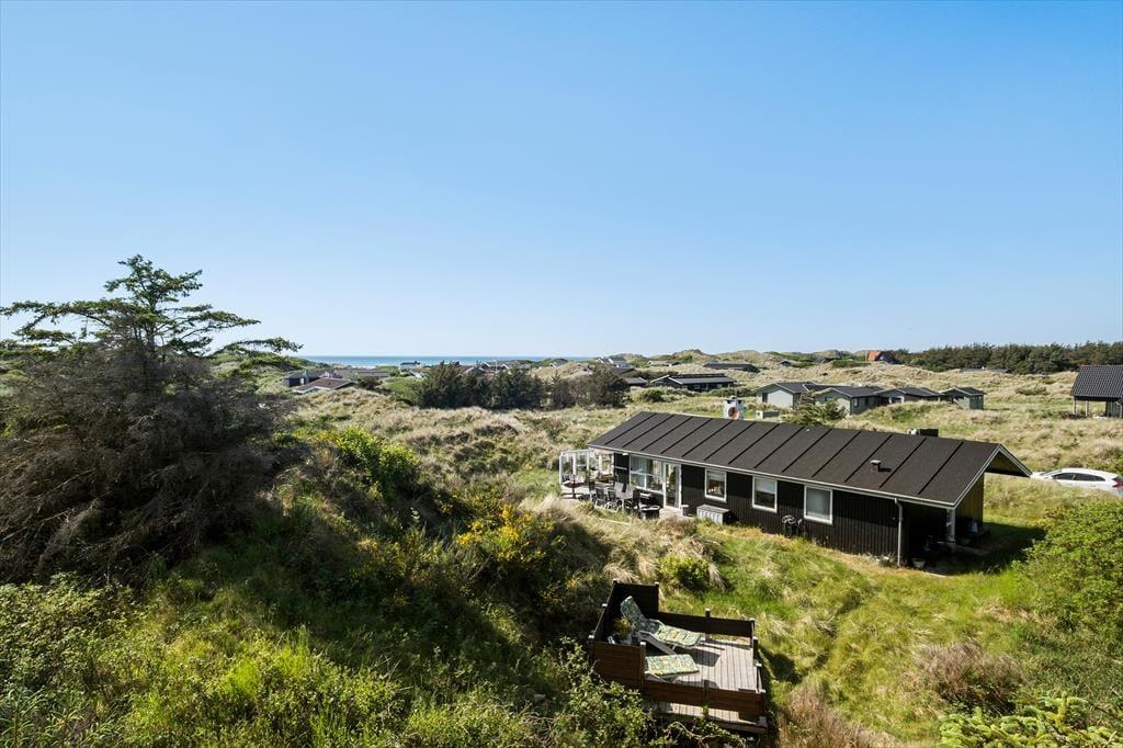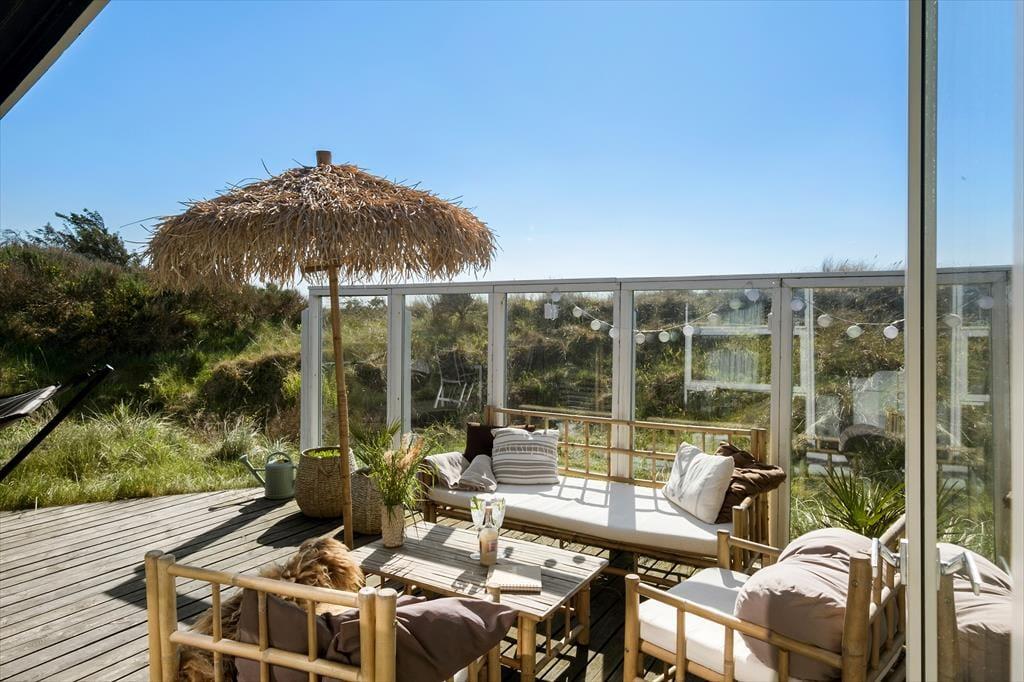 Sommerhuset ligger på en stor naturgrund i klitterne ved Saltum, og man har derfor god læ fra Vestenvinden fra både klittoppene og de glasvægge, som er placeret ved begge terrasser. Fra den sydvendte terrasse har man gode muligheder for at nyde udsigten til den smukke natur, det perfekte sted på de lange, lune sommeraftener.