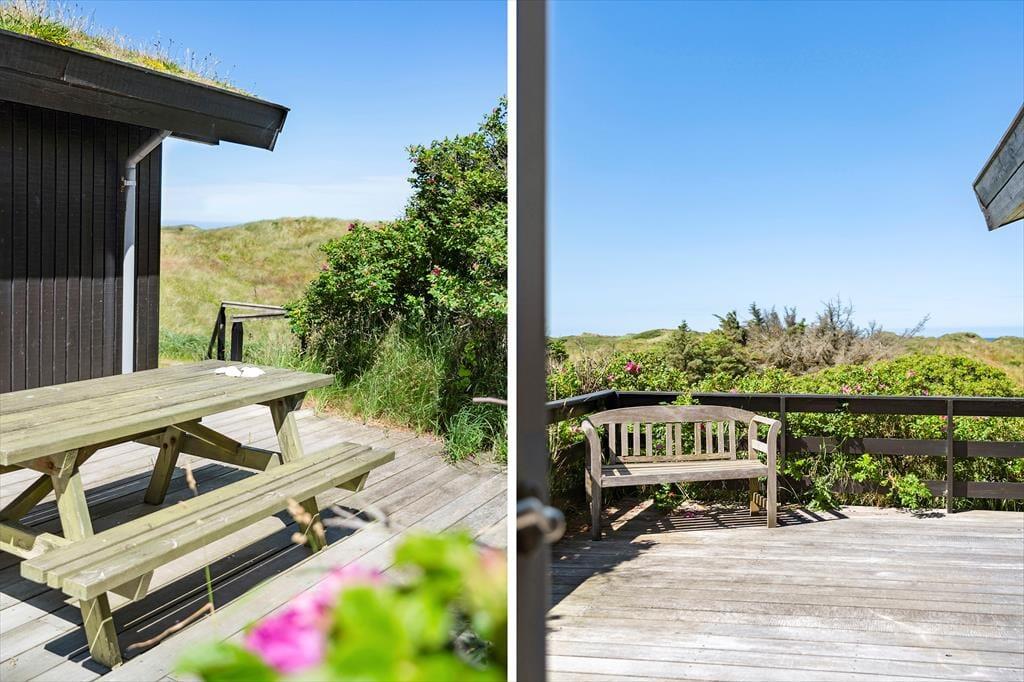 Huset er beliggende på stor naturgrund. Kun 750 m fra den pragtfulde Saltum strand. Her er mulighed for en forfriskende dukkert, lange gåture, og naturligvis sjov og leg på stranden. Saltum strand hører til områdets bedste, men er for det meste mere rolig end områderne i f.eks Løkken og Blokhus. Efter en tur i bølgerne eller på stranden er der mulighed for at skylle havvand og sand af sig i den praktiske udendørs bruser inden man går ind i huset. Huset byder ligeledes på to skønne terrasser. Den ene er overdækket, så uanset om vejret viser sig fra sin gode eller knap så gode side, er der mulighed for at sidde og nyde en kop kaffe eller et glas vin og føle sig midt i naturen. Ved huset er det også nemt at finde en klittop hvor man kan nyde det fantastiske syn af solen der går ned over Vesterhavet.