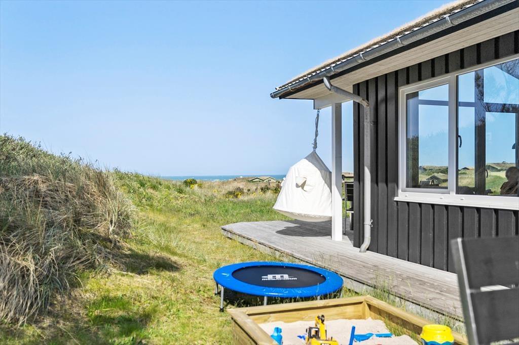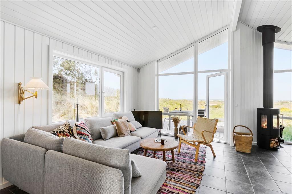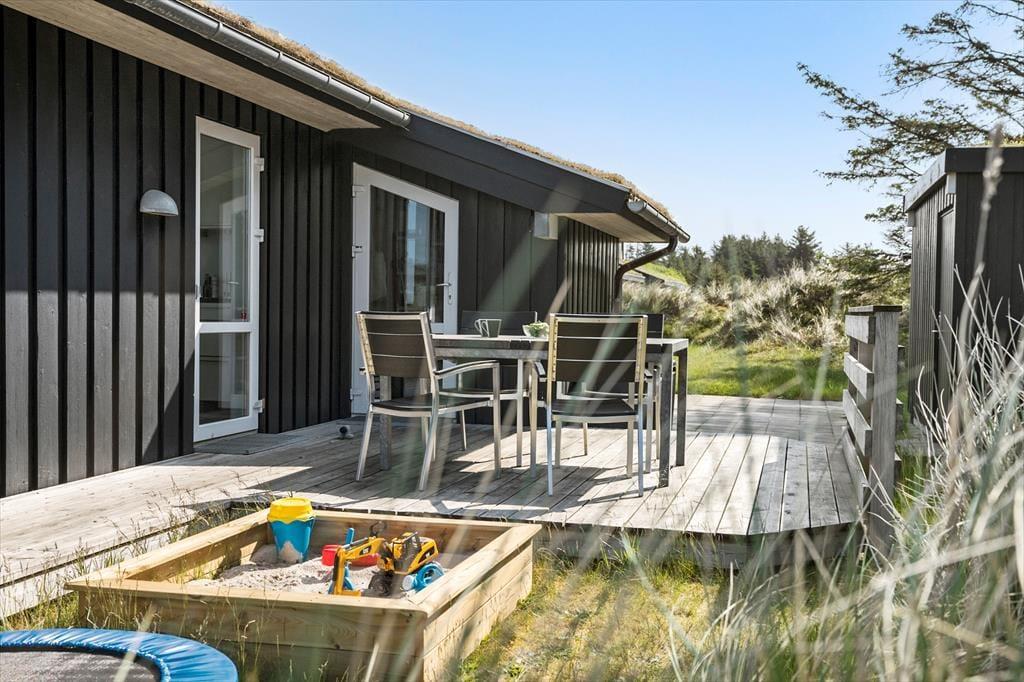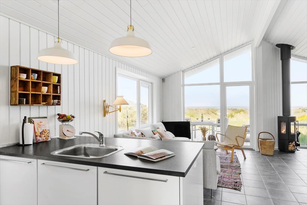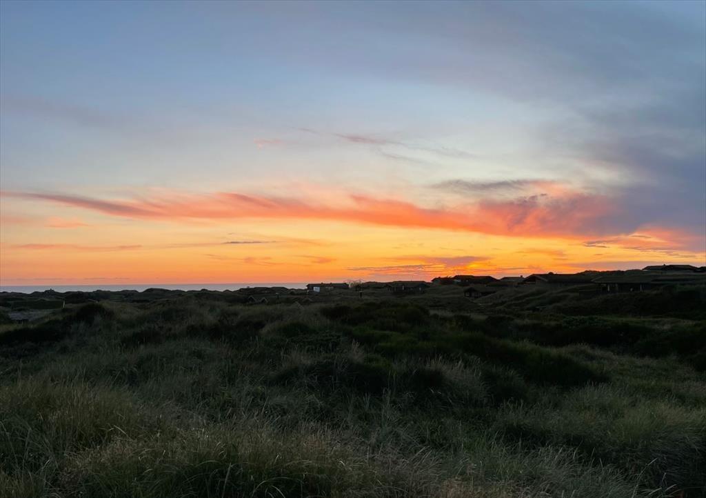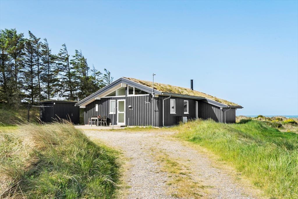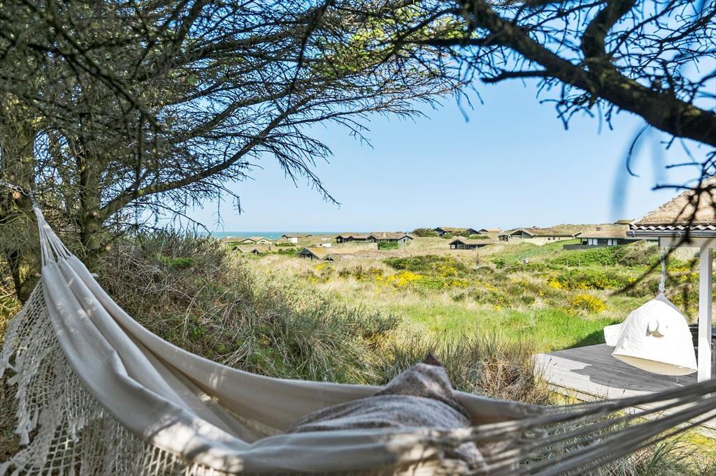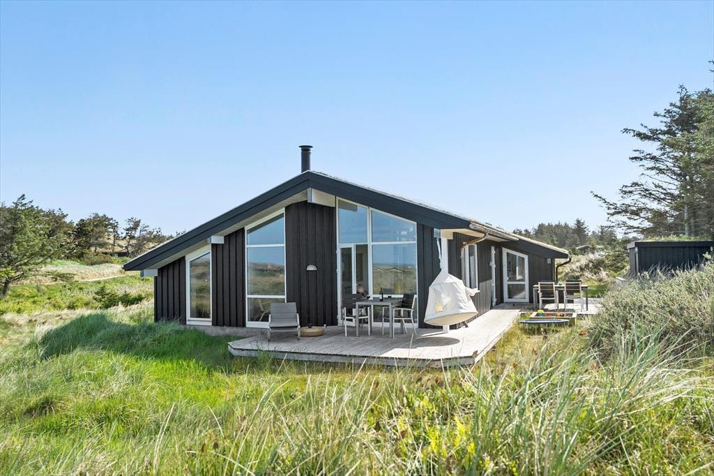 Med sit grønne sedumtag falder sommerhuset næsten i ét med naturen, og fordi det ligger højt i landskabet, bliver I forkælet med den flotteste udsigt over klitterne og havet. Inden døre er atmosfæren let og luftig, for farvetonerne er lyse, og der er loft til kip og et godt lysindfald i løbet af dagen. Om aftenen kan I glæde jer til at se, hvordan vesthimlen over havet farves af den nedadgående sol, mens I hygger jer i sofaen – eventuelt med ild i brændeovnen og noget lækker mad i ovnen i det åbne køkken. Påbadeværelset er der bruseniche og gulvvarme, mens seks sengepladser er ligeligt fordelt på tre soverum, og endelig har I adgang til en hyggelig hems, der er indrettet som legekrog til børnene.