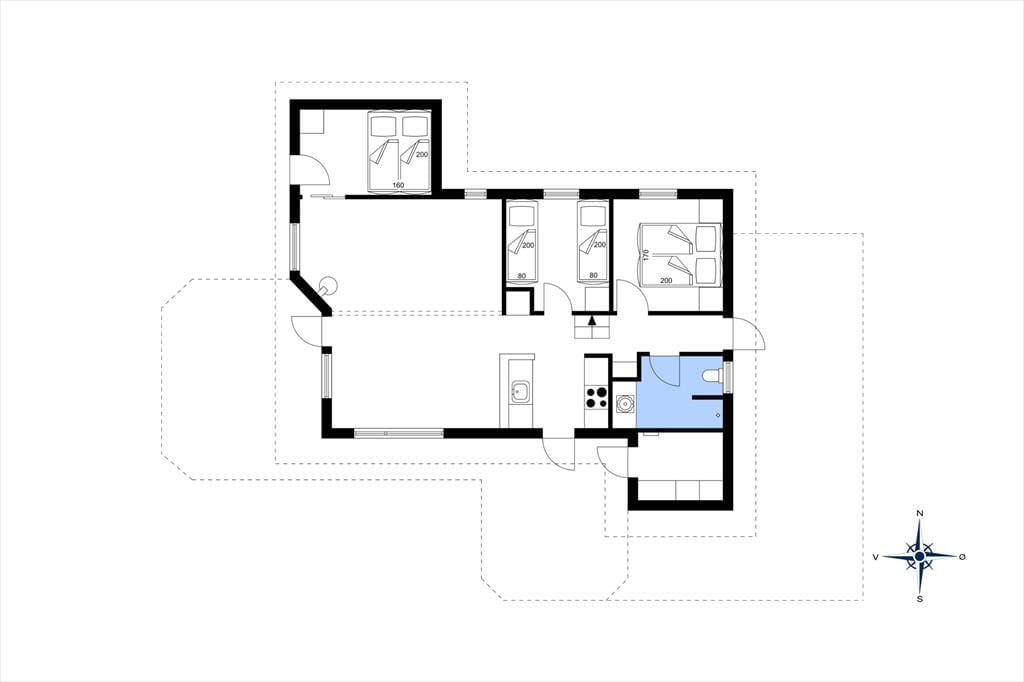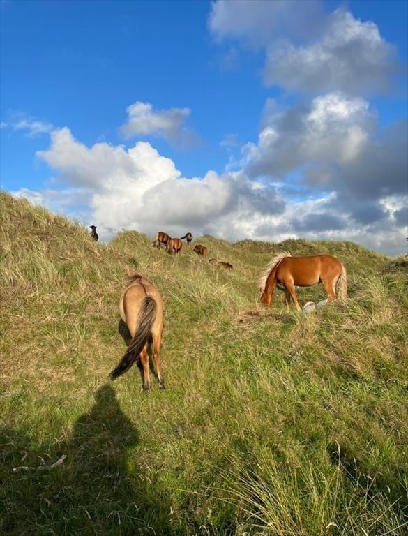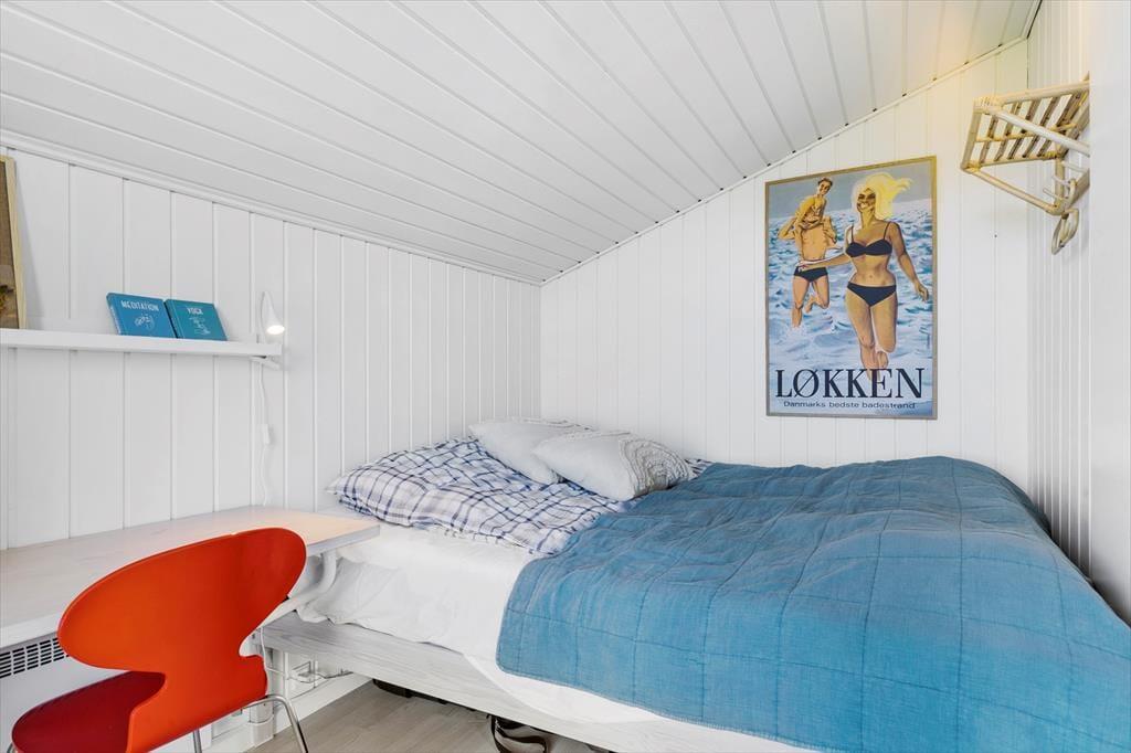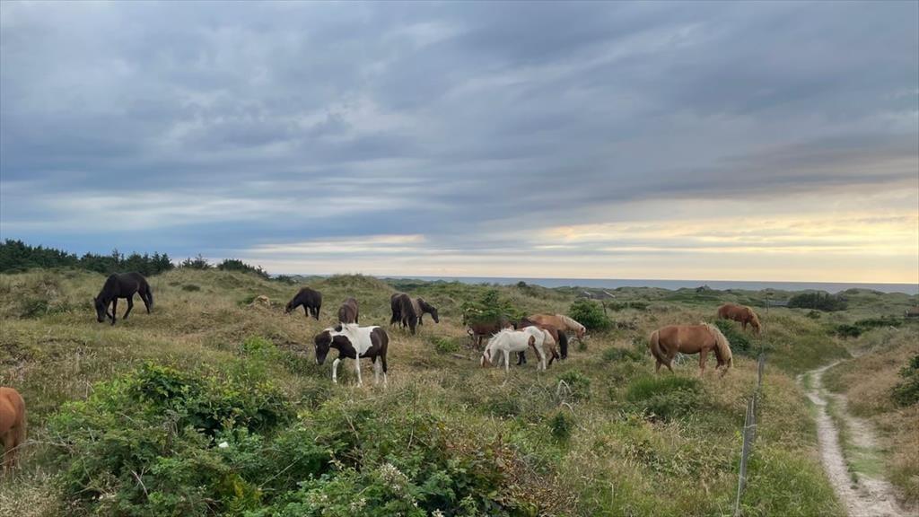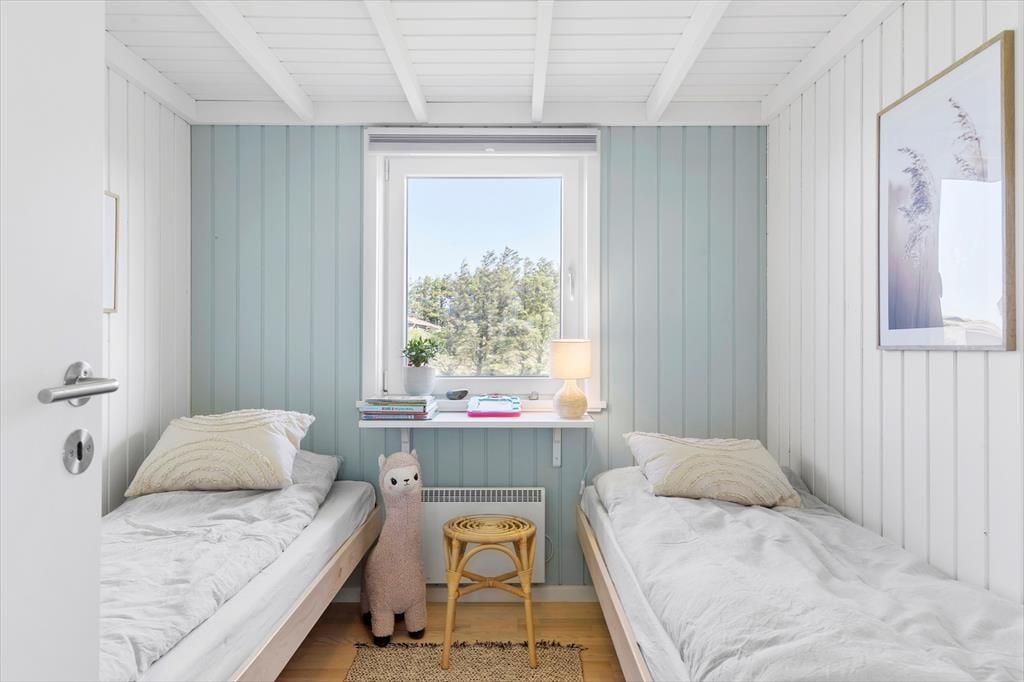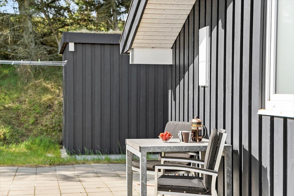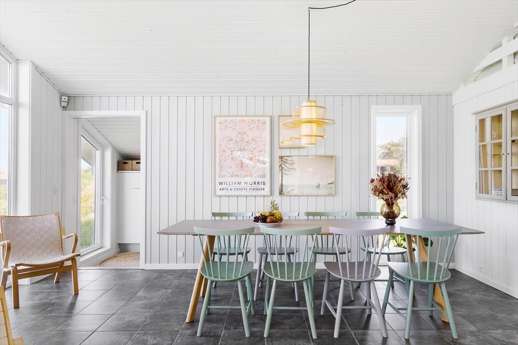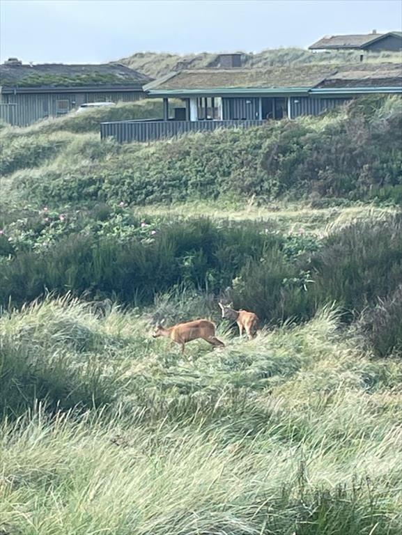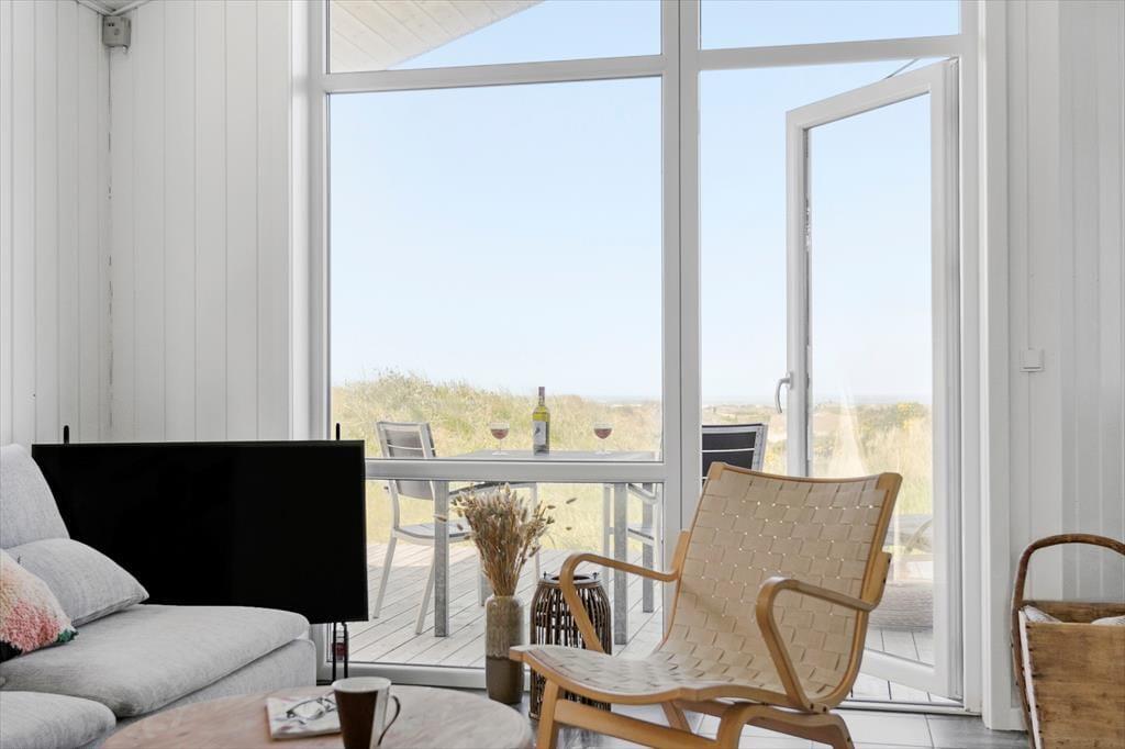 Med sit grønne sedumtag falder sommerhuset næsten i ét med naturen, og fordi det ligger højt i landskabet, bliver I forkælet med den flotteste udsigt over klitterne og havet. Inden døre er atmosfæren let og luftig, for farvetonerne er lyse, og der er loft til kip og et godt lysindfald i løbet af dagen. Om aftenen kan I glæde jer til at se, hvordan vesthimlen over havet farves af den nedadgående sol, mens I hygger jer i sofaen – eventuelt med ild i brændeovnen og noget lækker mad i ovnen i det åbne køkken. Påbadeværelset er der bruseniche og gulvvarme, mens seks sengepladser er ligeligt fordelt på tre soverum, og endelig har I adgang til en hyggelig hems, der er indrettet som legekrog til børnene.