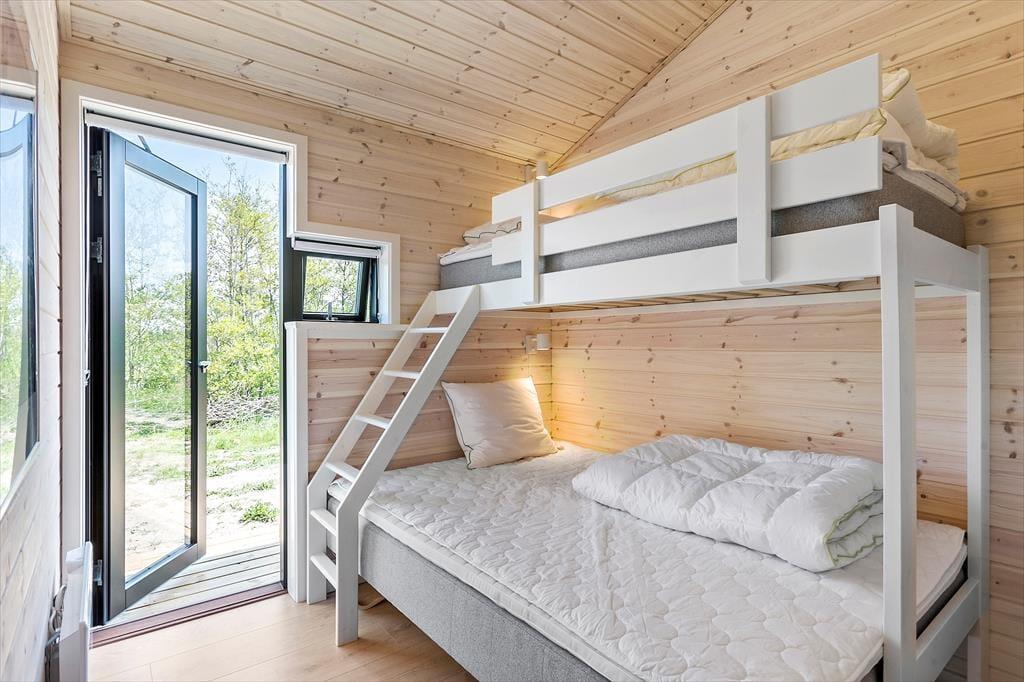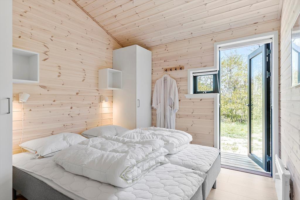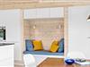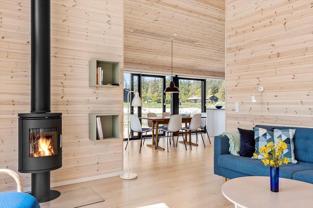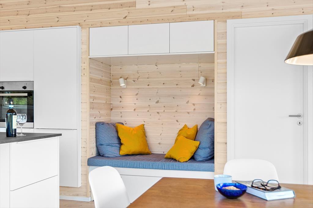 Atmosfæren er lys og let inden døre i det 89 m2 store sommerhus – ikke kun på grund af rummenes lyse trævægge og enkle indretning, men også takket være de store vinduespartier, der inviterer solen og de smukke omgivelser indenfor. Et moderne, grebsfrit køkken er integreret med stuen, der byder på en god spiseplads og en dejlig sofaafdeling med fladskærms-tv og brændeovn. En hyggelig detalje er alkoven, hvor børnene kan sidde med bøger eller mobilspil, mens de voksne åbner en flaske vin og forbereder aftensmaden. Et badeværelse med bruser og vaskemaskine ligger lige ved entréen, og endelig byder huset på tre gode soveværelser og en hems.