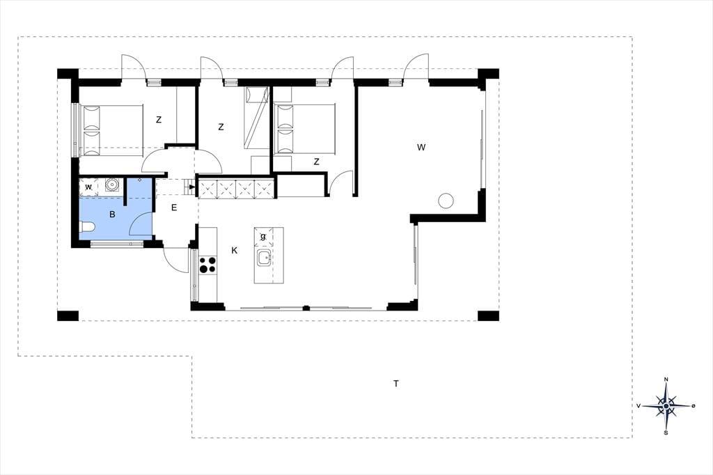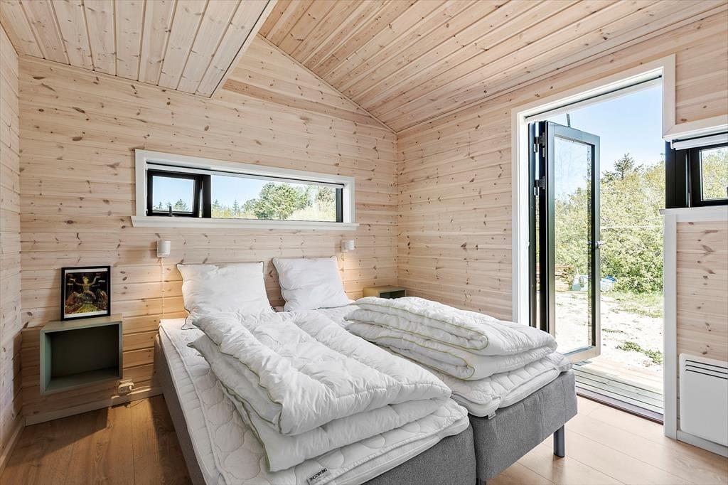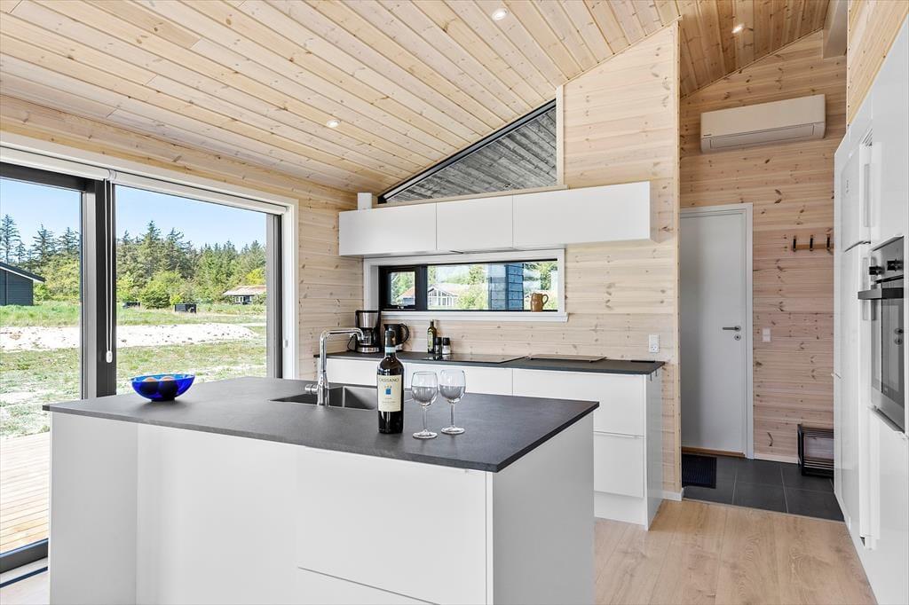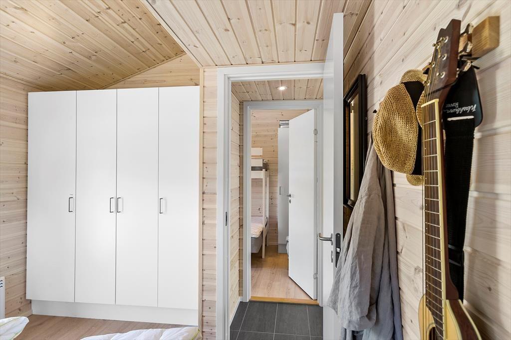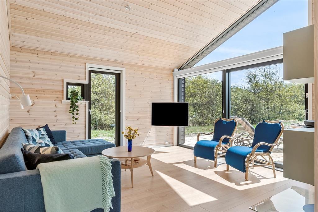 Atmosfæren er lys og let inden døre i det 89 m2 store sommerhus – ikke kun på grund af rummenes lyse trævægge og enkle indretning, men også takket være de store vinduespartier, der inviterer solen og de smukke omgivelser indenfor. Et moderne, grebsfrit køkken er integreret med stuen, der byder på en god spiseplads og en dejlig sofaafdeling med fladskærms-tv og brændeovn. En hyggelig detalje er alkoven, hvor børnene kan sidde med bøger eller mobilspil, mens de voksne åbner en flaske vin og forbereder aftensmaden. Et badeværelse med bruser og vaskemaskine ligger lige ved entréen, og endelig byder huset på tre gode soveværelser og en hems.