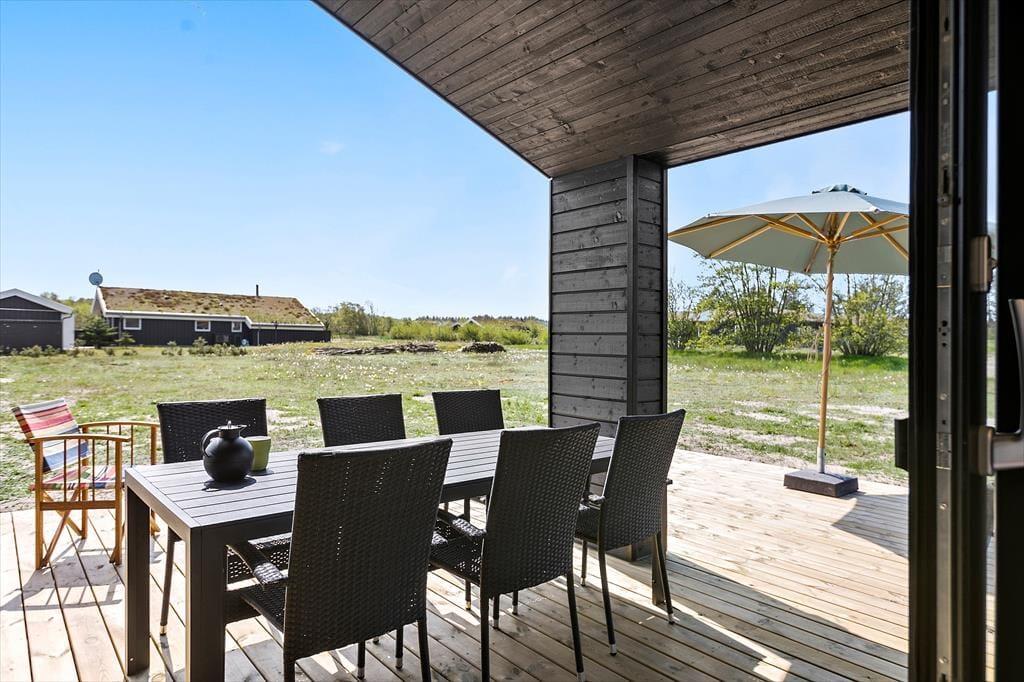 Ikke bare fra entréen og stuen, men også fra de tre værelser er der dør ud mod træterrassen, der breder sig rundt om huset. Her kan I vælge at sætte jer på de overdækkede arealer, hvis I trænger til skygge, og ellers kan I finde en opholdsplads i solen, når I vil drikke eftermiddagskaffe eller grille ude i det fri. På den store naturgrund har I god plads til at spille bold og frisbee, og med en sandkasse og mulighed for at spille petanque er der tænkt på underholdning for både børn og voksne.