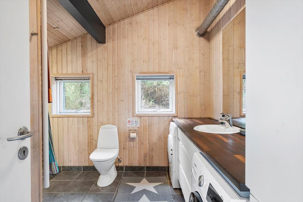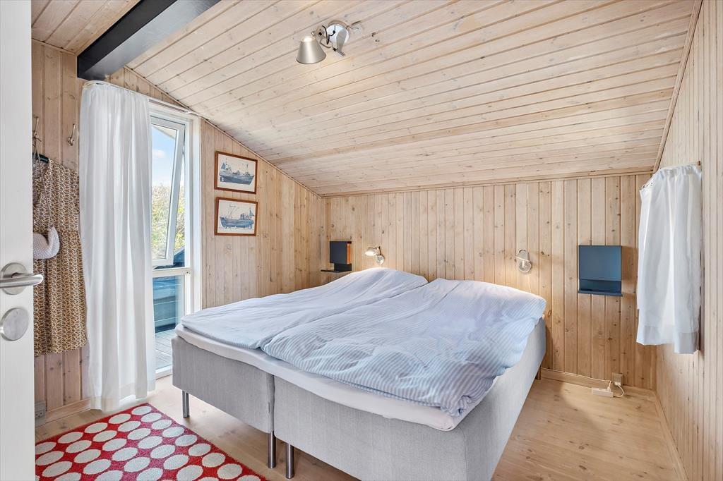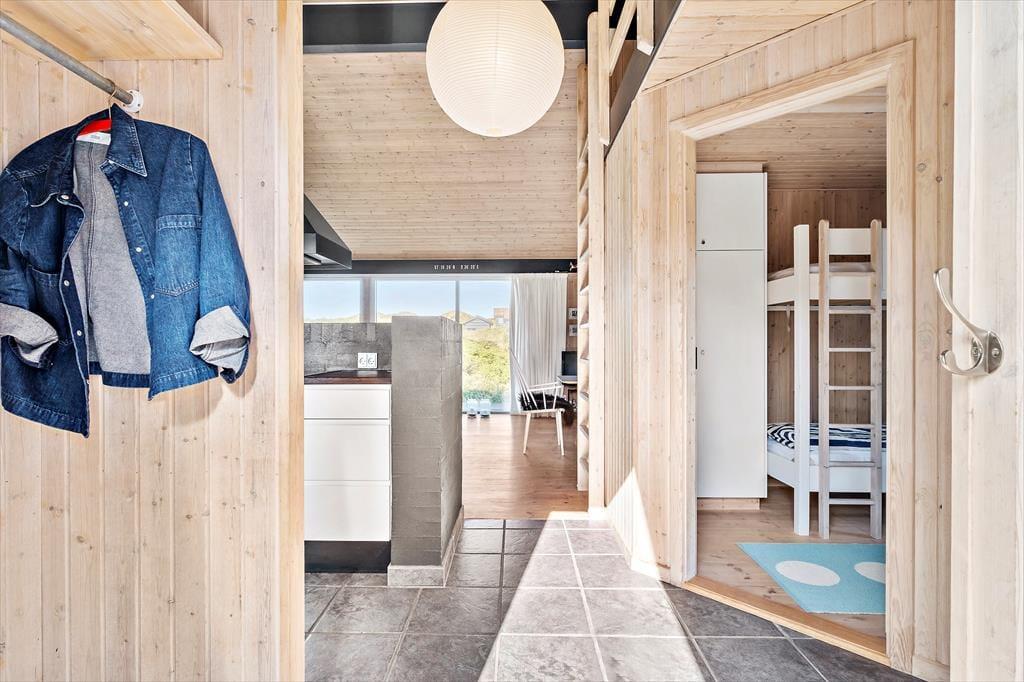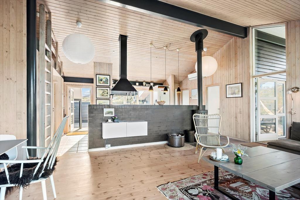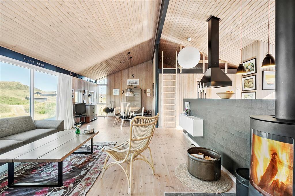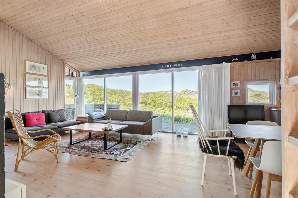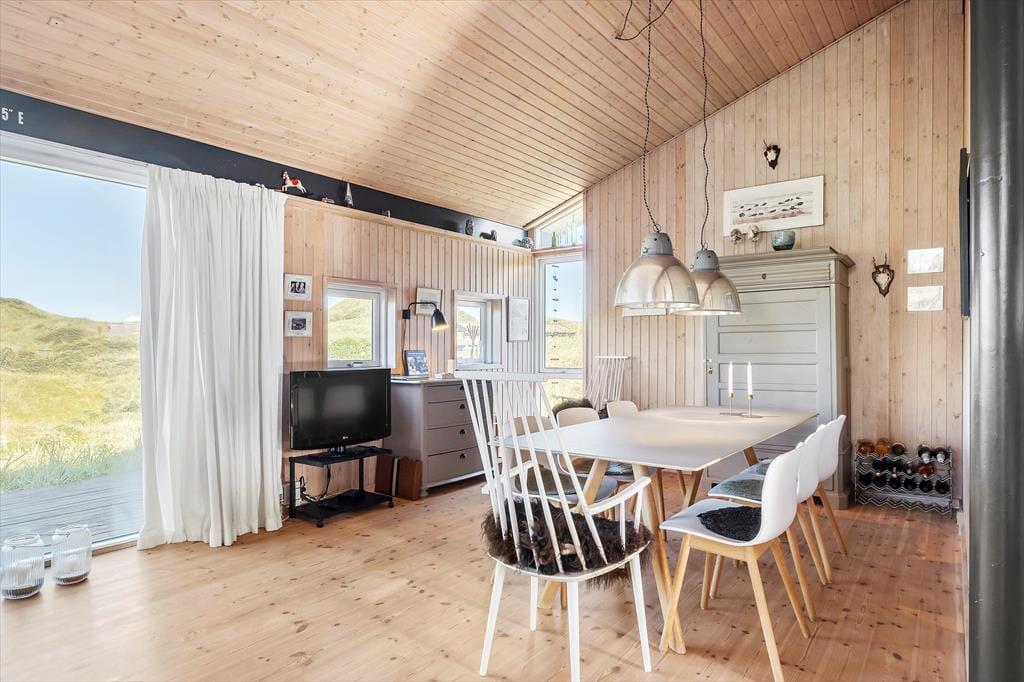 De attraktive naturomgivelser spiller selvsagt en stor rolle for ferieoplevelsen her på adressen, for det føles eksklusivt at have udsigt til marehalmsklædte klitter og hybenbuske fra stuen. Selve sommerhuset er bestemt også et skønt bekendtskab med en lys atmosfære, loft til kip og hele 116 m2 at brede sig på. Med tre soveværelser, et badeværelse og et bryggers passer planløsningen passer godt til seks personer, og der er også en hems til rådighed, hvor børnene kan lege eller måske ligefrem overnatte. Det største og skønneste rum i huset er dog stuen, for her er der gennemstrømmende lysindfald, en dejlig spiseplads, en komfortabel sofaafdeling og en hyggespredende varmekilde i form af en brændeovn. Et rummeligt, tosidet køkken ligger i åben forbindelse med stuen, så selvom I vil bage boller eller begynde på aftensmaden, kommer I ikke til at gå glip af familiens hyggelige samvær.