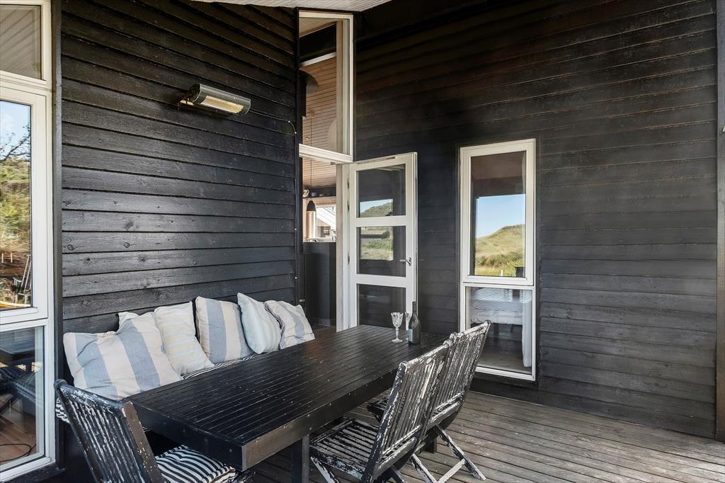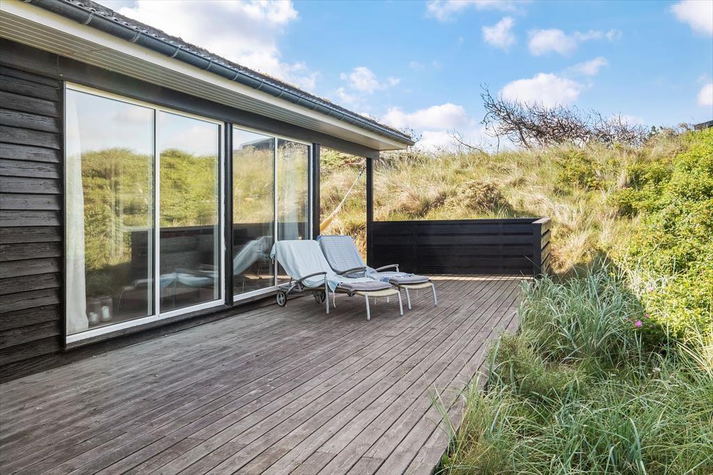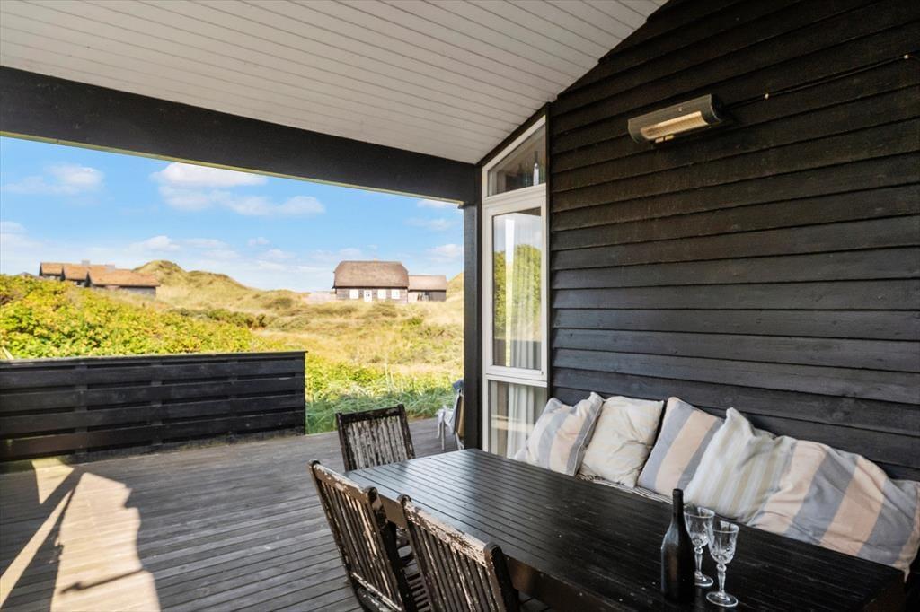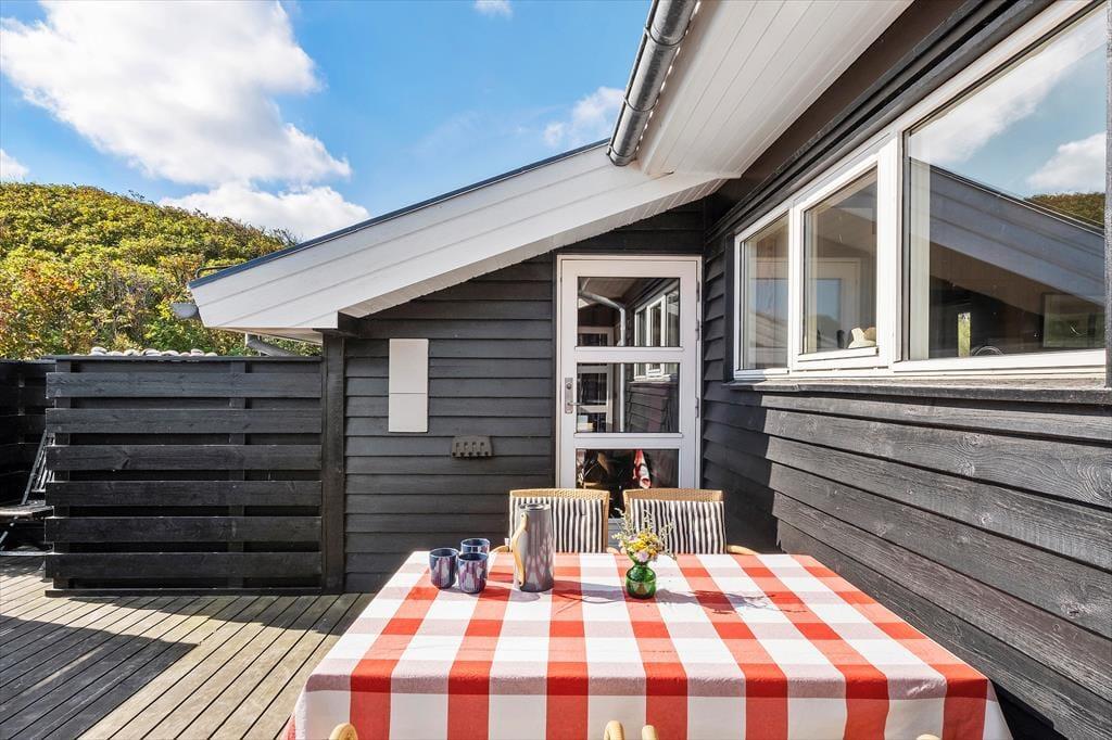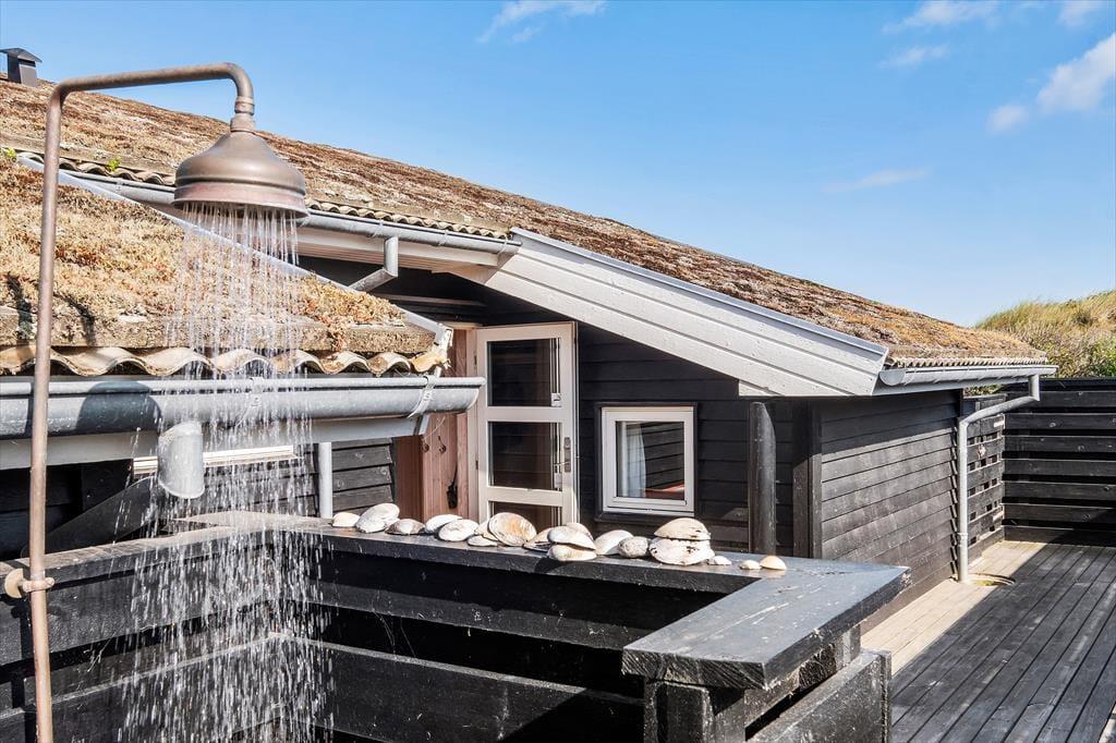 Sommerhusets terrasser fuldender ferieidyllen, for det er skønt at kunne sidde i skyggen eller sole sig i de fredelige og naturskønne omgivelser. Den østvendte terrasse ligger godt i læ bag et hegn, og her finder I for øvrigt en udendørs bruser, hvis I trænger til et køligt skyl under åben himmel. Terrassen mod vest har et overdækket område og er ellers åben, og det er den helt rette opholdsplads, hvis I vil kigge ud over klitterne i den nedadgående sol.