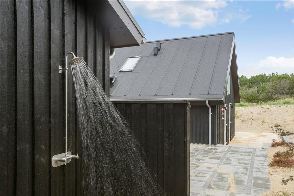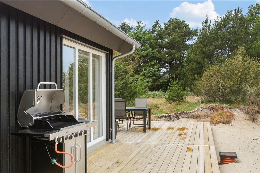 Selvom det er skønt at opholde sig inden døre i sommerhuset, er det nu også fristende at flytte ud i det fri, så snart solen skinner. Sommerhusgrunden er på hele 4.183 m2, og naboen mod nord er et fredet areal, såomgivelserne er virkelig naturskønne, idylliske og totalt ugenerede. Rundt om huset breder sig et flot opholdsmiljø, der byder på både træterrasser og flisebelagte arealer. Her er der naturligvis alt, hvad I skal bruge af terrasseudstyr, inklusiv liggestole, grill og parasol, og takket være den udendørs bruser kan selv morgenbadet foregå under åben himmel.