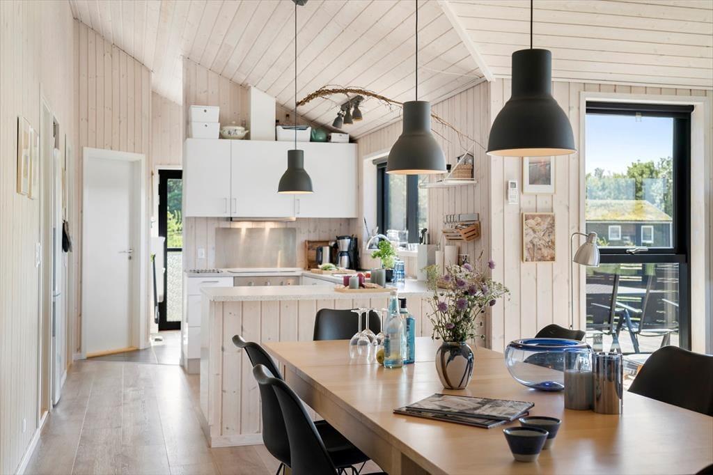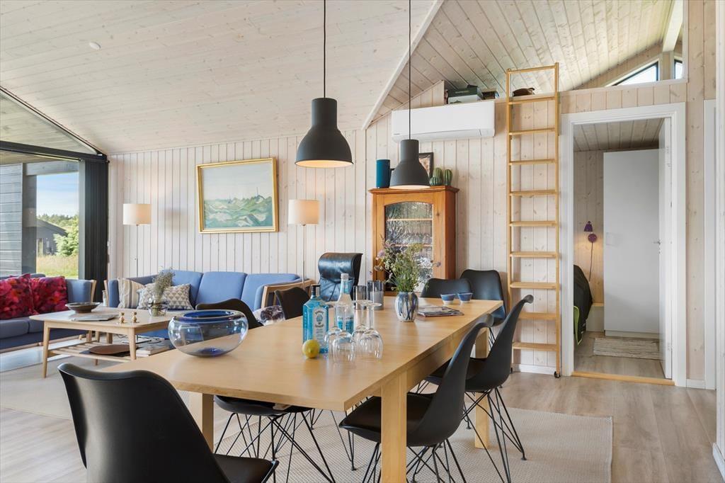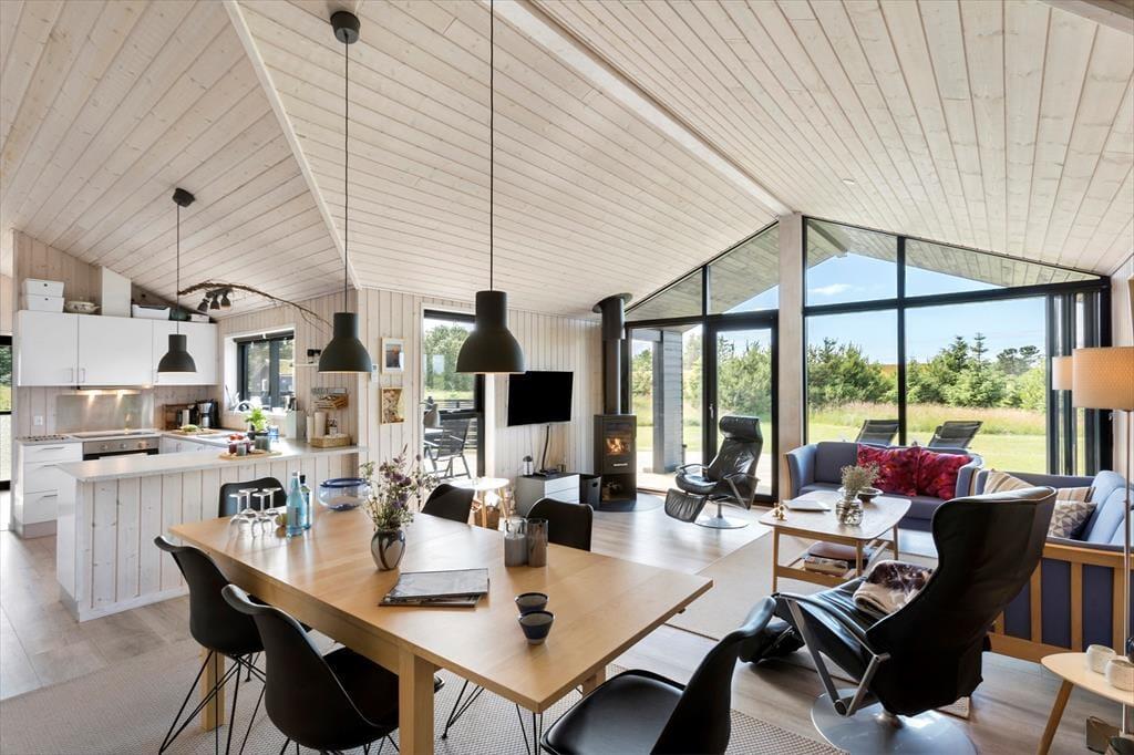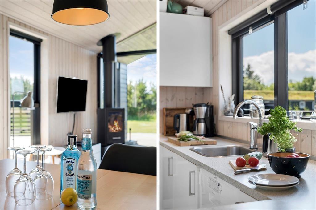 Sommerhuset er præget af en gennemført og stilsikker indretning, hvor alle kvadratmeter er godt inddraget og der er fundet gode og funktionelle løsninger for en optimal udnyttelse. Der er panoramavinduer på den ene langside af huset, herfra kan man nyde Saltums charmerende landskab. Med brændeovn, spa og sauna samt gasgrill udendørs, har man en stor grad af komfort, og til børnene er her barnestol og seng samt masser af dine udendørs tiltag. Køkkenet er åbent og ligger i forlængelse af spisepladsen, i forlængelse heraf kommer sofahjørnet med tvSommerhuset har to badeværelser og otte sovepladser, så uanset om man er en stor familie eller to par afsted sammen, er huset velegnet til en uforglemmelig ferie i det nordjyske. Som en naturlig selvfølge er der Internet installeret i huset.