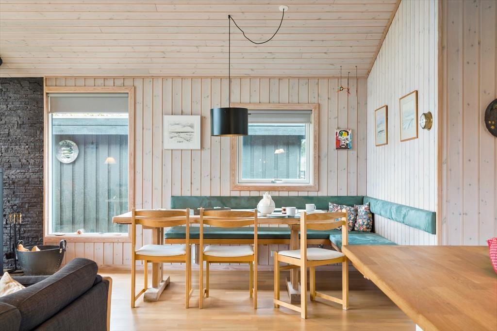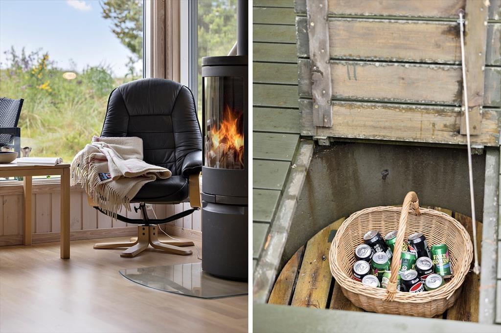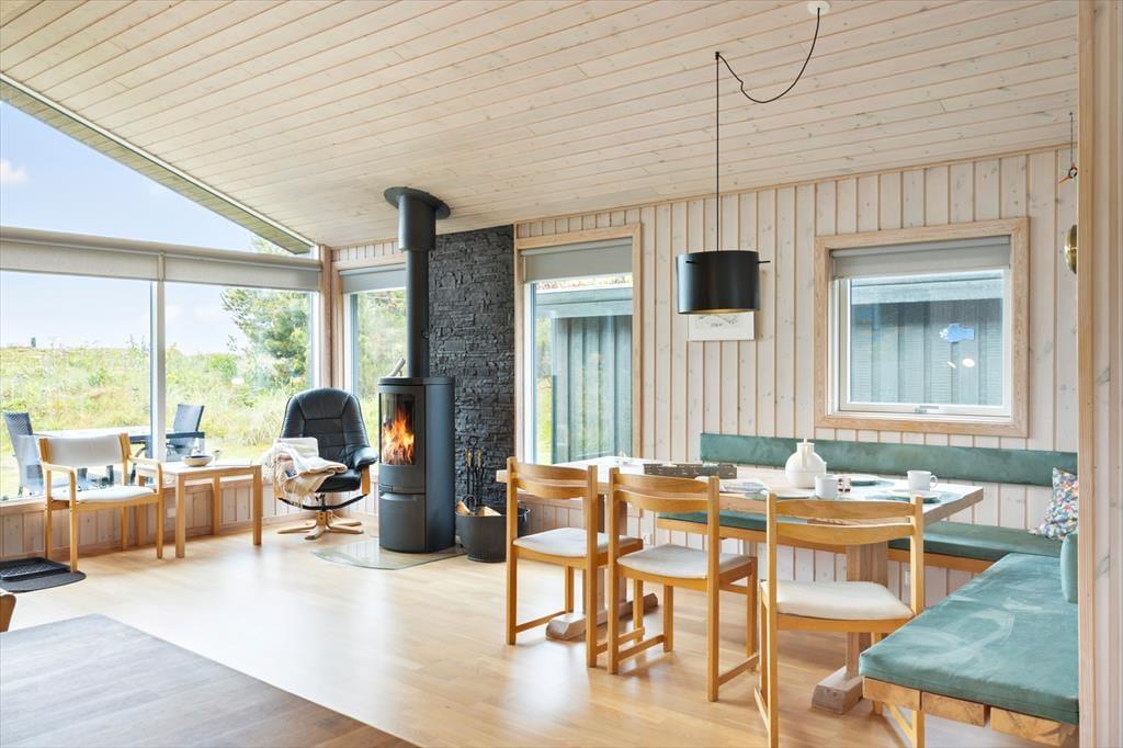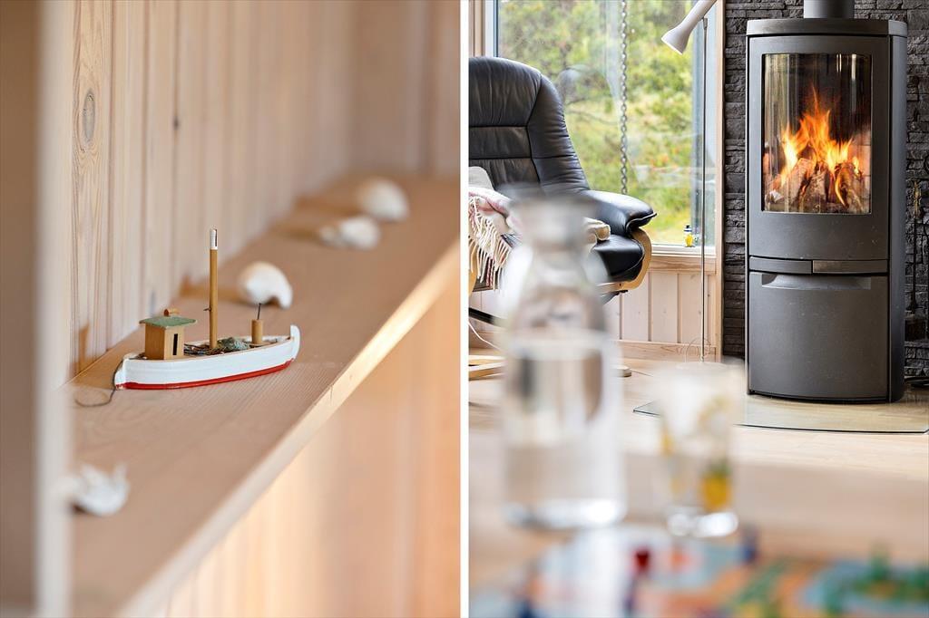 Huset er hyggeligt indrettet med stue, spiseplads og køkken ud i et. Et ideelt samlingspunkt for familien. Det er her man spiser, hygger og slapper af med ild i brændeovnen og en god bog eller en film. Internet forefindes naturligvis også så tag endelig tablet eller PC med på ferien. Der er en lille fordelingsgang hvor der er adgang til det hyggelige badeværelse med brus. Derudover findes en tilbygning med garage og et disponibelt rum. Det er her I finder husets vaskemaskine.