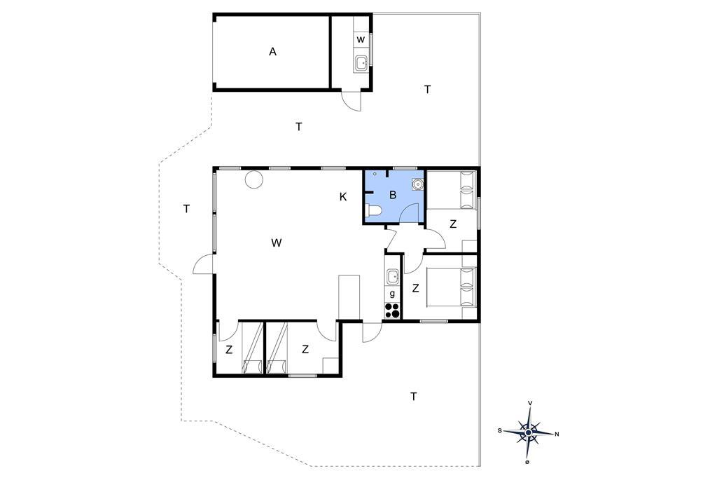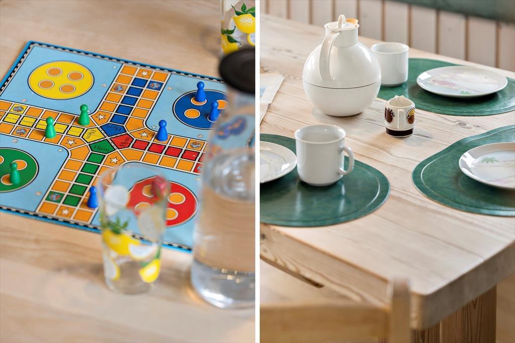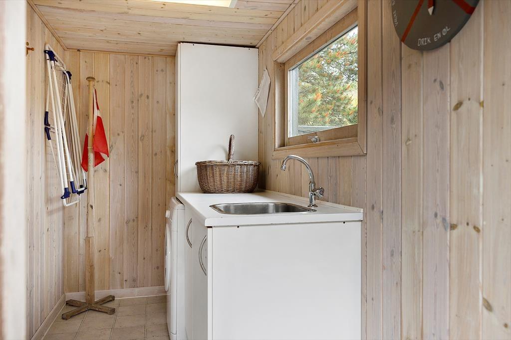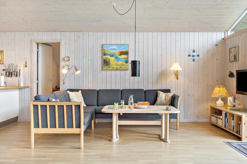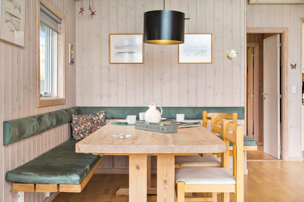 Huset er hyggeligt indrettet med stue, spiseplads og køkken ud i et. Et ideelt samlingspunkt for familien. Det er her man spiser, hygger og slapper af med ild i brændeovnen og en god bog eller en film. Internet forefindes naturligvis også så tag endelig tablet eller PC med på ferien. Der er en lille fordelingsgang hvor der er adgang til det hyggelige badeværelse med brus. Derudover findes en tilbygning med garage og et disponibelt rum. Det er her I finder husets vaskemaskine.