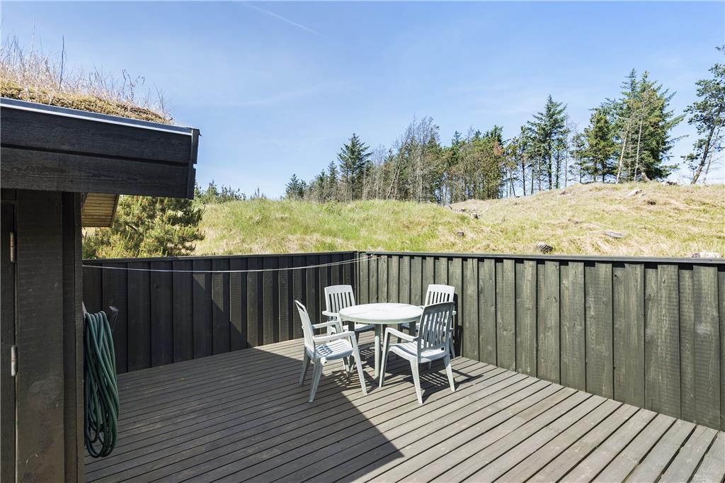 Der løber en stor og flot terrasse på tre sider af sommerhuset så her er der altid mulighed for at finde en plads i solen og en krog i læ for vinden. Især skal fremhæves den store terrasse mellem huset og garagen hvor man kan nyde de lange sommeraftener med grillmad, et glas vin eller en kop kaffe. Både ude og inde er huset en kombination af funktionalitet, og hyggelig sommerhusstemning. Havemøbler og grill er naturligvis til rådighed.