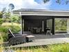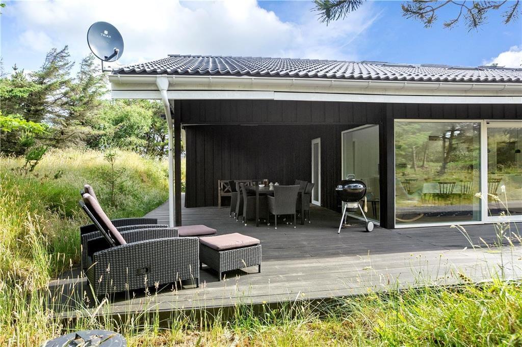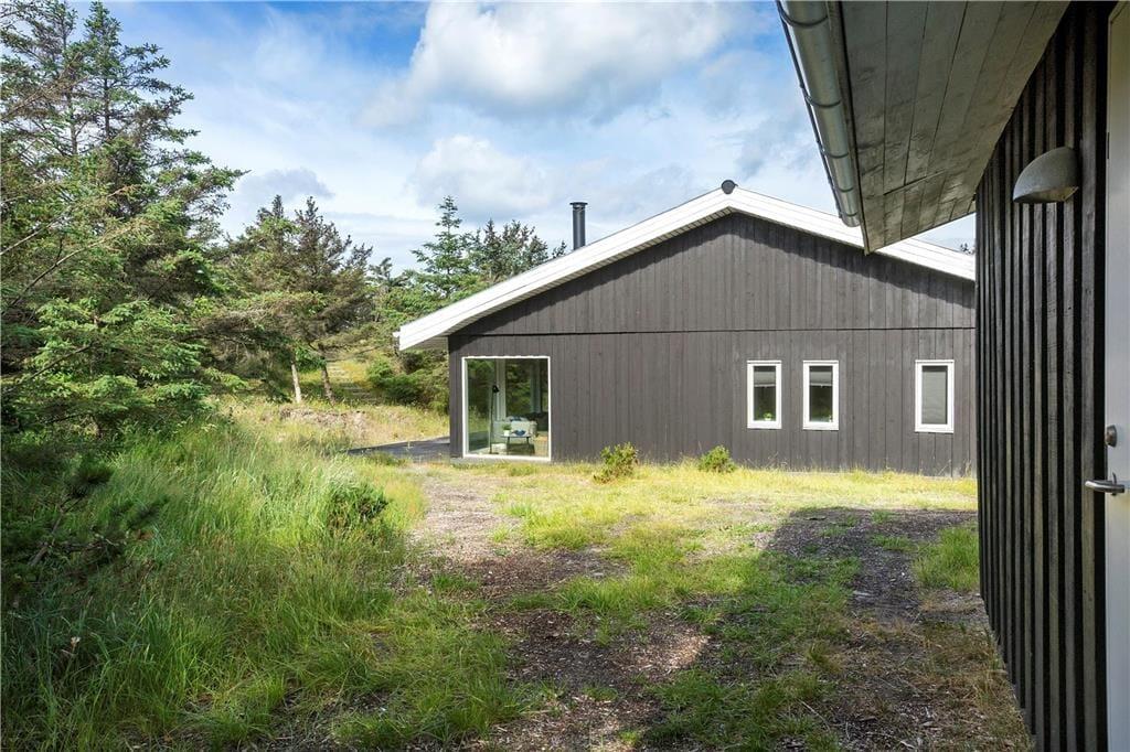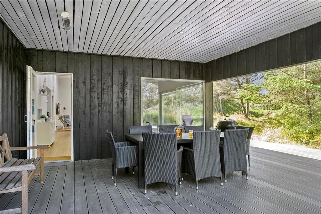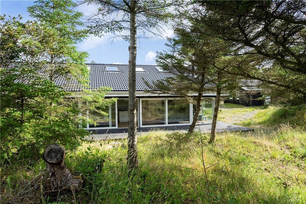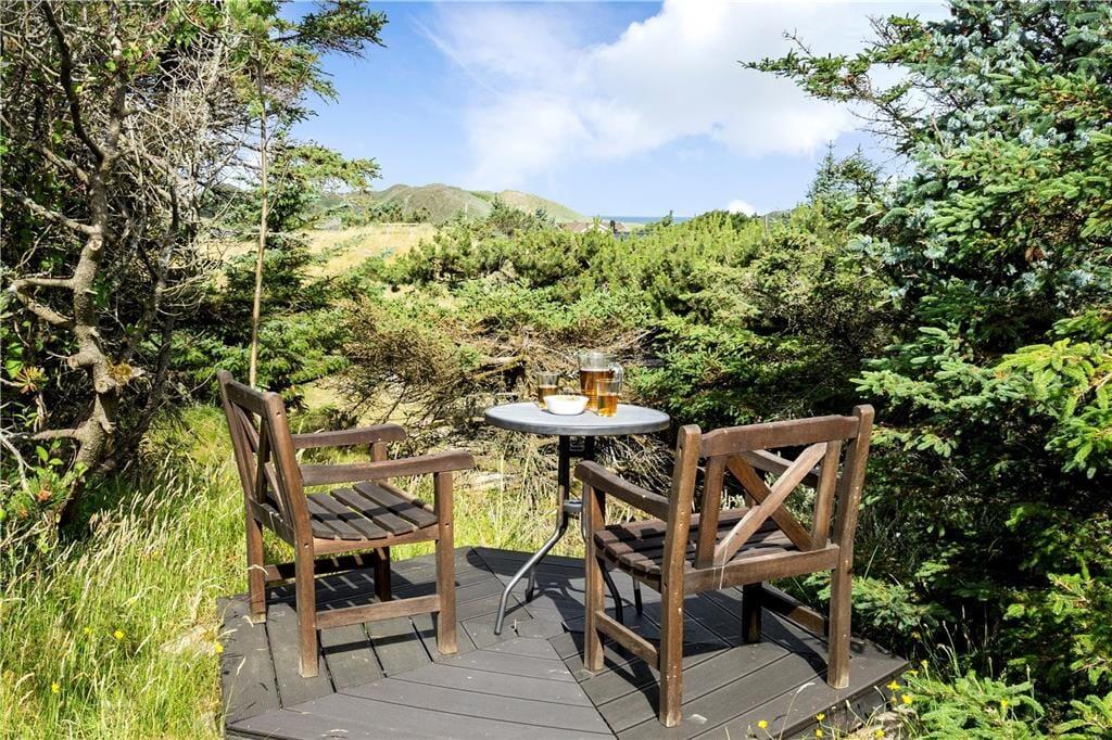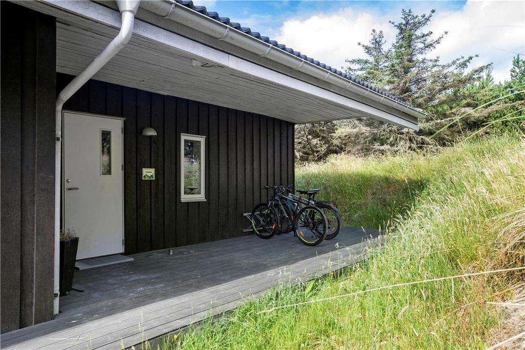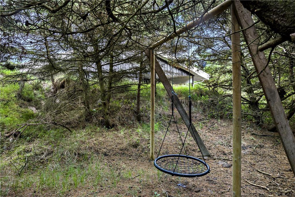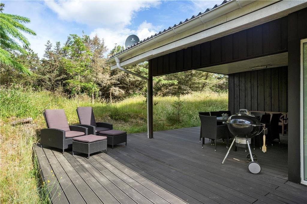 Sommerhuset ligger på en stor naturgrund, omgivet af høje træer som både skærmer for vinden og nysgerrige blikke. På den store terrasse kan man nyde sommerlivet i fulde drag med solbadning og madlavning på grillen, og om aftenen er det hyggeligt med et godt glas vin på den lille ekstra terrasse mellem træerne. Børnene kan benytte gyngen, og har man cykler med, kan de stå godt og beskyttet i cykelstativet på bagsiden af huset.