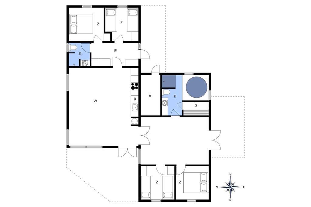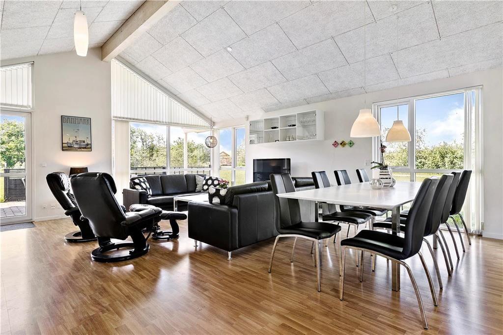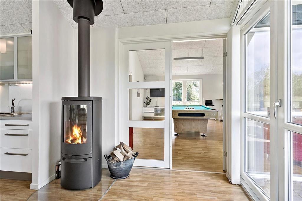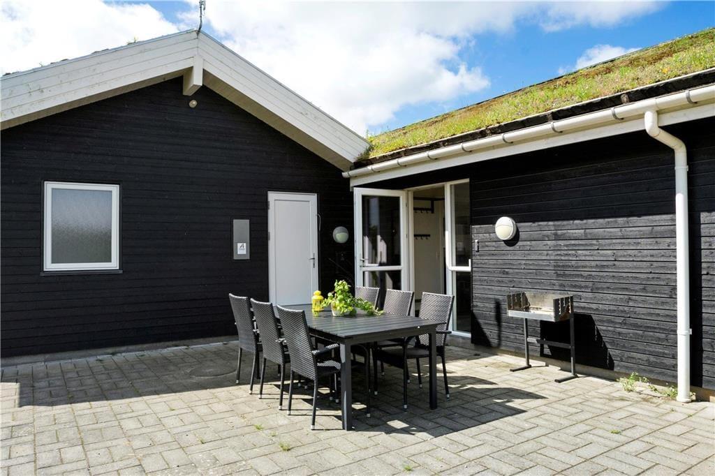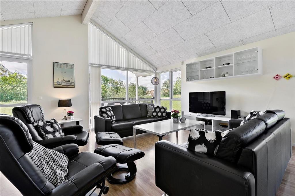 Den klassiske sommerhusstemning bliver slået an lige fra ankomsten, når I ser ejendommens grønne tag og sorte træfacade. Sammenlignet med ældre, danske sommerhuse er der dog skruet op for luksusdetaljerne inden døre, og kvadratmeter er der også flere af, nemlig hele 148 m2. Overalt er der gulvvarme, og planløsningen er gennemtænkt, så der er god plads til alle mand i huset: Fire soveværelser og to badeværelser er fornuftigt fordelt i hver sin ende af ferieboligen, og som supplement er der to madrasser og endda et ekstra TV på hemsen. Centralt ligger et stort opholdsrum med integreret køkkenafdeling, brændeovn og store vinduespartier, der understreger rummets lyse atmosfære. Skal alle fælles hyggestunder ikke tilbringes her, kan I rykke ind i aktivitetsrummet, hvor I kan tage et slag bordtennis eller pool – og trænger I nærmere til tilbagelænet afslapning, kan I nyde livet i saunaen og spabadet i det ene badeværelses store wellnessområde.