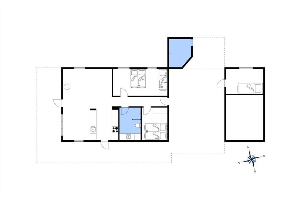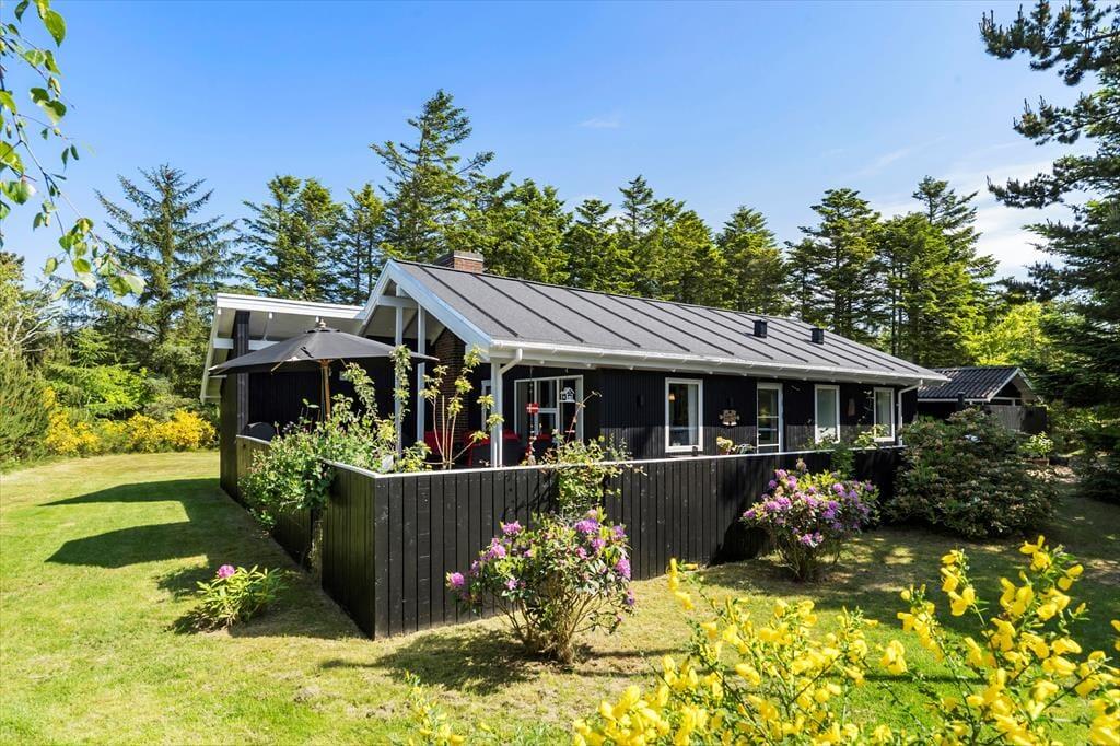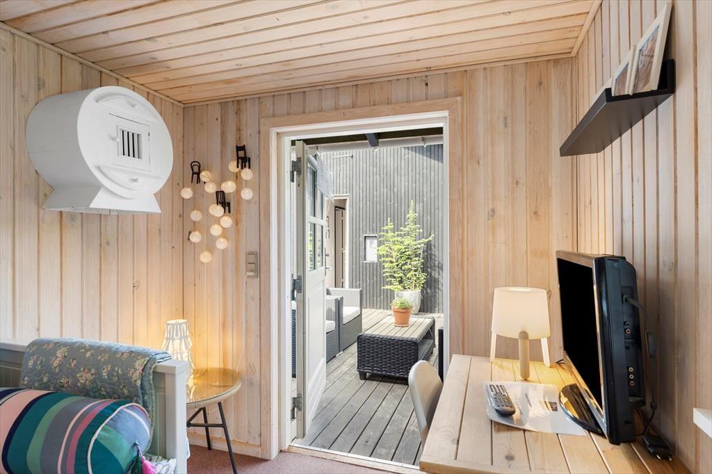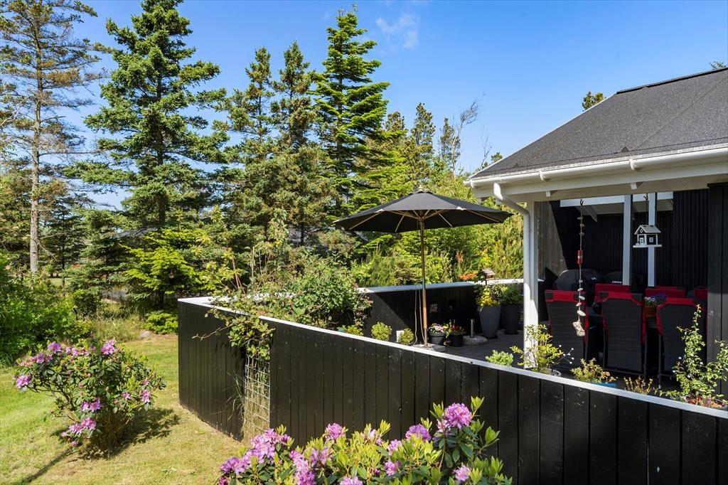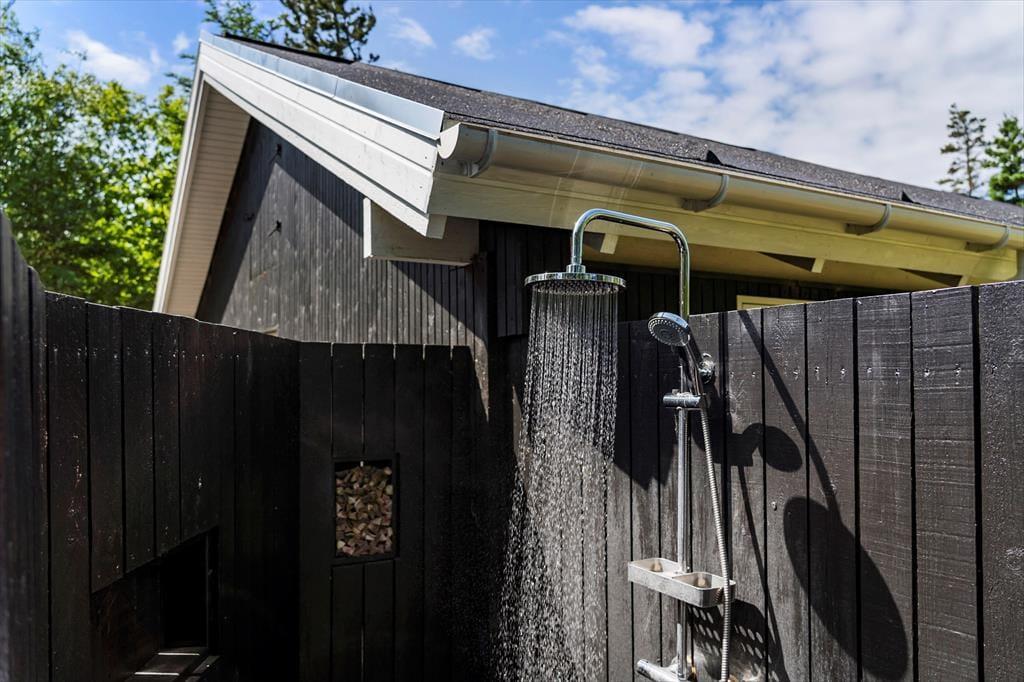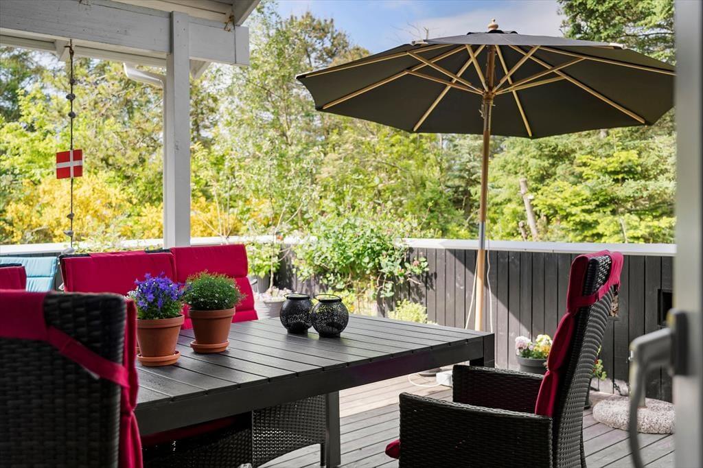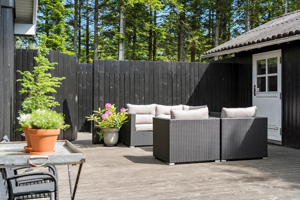I kan glæde jer til at tilbringe masser af timer under åben himmel på den store lukkede terrasse, der omkranser huset. Her er mange gode kroge, hvor I kan sidde og nyde solen eller læse en god krimi i de fredfyldte rammer. Der er endvidere en udebruser i forlængelse af terrassen, hvor I kan tage opfriskende brusebade, når sommersolen bager. En del af terrassen er overdækket, og I kan tænde op i udepejsen, når aftenen falder på.
