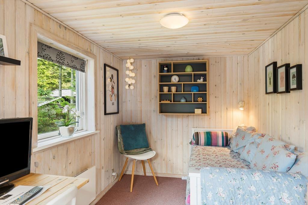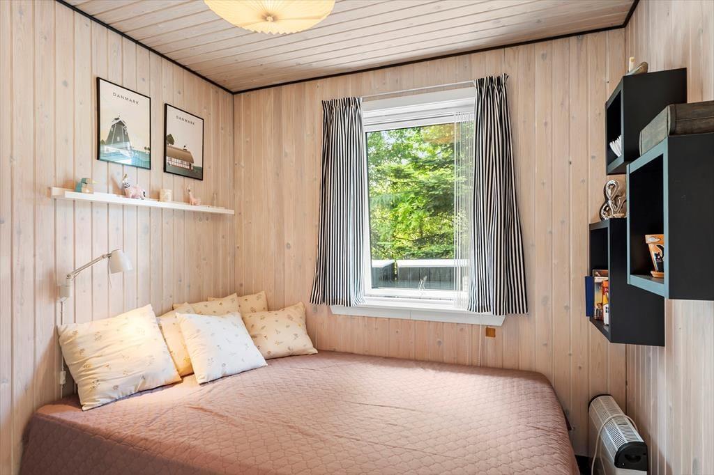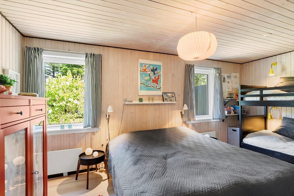 Huset emmer af klassisk sommerhuscharme med sin sortmalede facade og hvide vinduesrammer, der står i flot kontrast til alt det grønne på grunden. Indenfor er der en lys og venlig atmosfære, og det store opholdsrum er et rigtigt ”hjerterum”. Her er der loft til kip, synlige loftsbjælker og et dejligt lysindfald fra de store vinduespartier. Hyggen får optimale betingelser i sofagruppen, og der er naturligvis også en brændeovn til de kølige aftener. Spisebordet er stort, og her får I både plads til puslespillet og aftensmad i familiens skød. Huset indeholder to værelser – et stort værelse med dobbeltseng og køjesenge samt endnu et værelse med dobbeltseng. Herudover er der et badeværelse. Derfor anbefales huset til maks. 4 voksne og 2 børn.