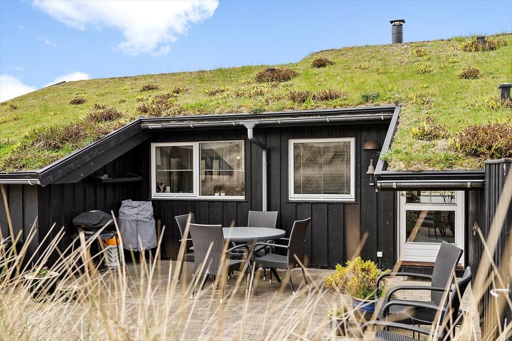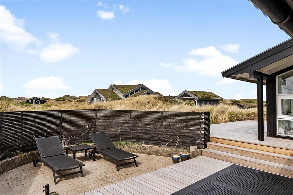 Den store klitgrund med græs, sand og marehalm ligger lidt oppe, og man har derfor en dejlig udsigt over landskabet og Vesterhavet fra de høje klitter. Der er terrasser på begge sider af sommerhuset, så det er muligt at flytte rundt i løbet af dagen for at finde læ og udnytte alle soltimer.