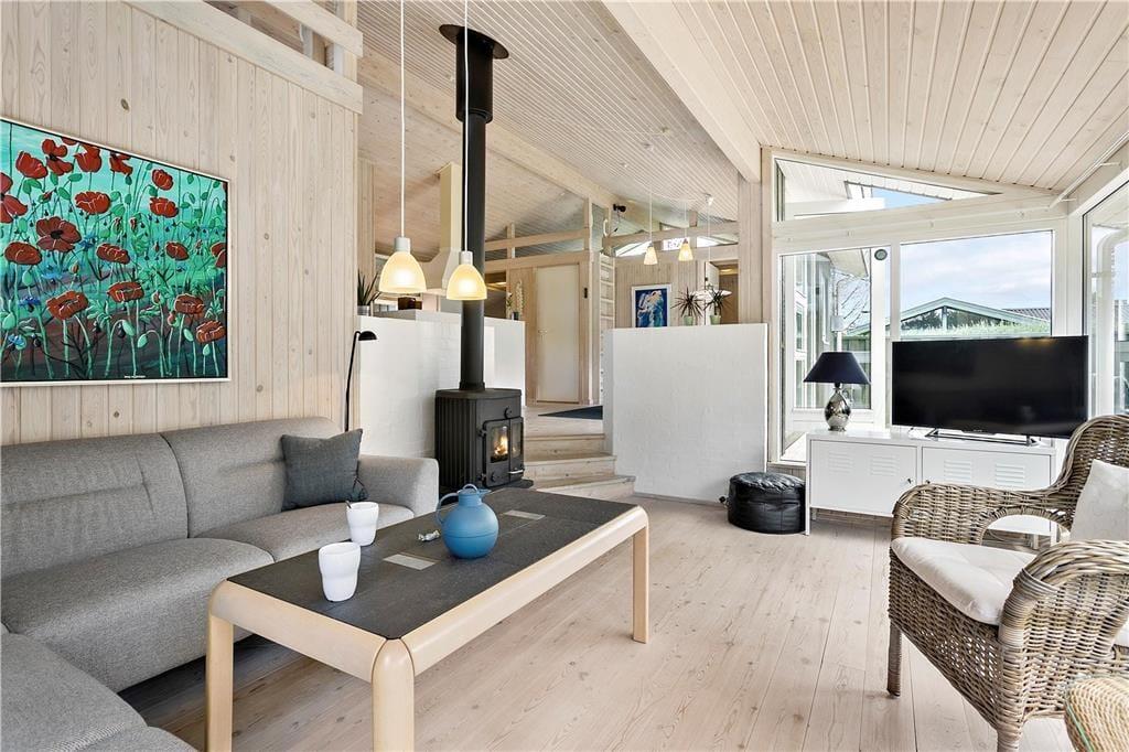Naturen venter ikke bare udenfor døren, men bliver ligefrem inviteret ind i stuen takket være de store vinduespartier, der giver udsigt til de grønne omgivelser. Dyrelivet er rigt i området, så der er nærmest garanti for at se rådyr, der tripper forbi mellem fyrretræerne, mens I sidder med en god kop kaffe i sofaen nær brændeovnen. Stuen ligger en smule sænket, men stadig i åben forbindelse med et dejligt køkken-alrum, så alt i alt er der masser af plads til at hygge sig sammen her i den lyse og velindrettede opholdsafdeling. Derudover kan I se frem til en god nats søvn på sommerhusets tre soveværelser, og badeværelset vil også vække begejstring, for det er nemlig renoveret i 2022!