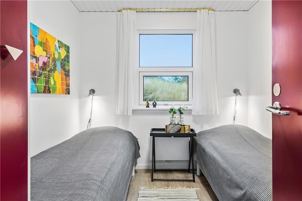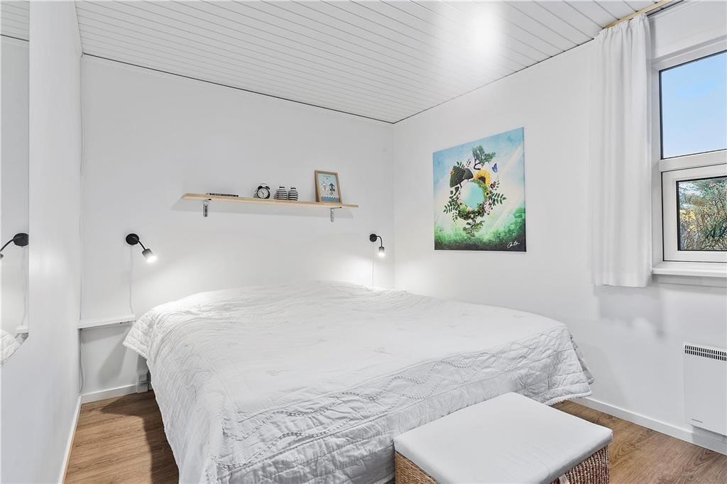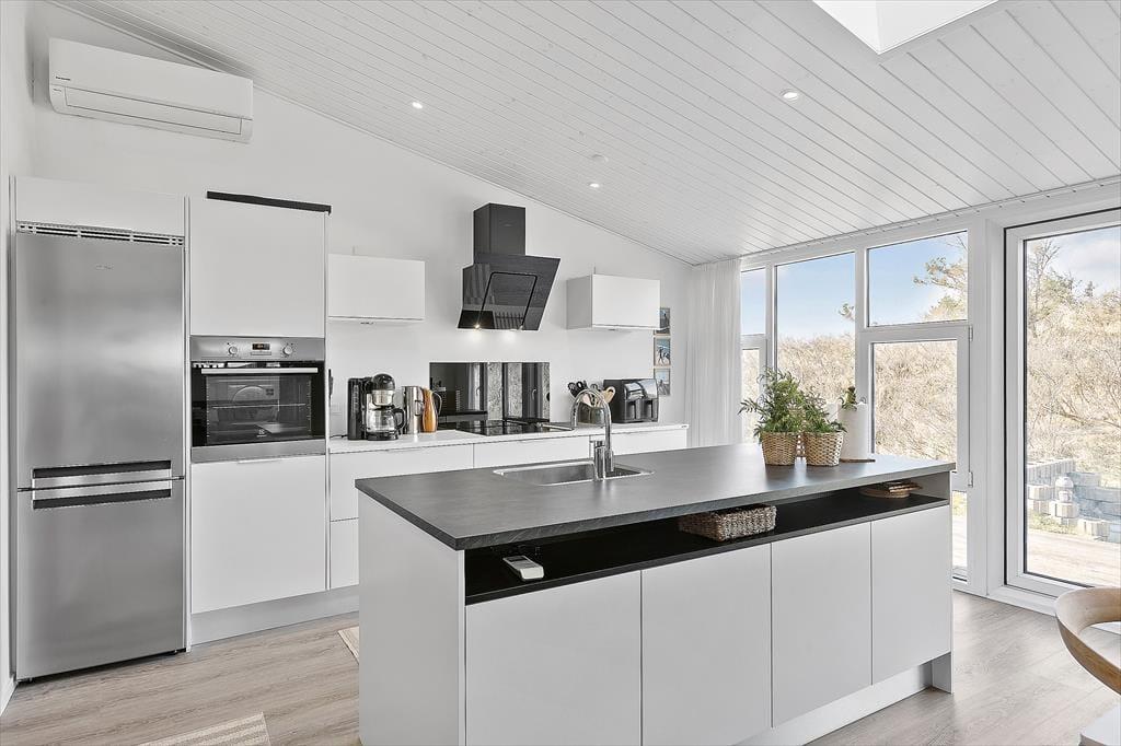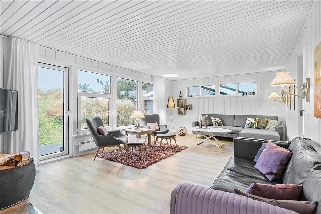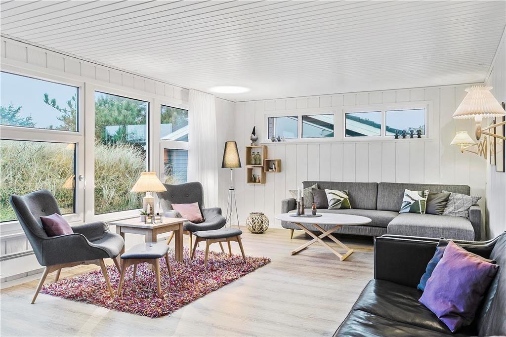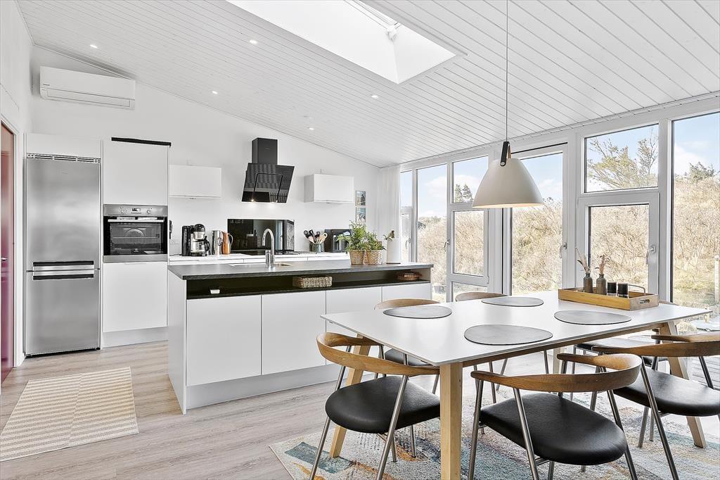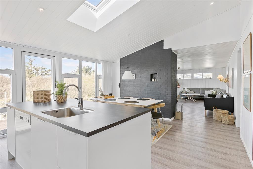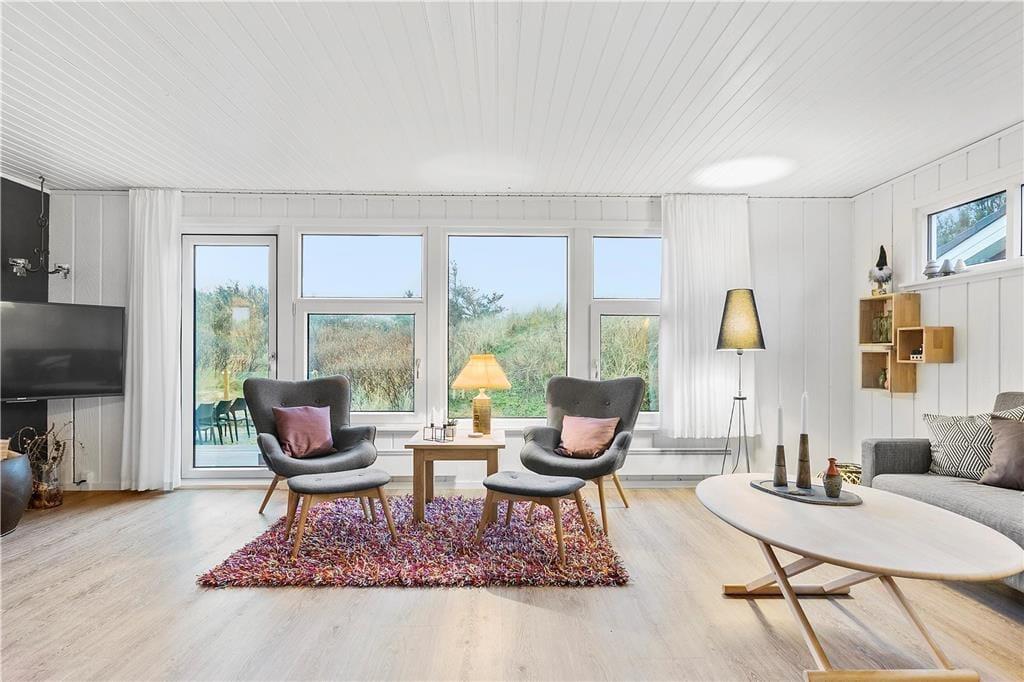 Sommerhuset har ligget i det smukke nordjyske kystlandskab siden 1978, og så sent som i 2019 fik det en gevaldig opgradering, da det blev renoveret. Resultatet er lyst og indbydende, for rummene prydes af stilrent møblement og charmerende hyggedetaljer – og de store vinduers udsigt til marehalm og krogede fyrretræer passer skønt til både farvesætningen og den nordiske indretningsstil. Tre soveværelser og et badeværelse med gulvvarme, vaskesøjle og bruseniche er alle gode og reelle rum. Flest kvadratmeter er dog dedikeret til den vestvendte opholdsafdeling, der består af et rummeligt køkken-alrum og en tilstødende flot stue. Takket være den åbne forbindelse kan I nyde hinandens selskab, selvom der er gang i sofahygge og madlavning på samme tid, og I har stadig fornemmelsen af at kunne finde en fredelig krog nær indbygningspejsen, hvis der for eksempel skal være ro til at læse.