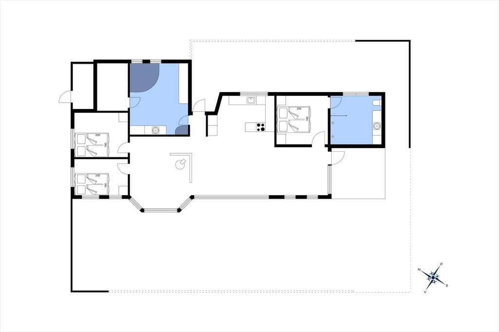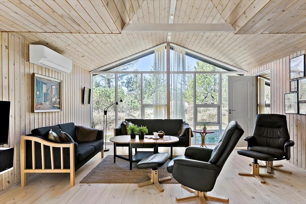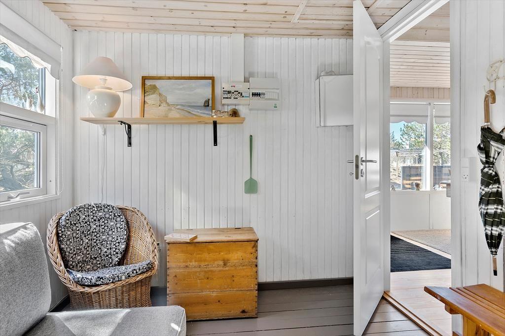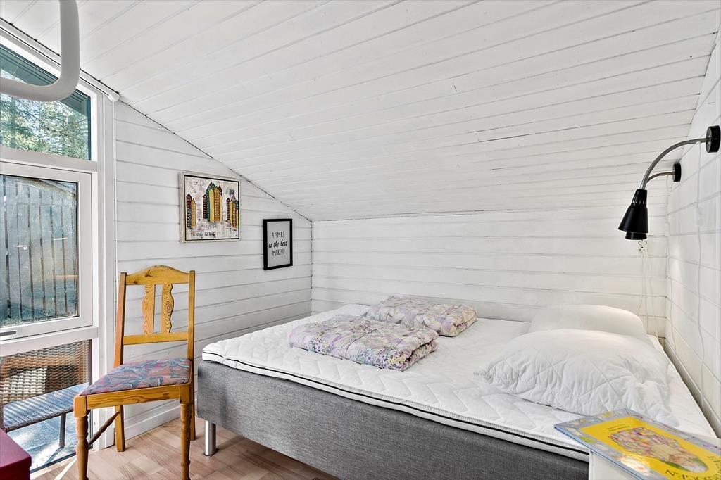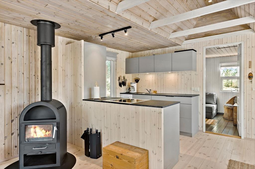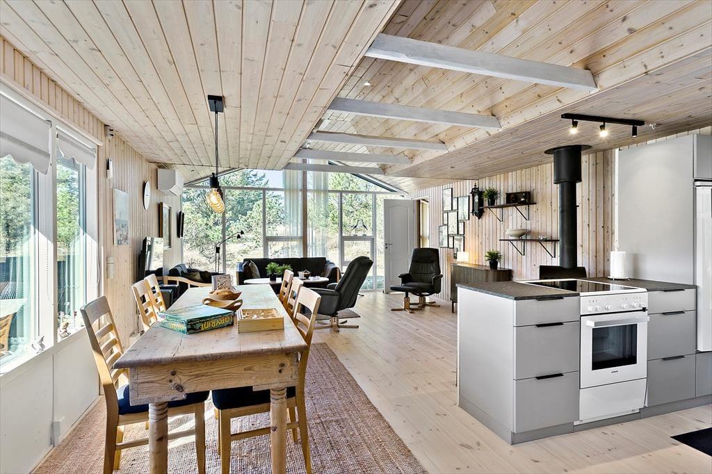 Brændeovnen og de lyse trælister på væggene er nogle af de klassiske charmetræk her i sommerhuset, som har en fornuftig planløsning til fem personer. Den hyggespredende brændeovn står i stuen, som desuden er udstyret med store vinduespartier, der inviterer dagslyset indenfor og giver udsigt til naturgrunden. Som endnu en rar detalje er der åben forbindelse til køkkenet, så når der skal laves mad eller vaskes op, kan I samtidig hyggesnakke og nyde at være tæt på familien. Planløsningen byder i øvrigt på tre soveværelser samt et badeværelse med bruser og gulvvarme.