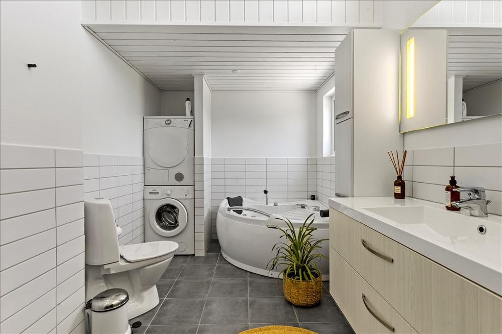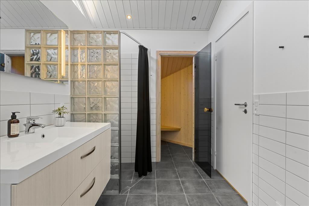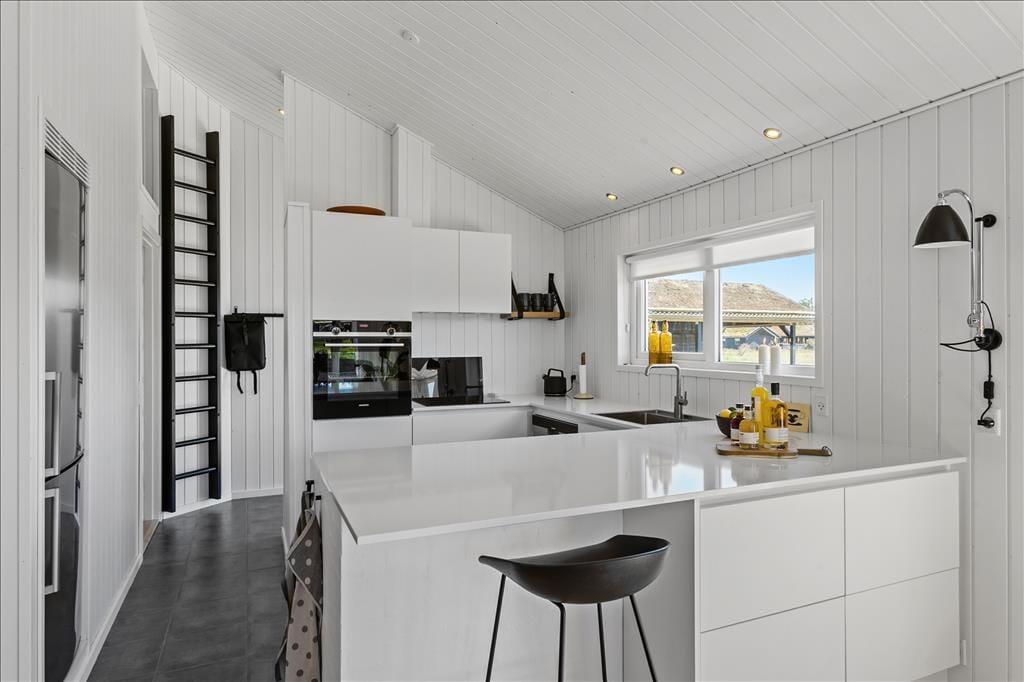 Indenfor bliver I mødt af en hyggelig stue med en dejlig brændeovn, som skaber en varm og indbydende stemning på kolde dage. Her kan I samles om et brætspil, en god bog eller bare nyde roen efter en aktiv dag. Det åbne køkkenalrum er smagfuldt indrettet og udstyret med alt, hvad I behøver for at lave lækre måltider. Samtidig er der rigeligt med plads til at dele madlavningen med familien eller vennerne. Badeværelset er et sandt wellness-område, hvor I kan slappe af i både spabad og sauna – den perfekte måde at afslutte en lang dag på.