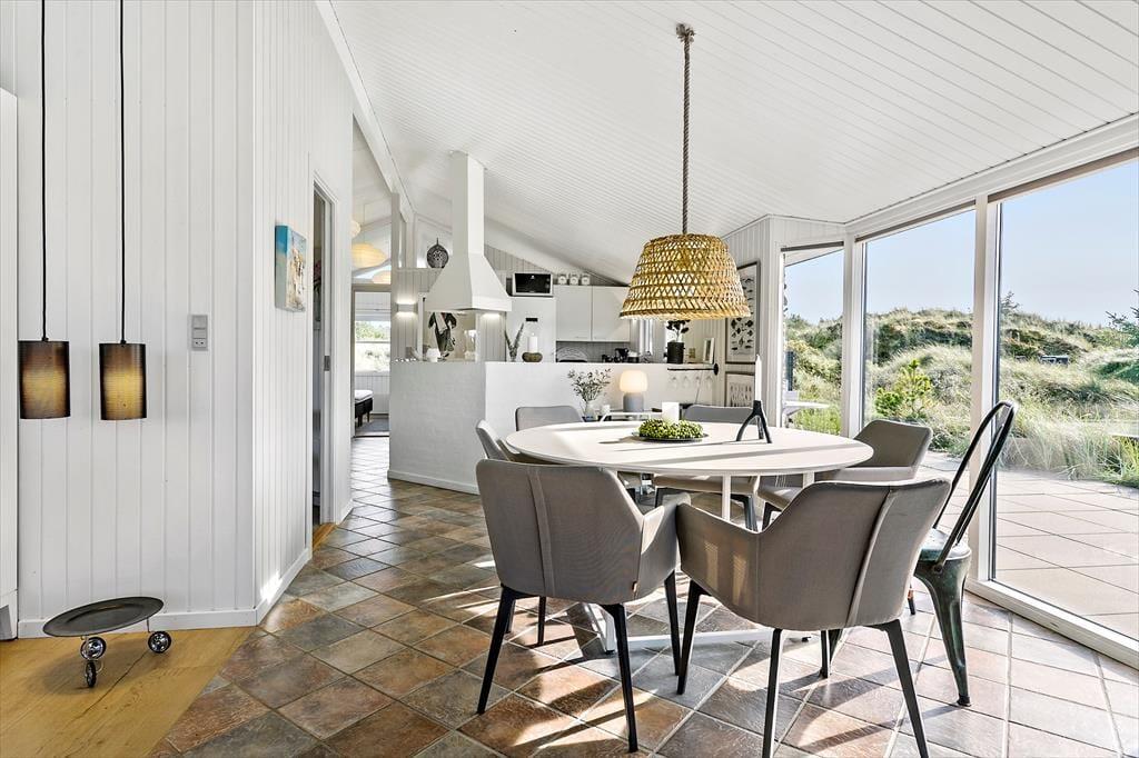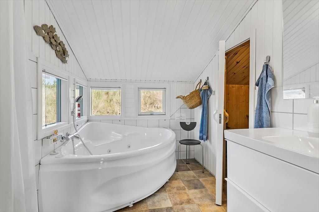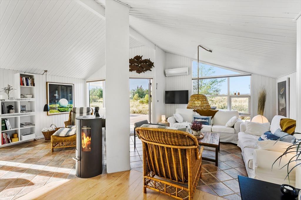 Sommerhuset ligger i Saltum, hvor naturen virkelig er i fokus. Kun en kort køretur fra huset finder du den smukke Vesterhavskyst, hvor lange gåture langs stranden og afslapning på de bløde sanddyner er en stor del af ferieoplevelsen. Du er også tæt på Blokhus, som byder på en charmerende bymidte med gode spisesteder, butikker og aktiviteter for hele familien. Hvis du er til action, kan du hurtigt komme til Fårup Sommerland, hvor der venter forlystelser for både store og små. Dette sommerhus er ideelt til dem, der ønsker både afslapning og eventyr i naturskønne omgivelser.