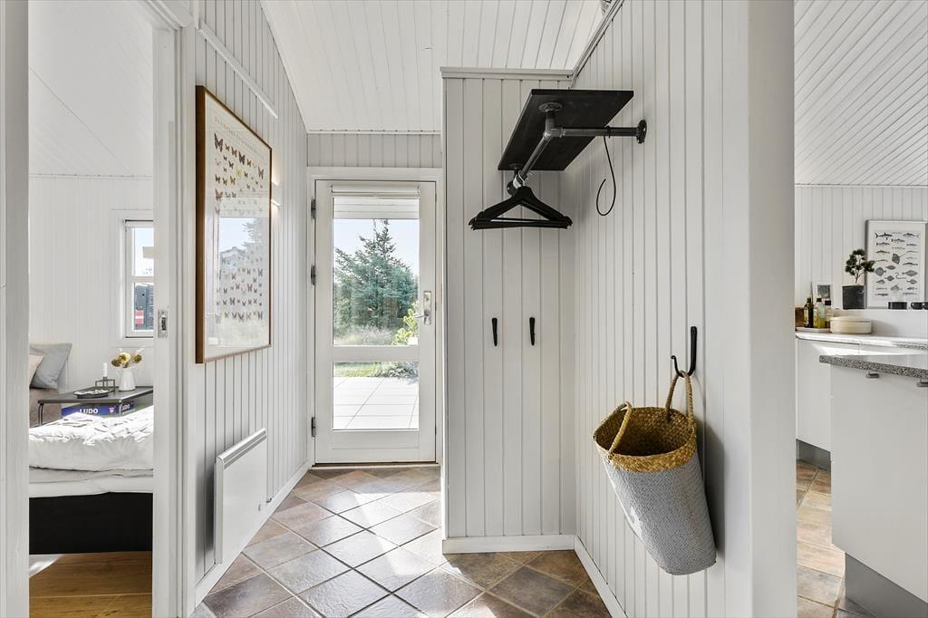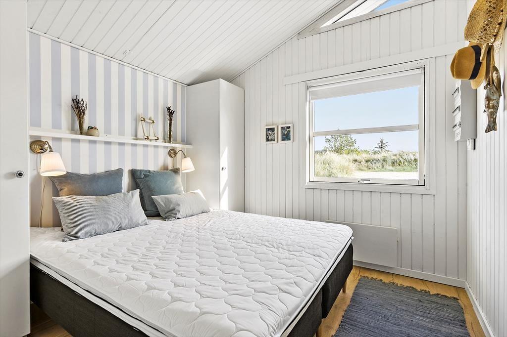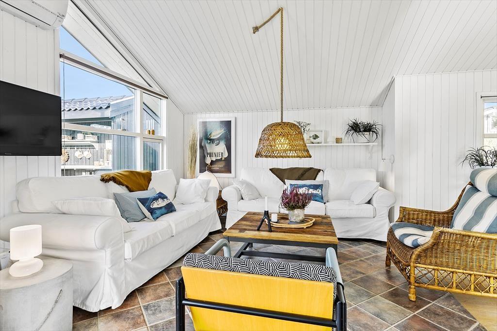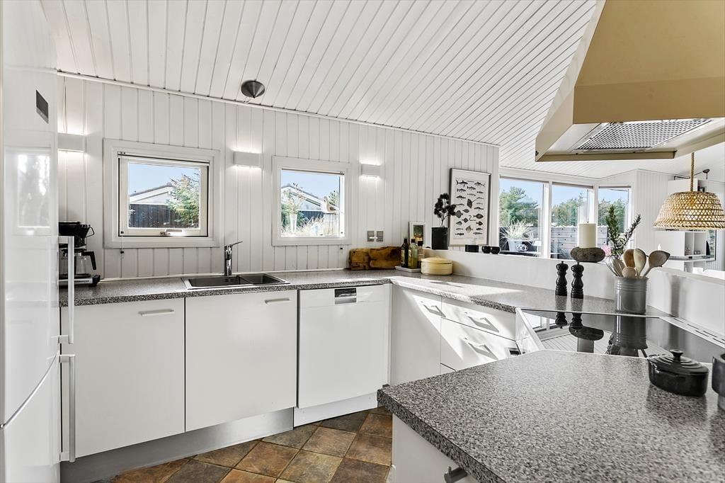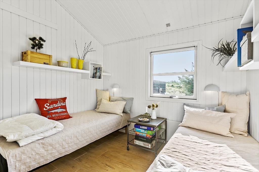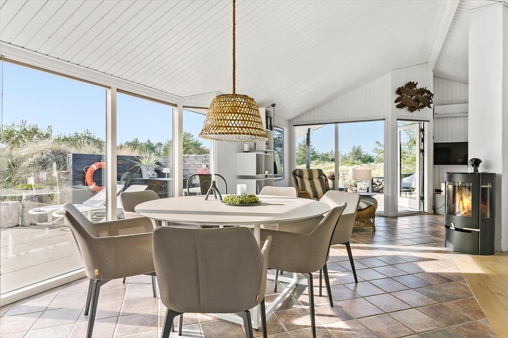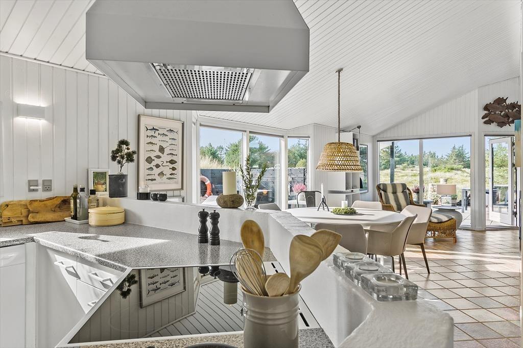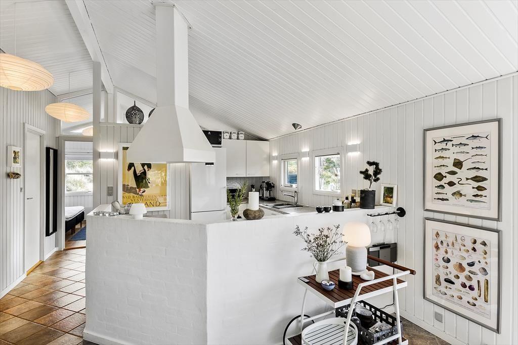 Indenfor i sommerhuset møder du en indretning, der både er funktionel og indbydende. Det åbne køkken-alrum er husets naturlige samlingspunkt, hvor lys strømmer ind fra de store vinduer, og brændeovnens varme skaber en behagelig atmosfære. Her kan du samle familien omkring middagen eller hygge jer med brætspil, mens mørket falder på udenfor. Huset har desuden et flot badeværelse, hvor du kan nyde et afslappende spabad eller tage en opkvikkende tur i saunaen, der giver en ekstra dimension til feriens velvære. Hele sommerhuset oser af sjæl og charme, hvilket skaber en helt særlig atmosfære, som du ikke vil slippe.