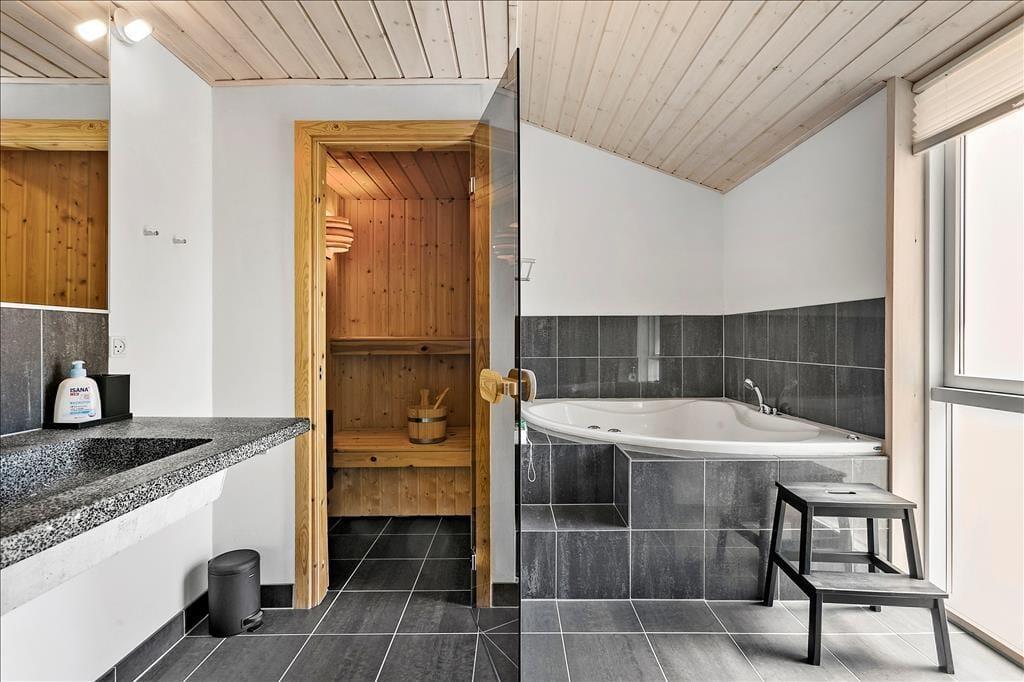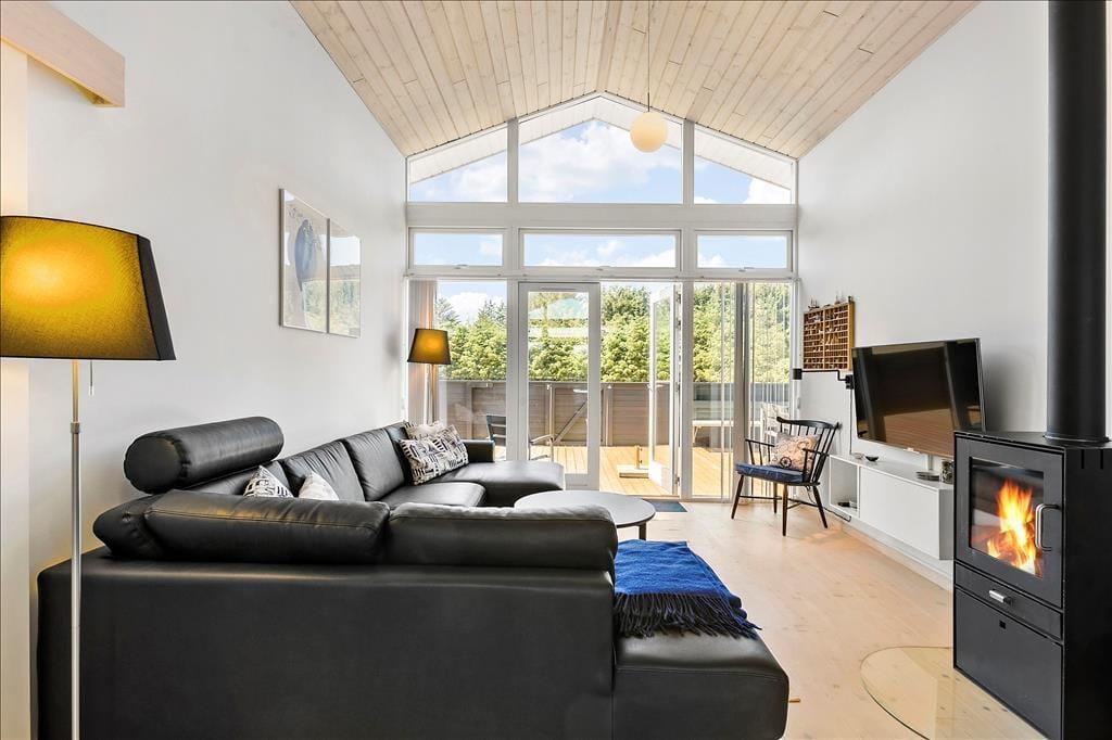 Indenfor bydes du velkommen af et åbent køkkenalrum, hvor du kan tilbringe mange hyggelige stunder med dine nærmeste. Med en rummelig og indbydende stue samt højt til loftet får du en følelse af lys og luft, hvor solen virkelig kan strømme ind gennem de store vinduer. Det er det perfekte sted at samles om en god middag, spille brætspil eller blot slappe af foran brændeovnen, der skaber en ekstra hygge på de kølige dage. Et flot badeværelse med både spabad og sauna inviterer til wellness og afslapning, og for de yngre familiemedlemmer er hemsen den perfekte legested.