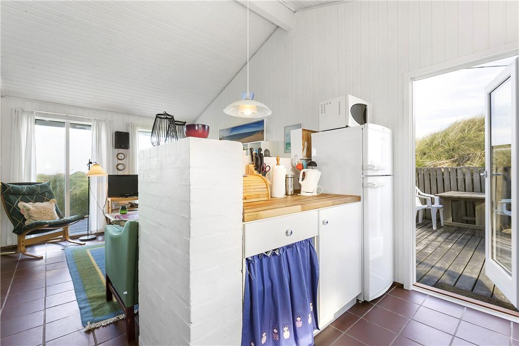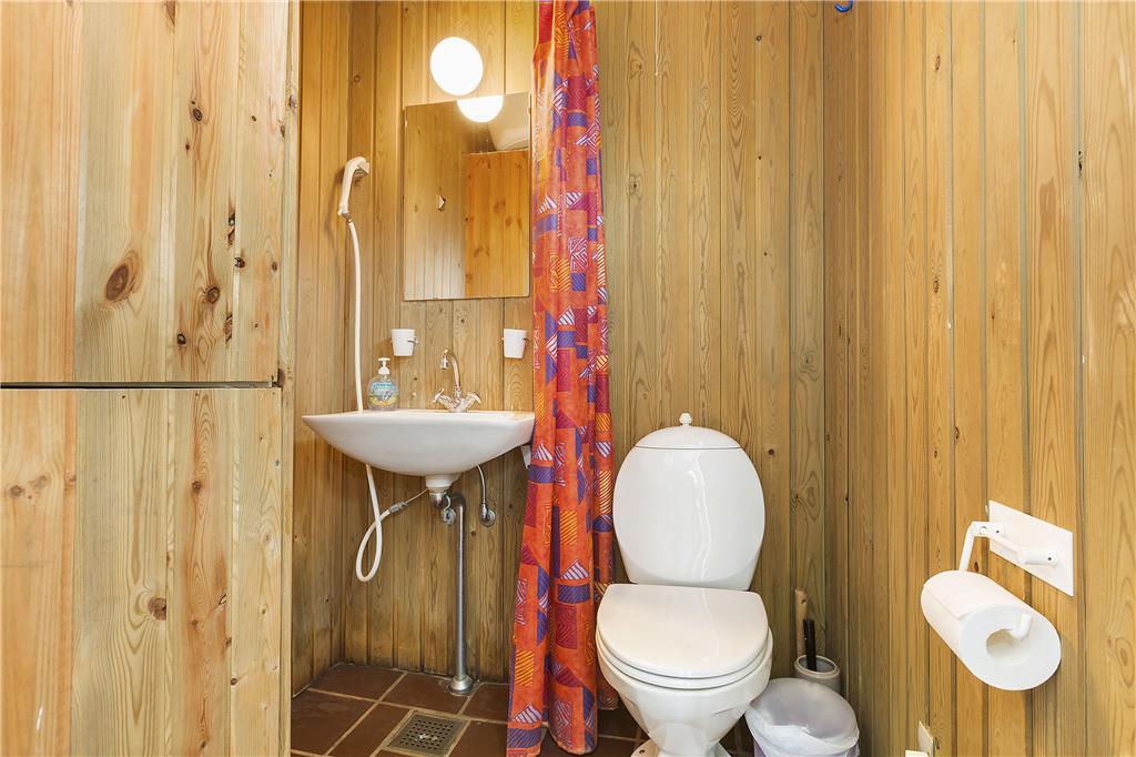 Når du træder ind i sommerhuset, bliver du mødt af en lys og indbydende stue, der er et oplagt samlingspunkt for hele familien. Den store brændeovn giver både varme og hygge på de kølige aftener, og du vil hurtigt få en fornemmelse af ro og afslapning. Køkkenet er veludstyret og ideelt til fælles madlavning, og det er her, du kan samles omkring bordet for at nyde dagens måltider. Fra køkkenet er der direkte adgang til den store terrasse, som gør det nemt at nyde udelivet lige udenfor døren. Det er et hus, der emmer af hjemlig komfort og varme.