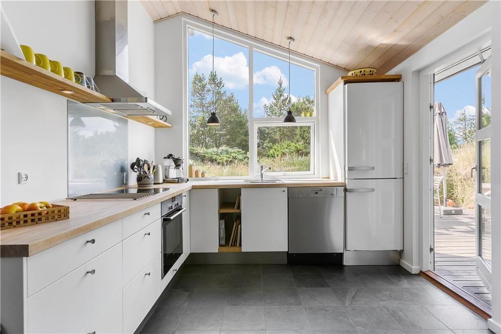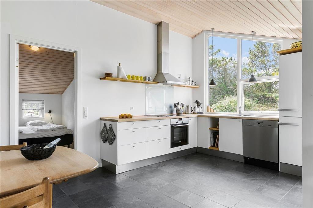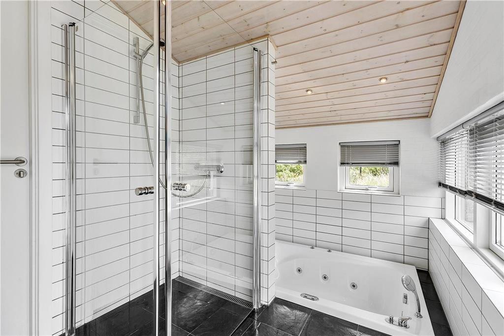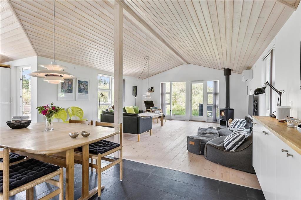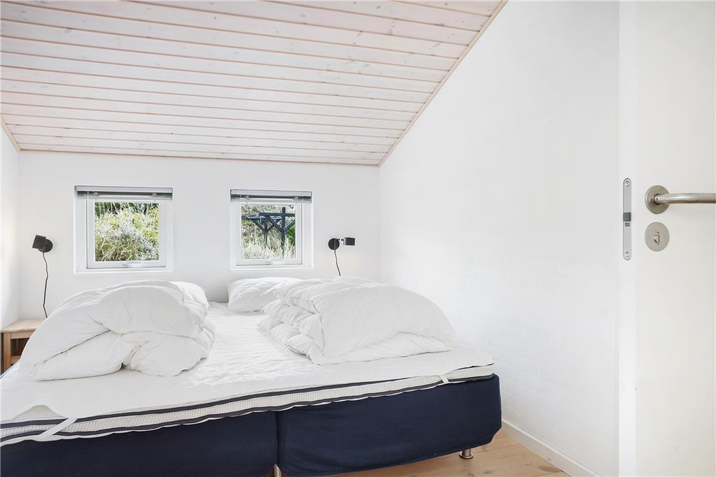 Når du træder ind i sommerhuset, mødes du af en lys og åben opholdsafdeling, hvor det høje loft og de store vinduespartier giver et fantastisk lysindfald. Stuen indbyder til hyggelige stunder foran brændeovnen, hvor du kan læse en god bog eller bare nyde stilheden. Det moderne køkken er både funktionelt og rummeligt, hvilket gør madlavningen til en fornøjelse. Her kan du samle hele familien og forberede lækre måltider, som nemt kan nydes både inde i stuen eller udenfor på den store terrasse. Det smukke badeværelse med et nedsunket spabad giver den perfekte mulighed for at forkæle sig selv og slappe af efter en aktiv dag.